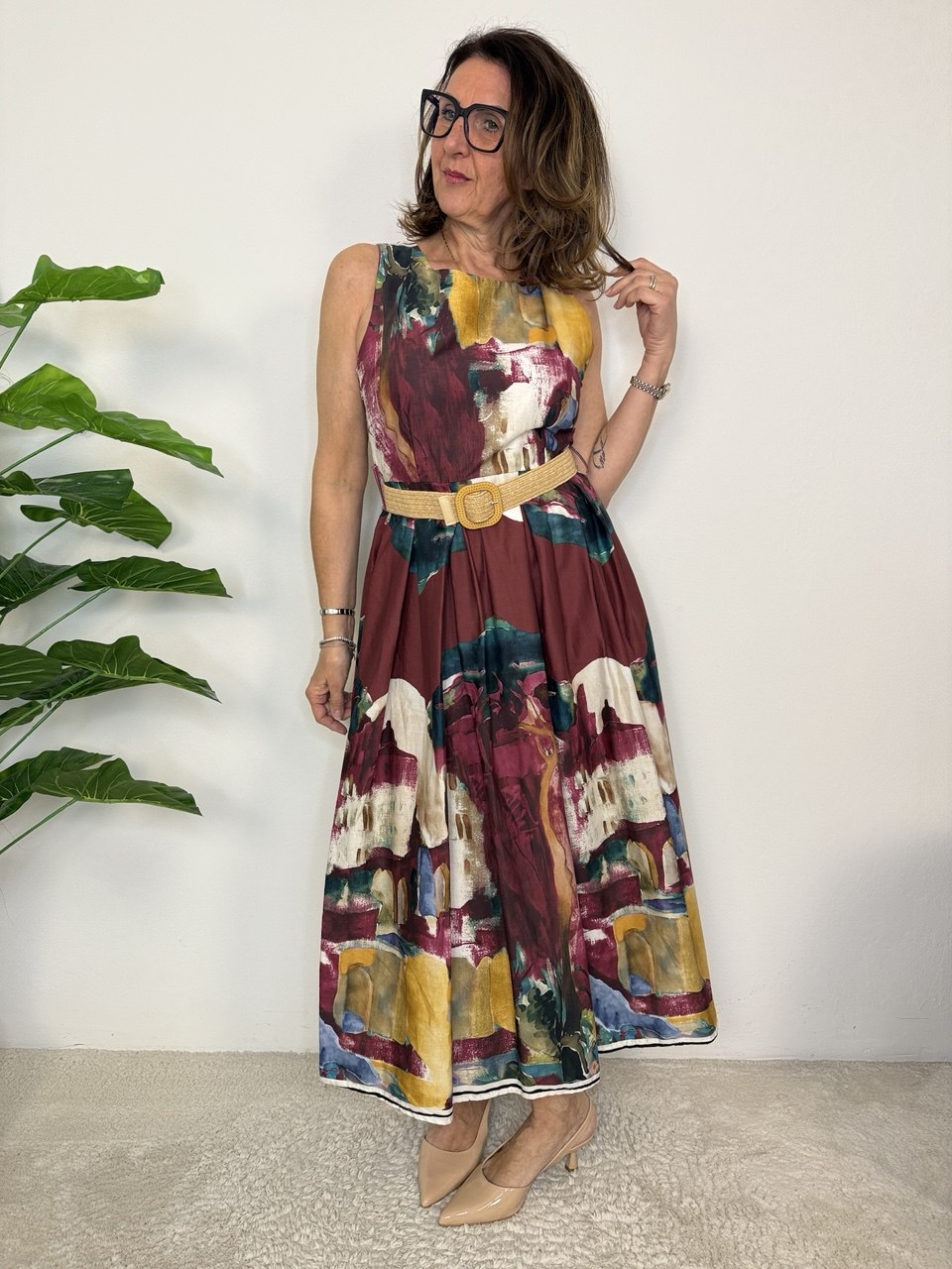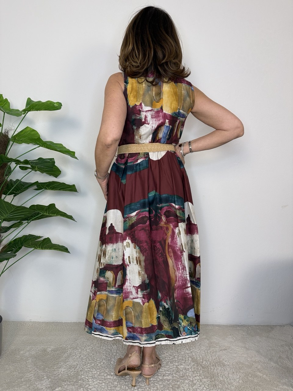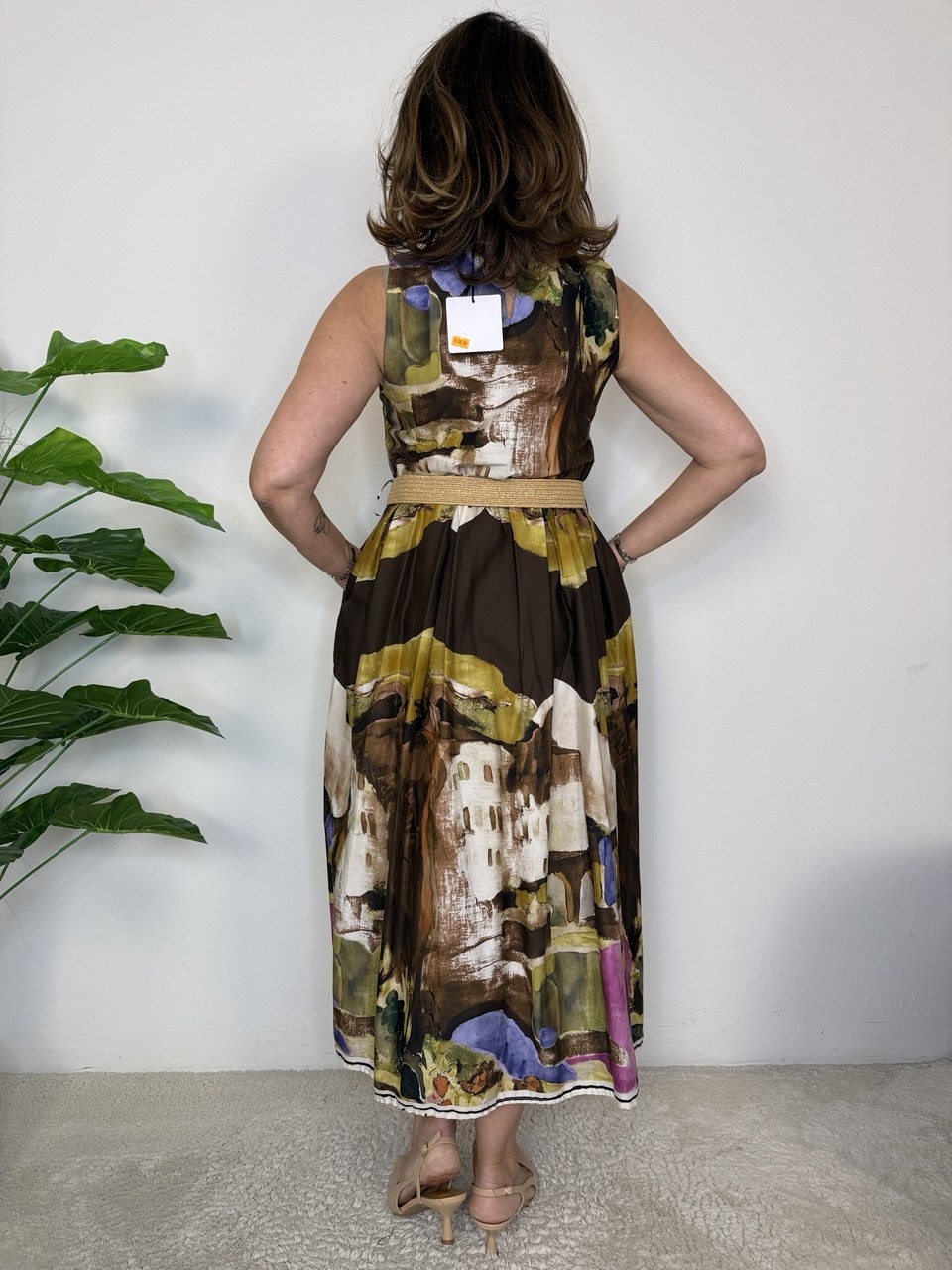 Abito lungo in tessuto cotone a spalla larga, tagliato in vita, elastico nella parte posteriore e pinces solo sul davanti, presenta tasche, vestibilità dalla taglia 42 alla 46