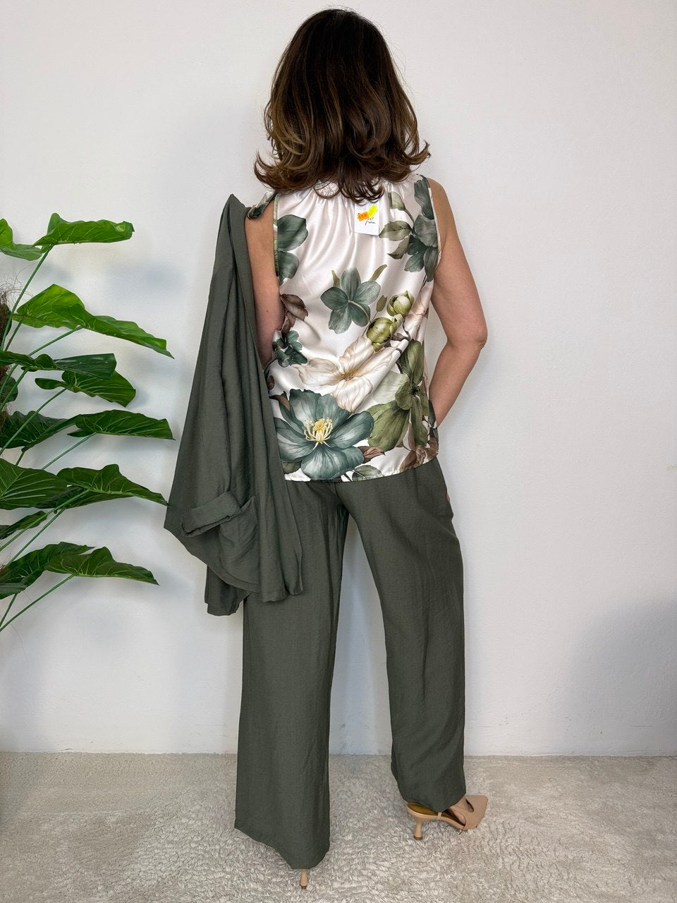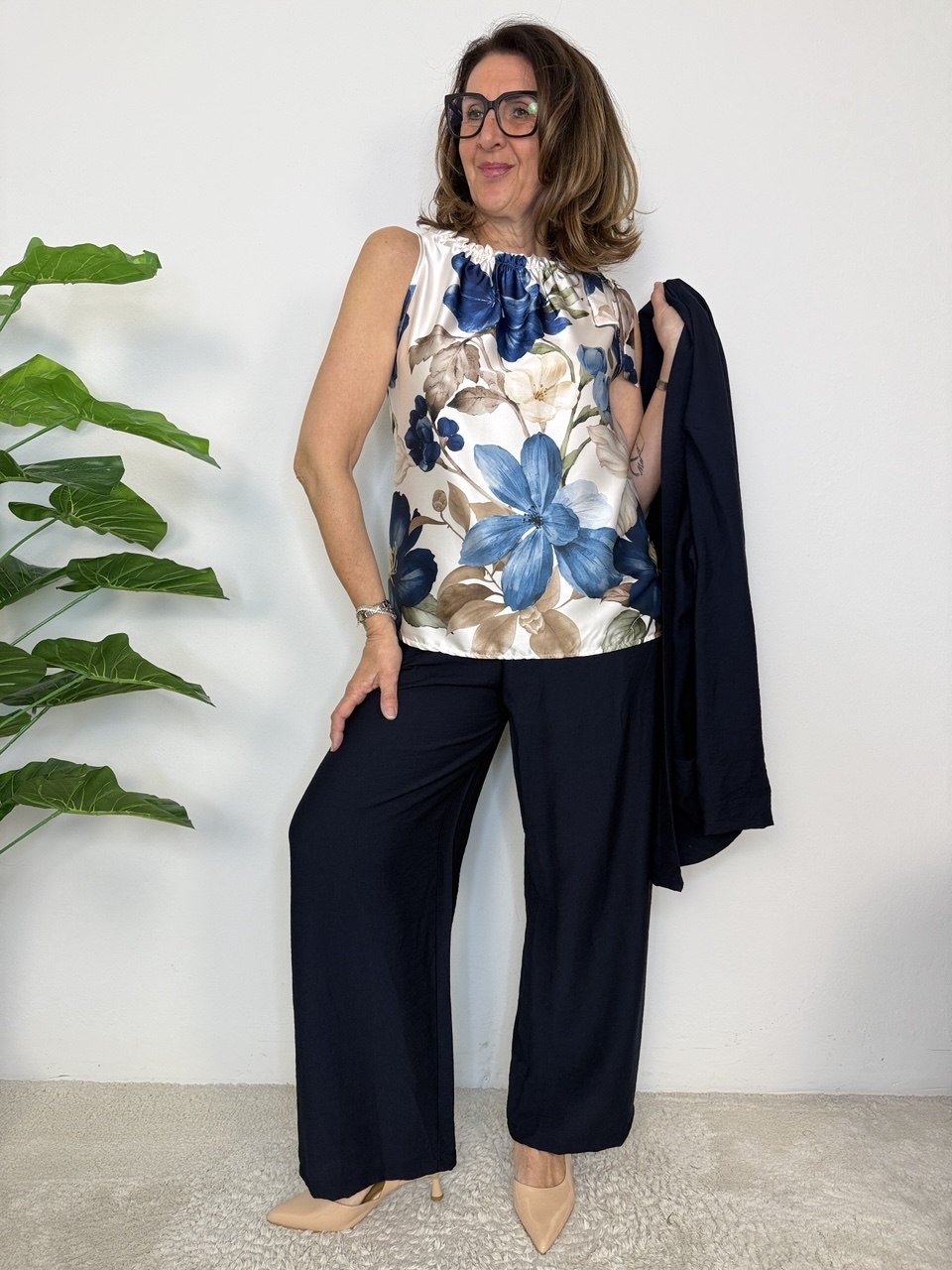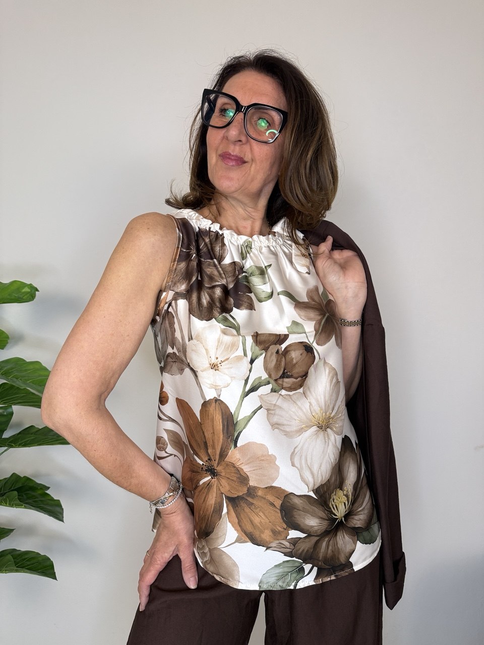 Satin-effect tank top, elastic and frills on the neckline, non-removable decorative tie on the right side, boxy cut, soft fit from size 42 to 46