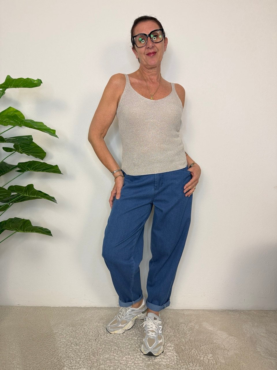 Shimmering stretch viscose yarn tank top, side slits, in micro openwork knit, low cut both front and back, fits sizes 42 to 46