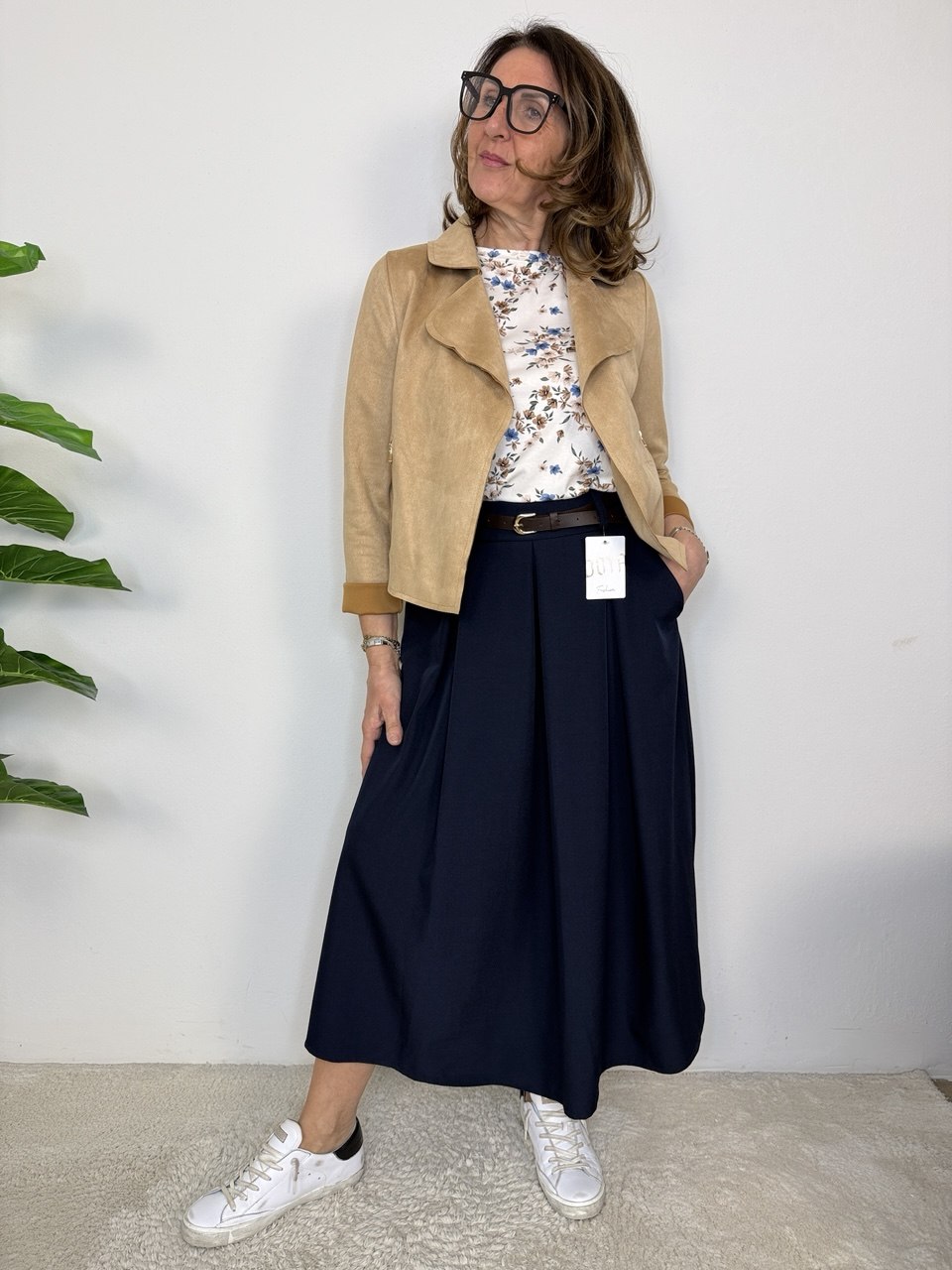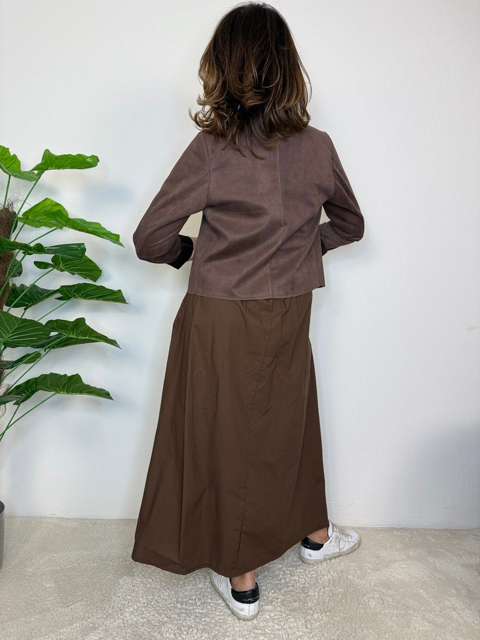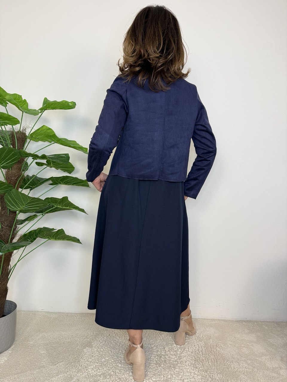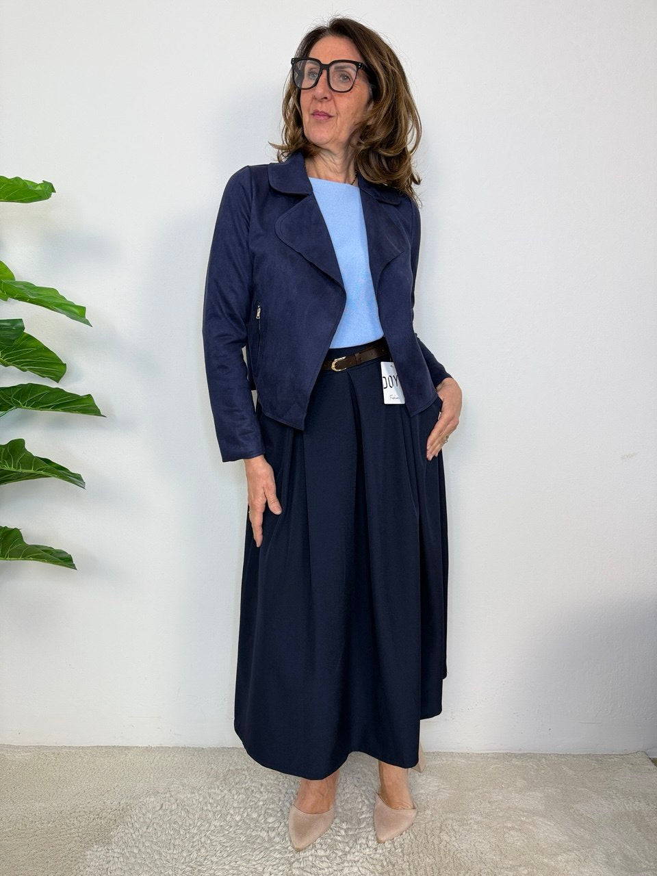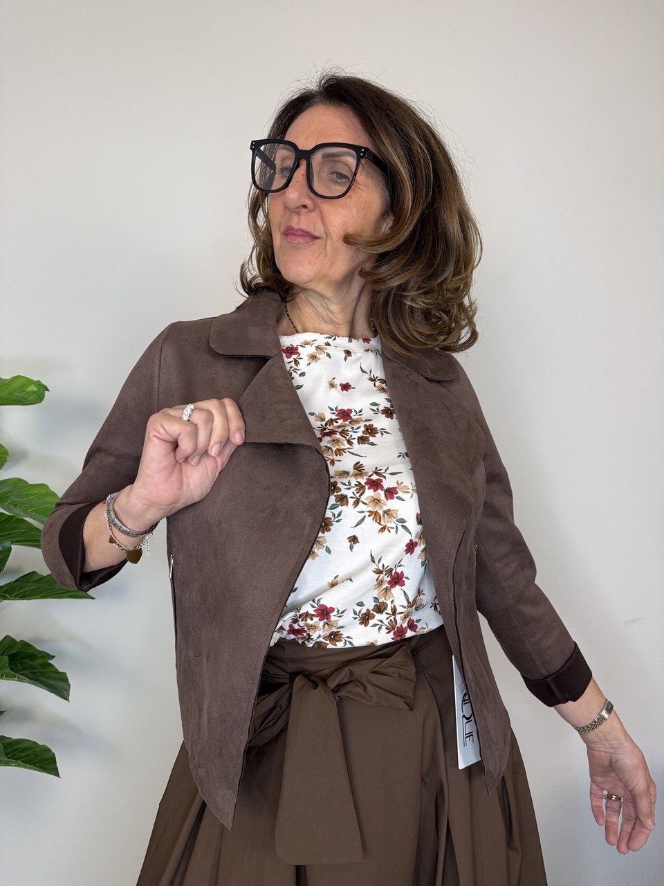 Unlined soft, stretchy eco-suede jacket, sport collar, decorative zippers, no pockets, fits sizes 42 to 46