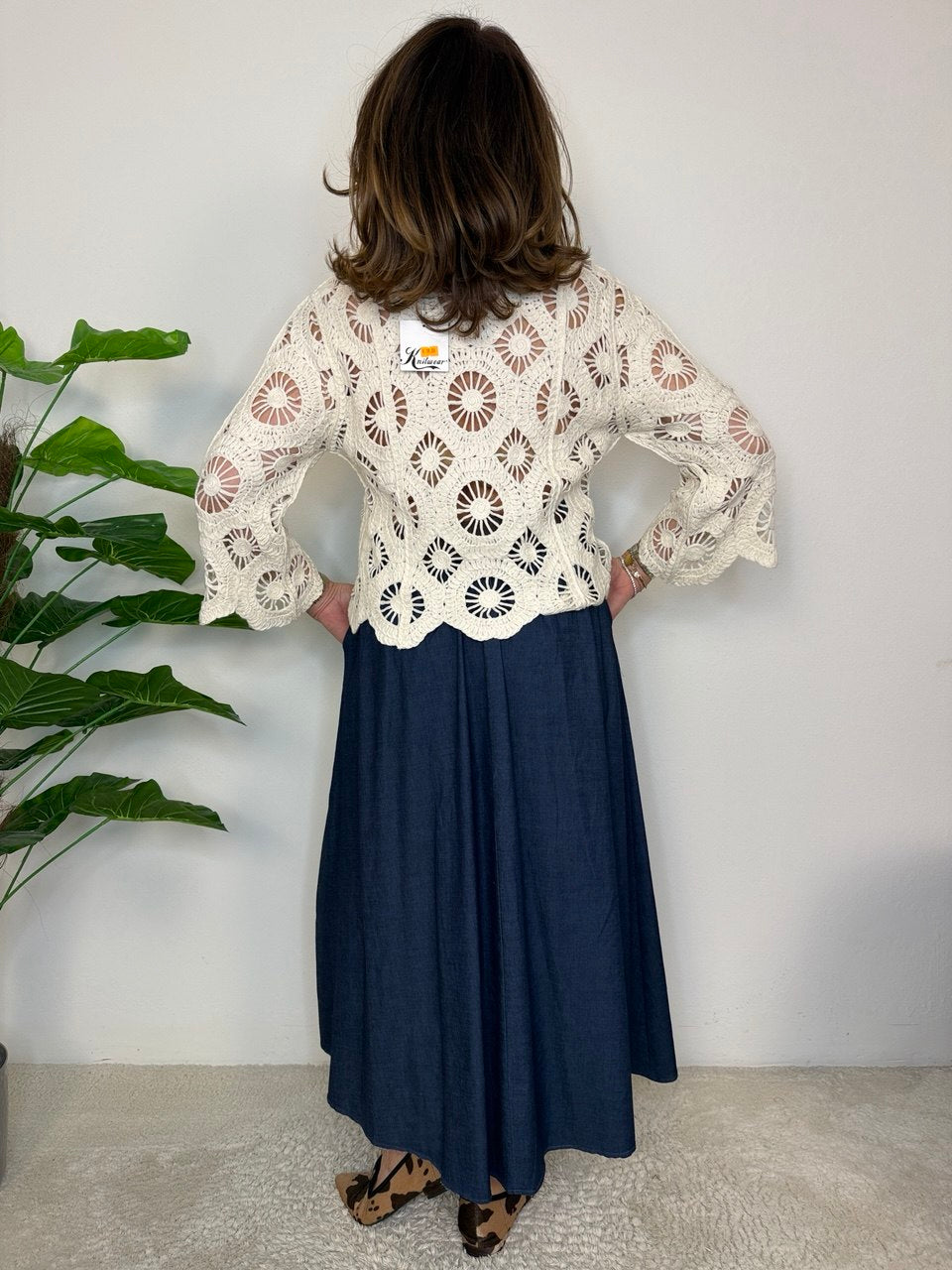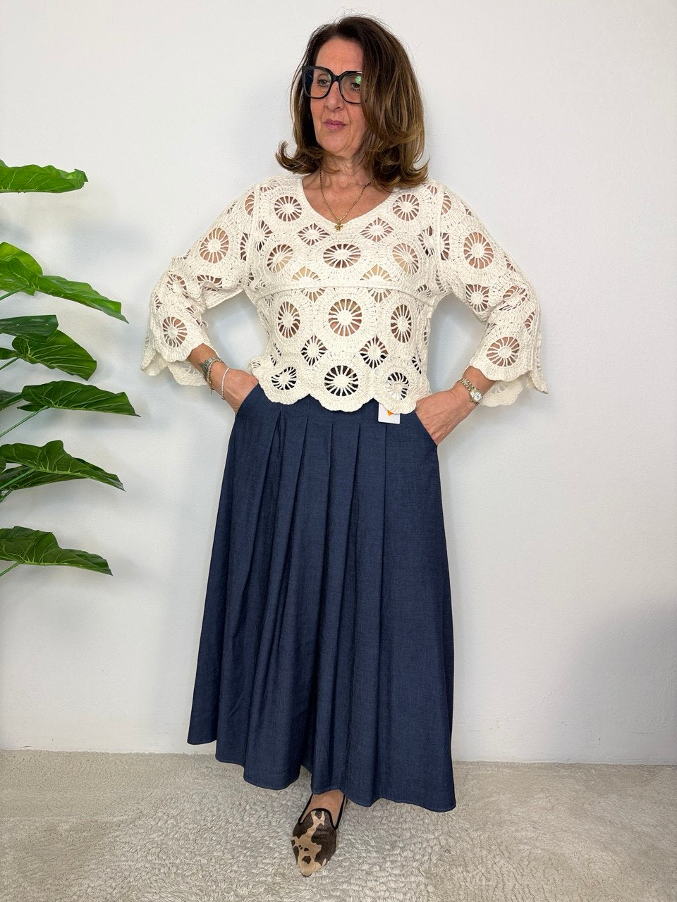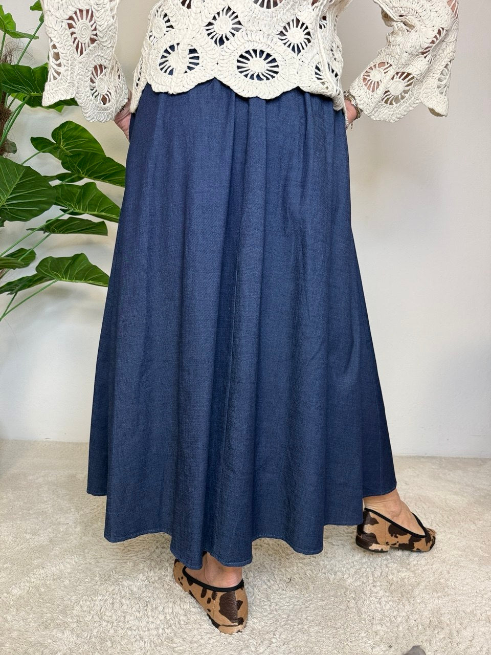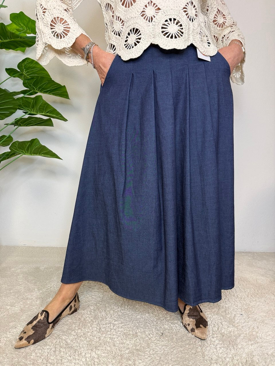 Gonna in jeans di misto cotone elasticizzato, baschina sul davanti, elastico nella parte posteriore, tasche alla francese, dettaglio sul davanti 5 pinces che abbelliscono la gonna con questi dettagli molto particolari, vestibilità dalla taglia 42 alla 46 morbida