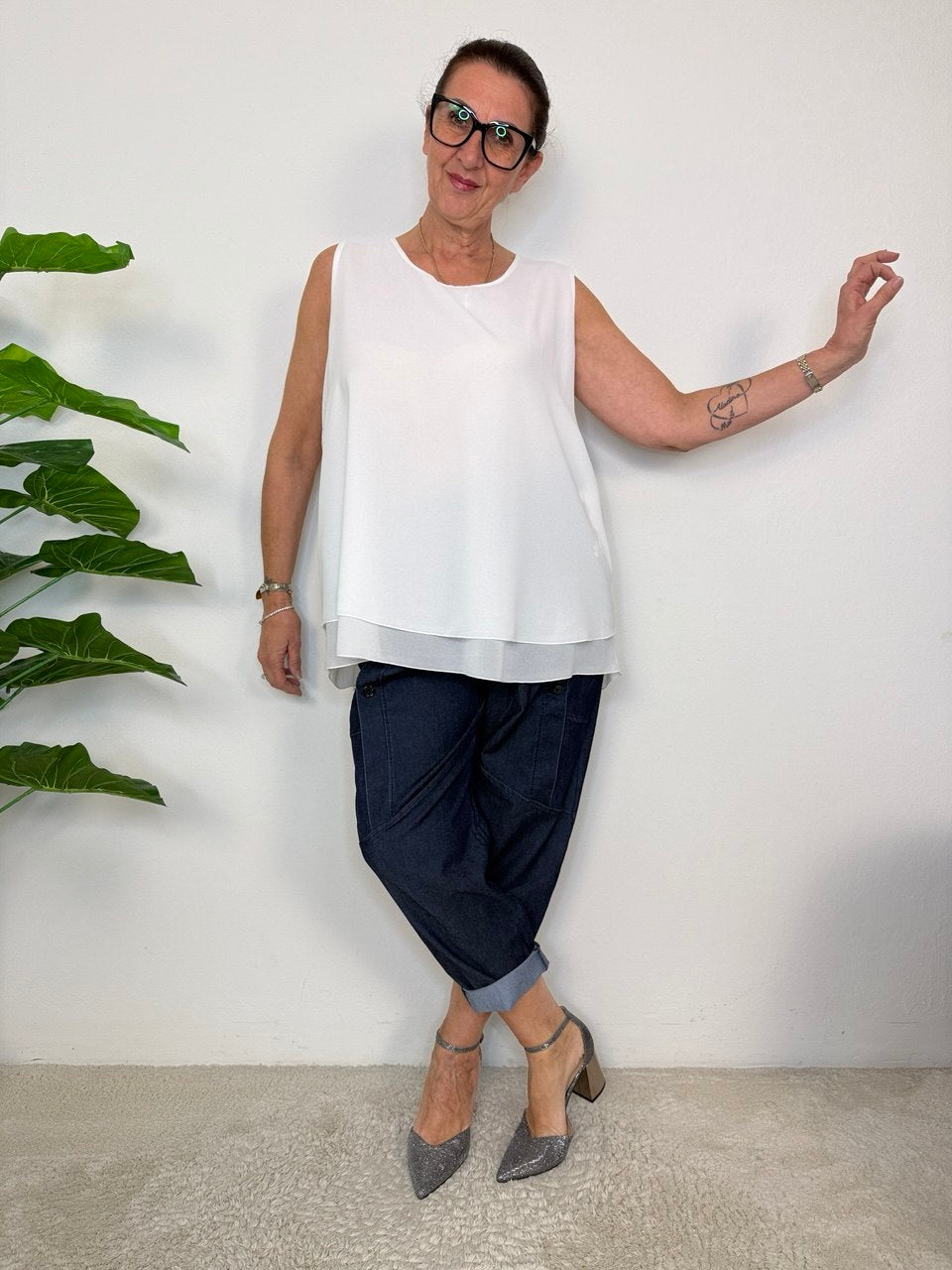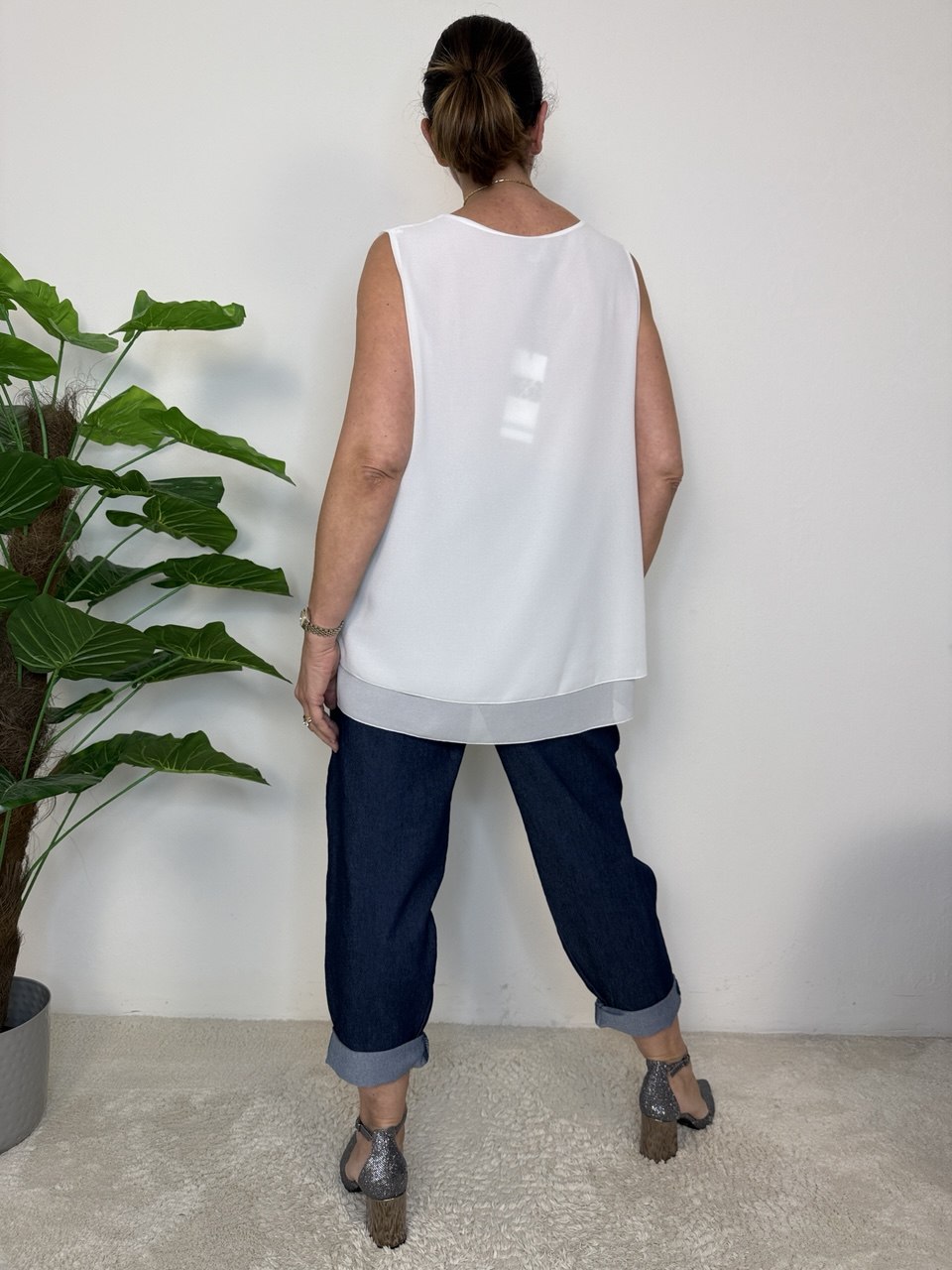 High-waisted jeans with elastic waistband, front pockets only, asymmetrical details and stitching for a more youthful and dynamic look, oversized fit from size 48 to a generous 52