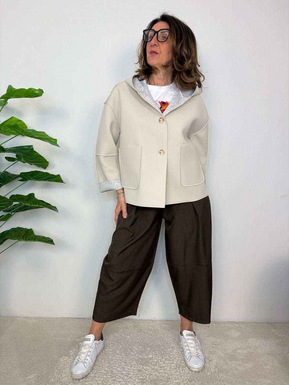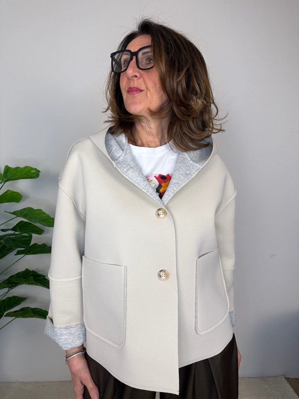 Neoprene with button fastening, hood, patch pockets on the front, slightly dropped armhole, fits from size 48 to a generous 50, cropped cut