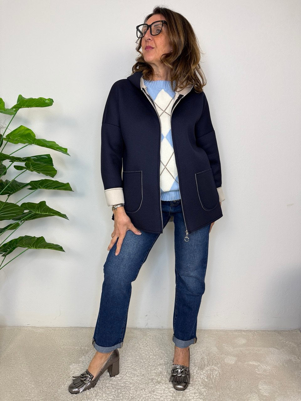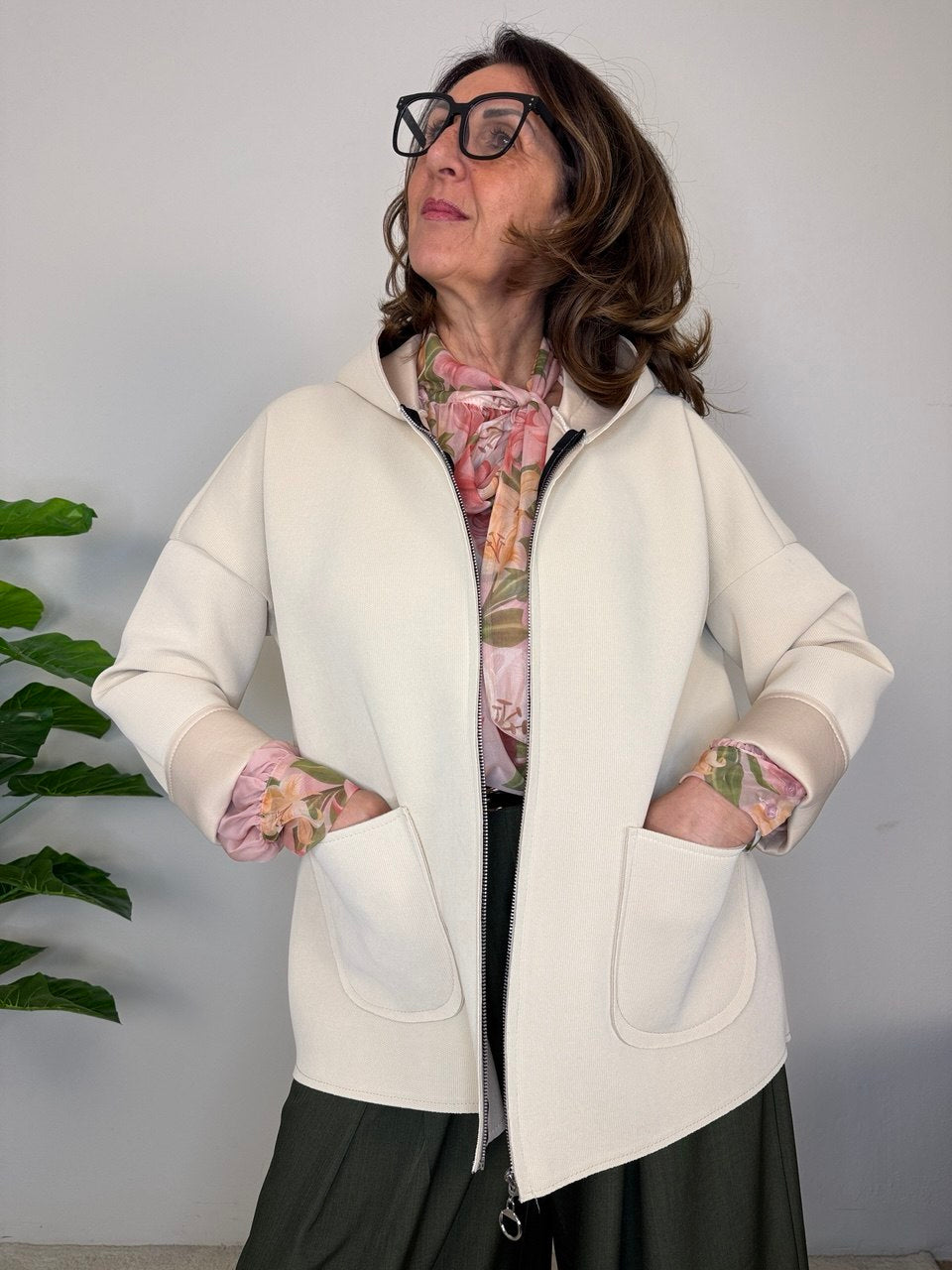 Neoprene jacket with zipper closure, hood, pockets, slightly dropped armhole, shorter in the front and longer and rounded in the back, fits sizes 46 to 50