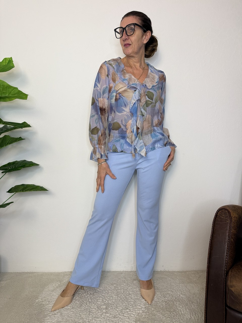 High-waisted trousers, zip and button fastening, front pockets only, trumpet leg, belt included
