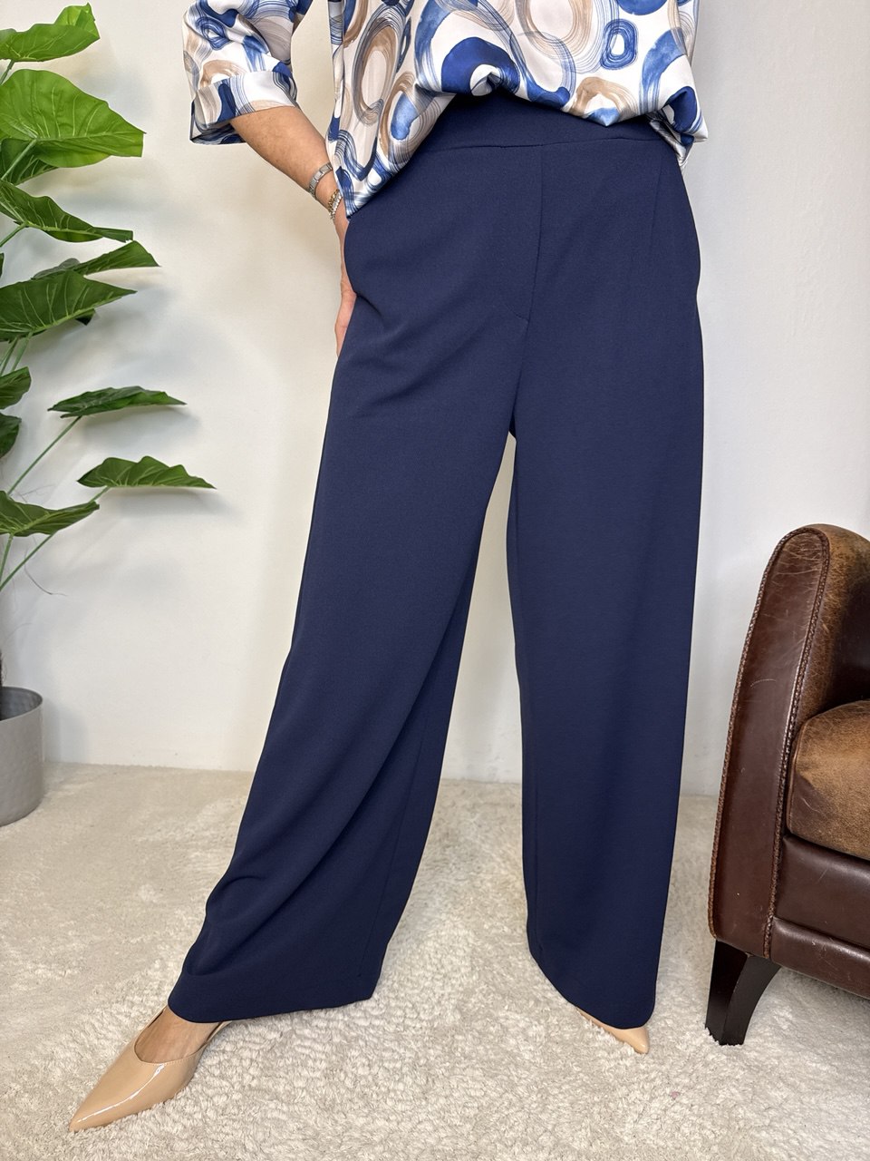 Stretch fabric trousers with palazzo legs, peplum at the front and elastic at the back, pockets only at the front, relaxed fit from size 46 to 50