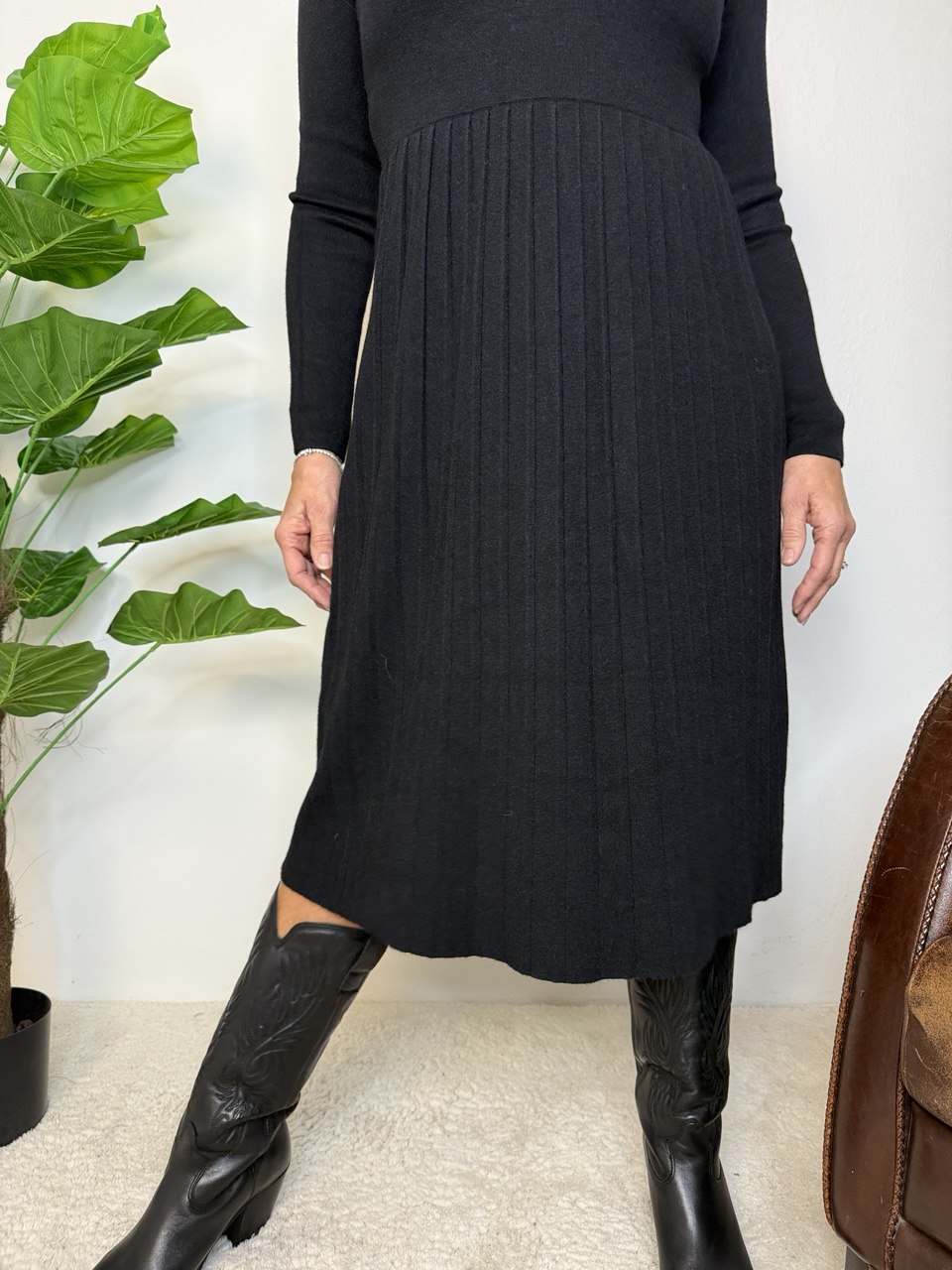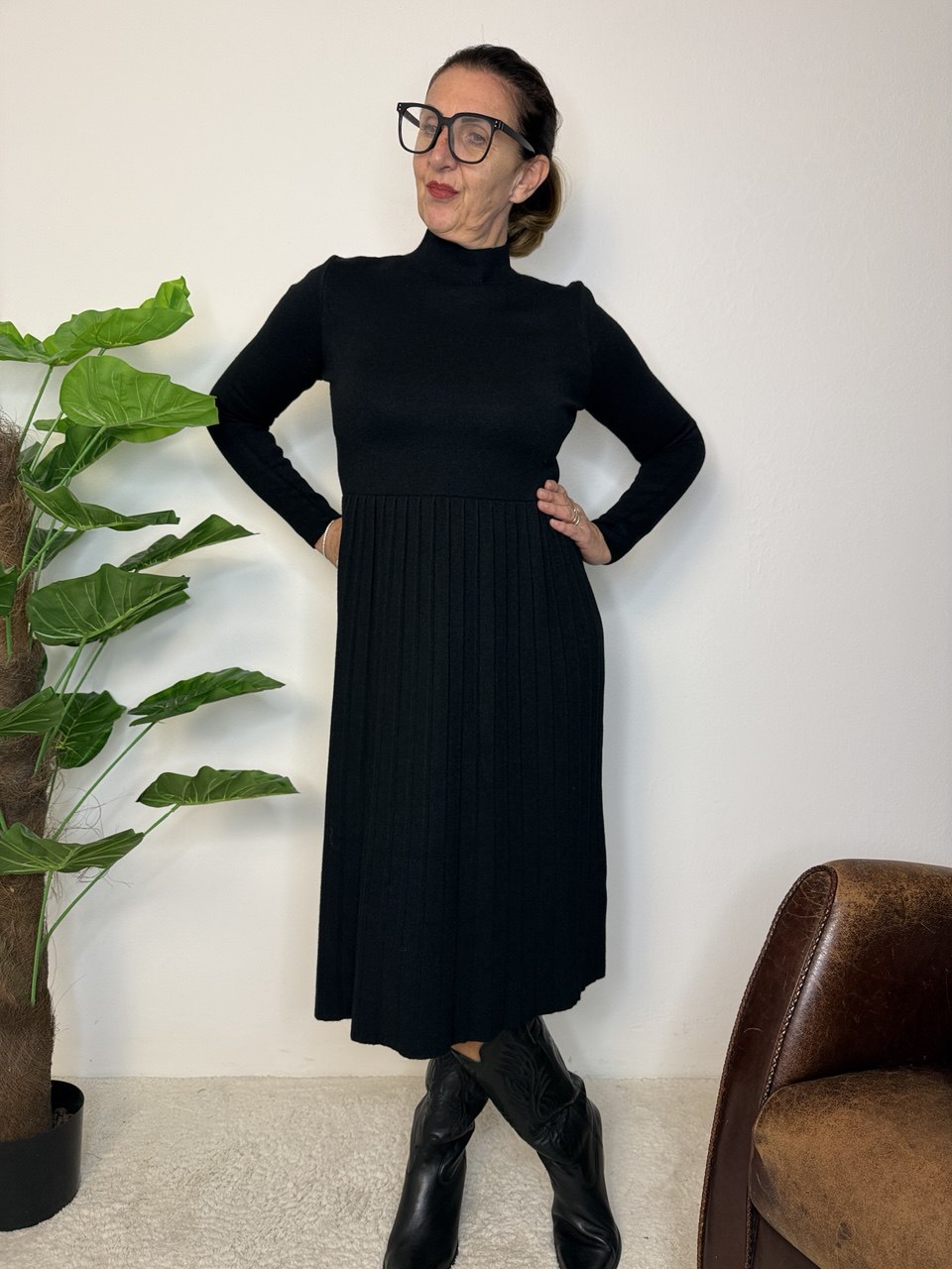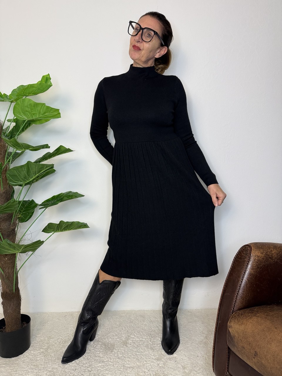Abito in maglina elasticizzata con collo vulcano, corpetto liscio e gonna con balze, vestibilità dalla taglia 40 alla 46 elasticizzata