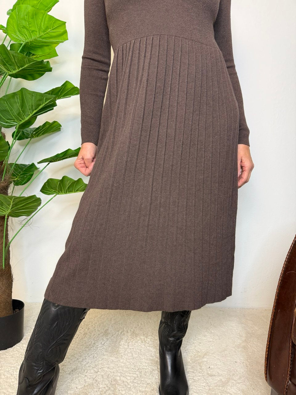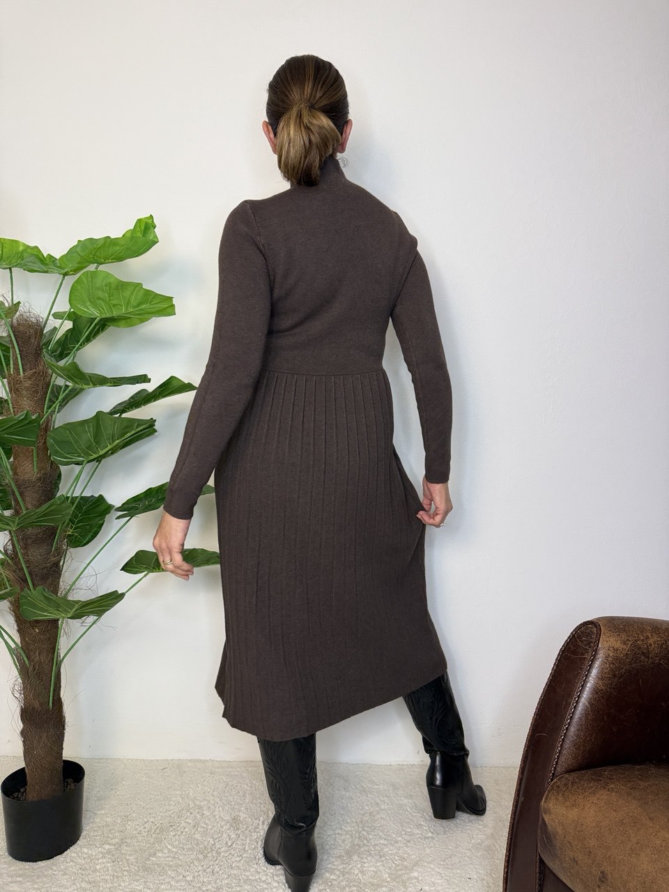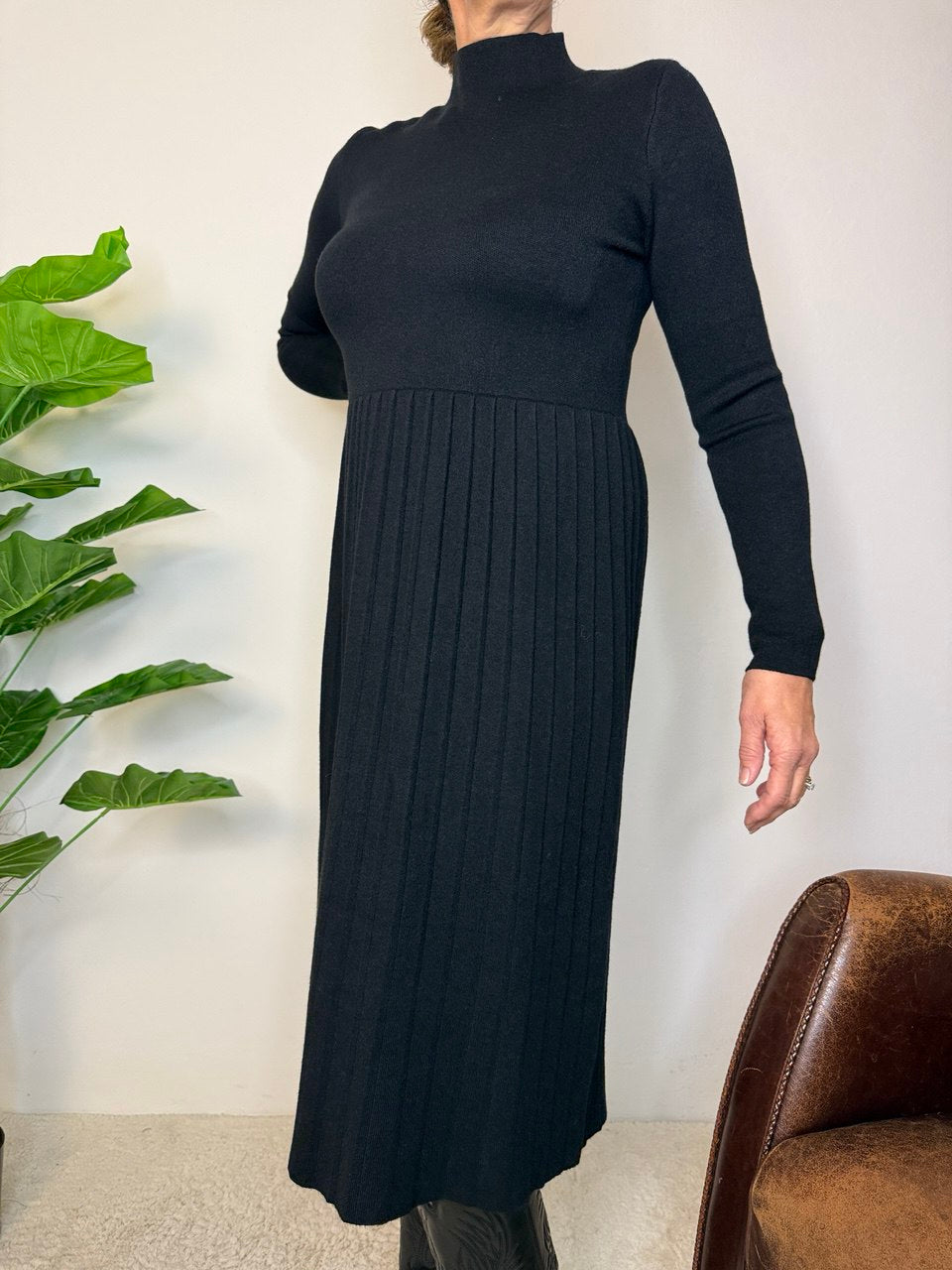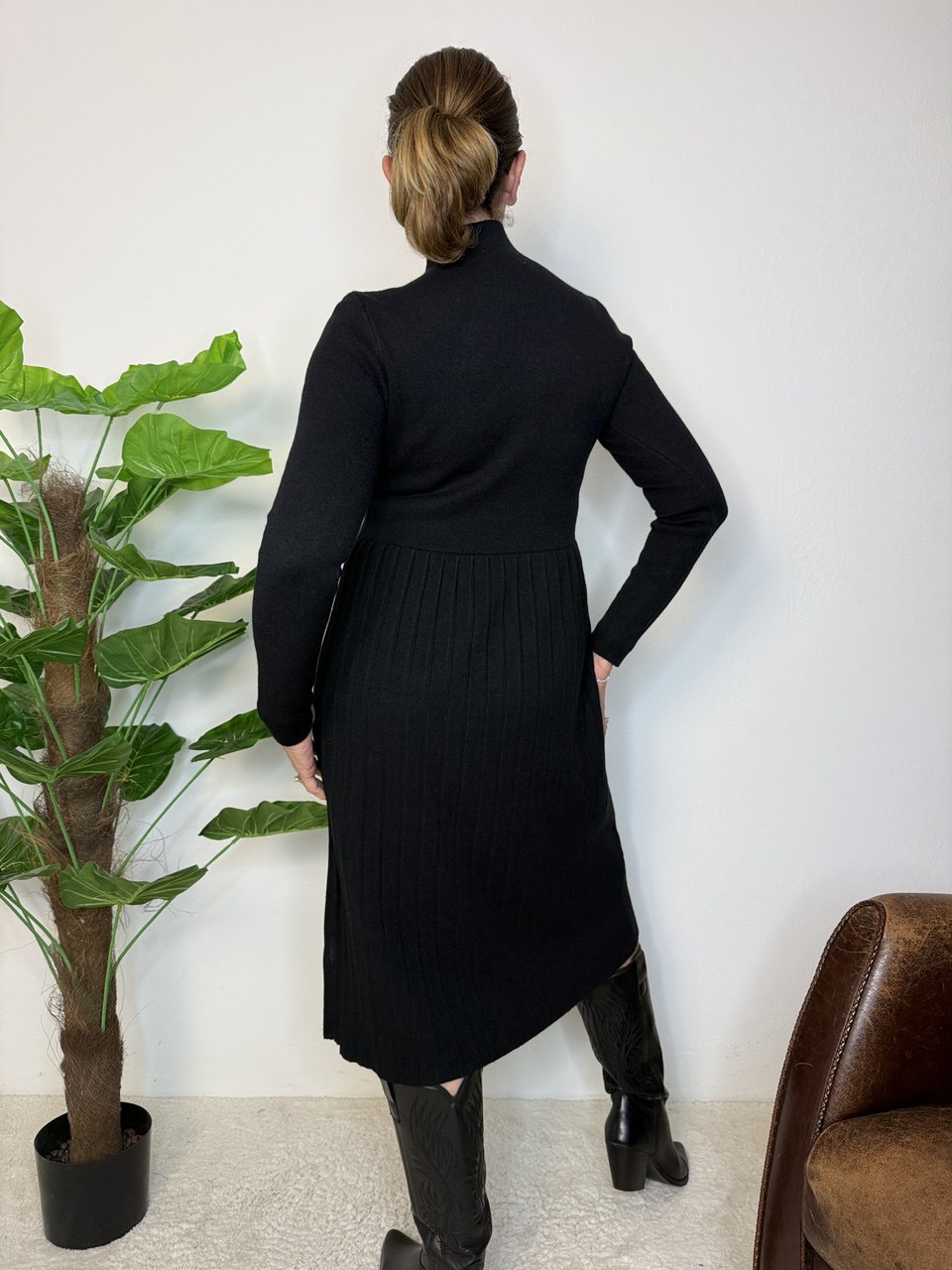 Abito in maglina elasticizzata con collo vulcano, corpetto liscio e gonna con balze, vestibilità dalla taglia 40 alla 46 elasticizzata