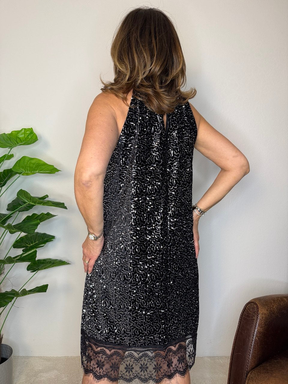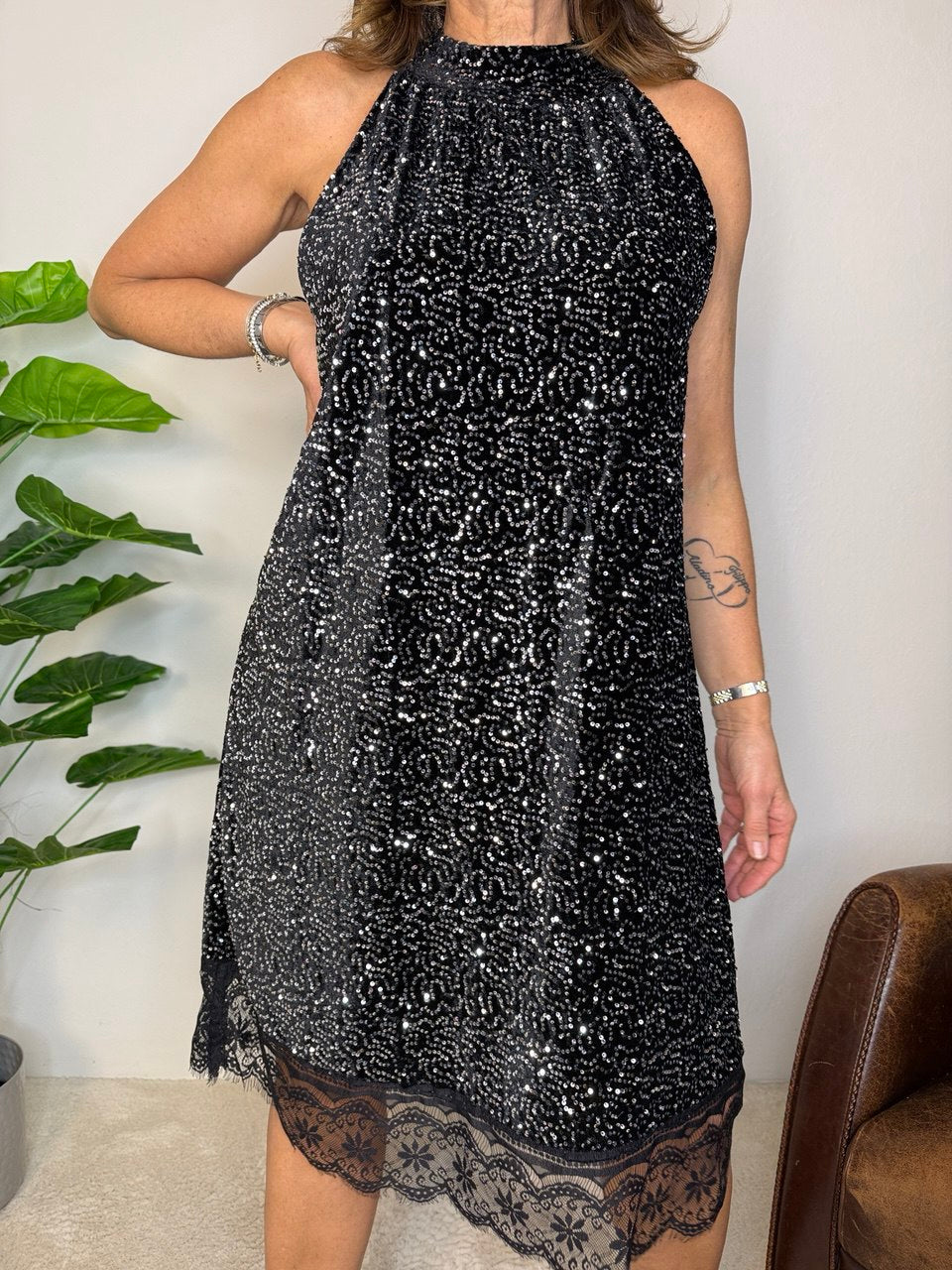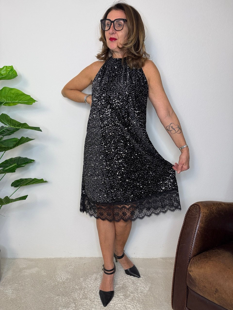 Abito smanicato in velluto tempestato di paillettes sia davanti che sul retro, collo alla coreana con chiusura a due bottoncini sul retro, dettaglio pizzo sul fondo, vestibilità dalla taglia 46 alla 50