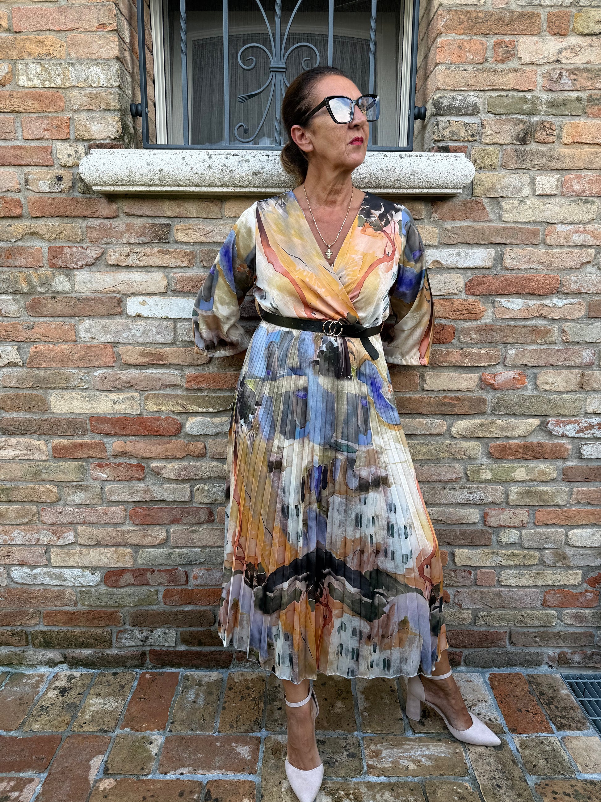 Abito con scollatura a V, elastico sottoseno, manica a 3/4, gonna plissettata, effetto raso lucido molto d'effetto