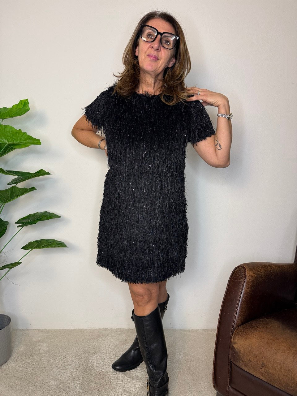 Abito a girocollo con maniche corte, foderato, abbellito da tessuto piumato con filo di glitter, vestibilità dalla taglia 42 alla 46