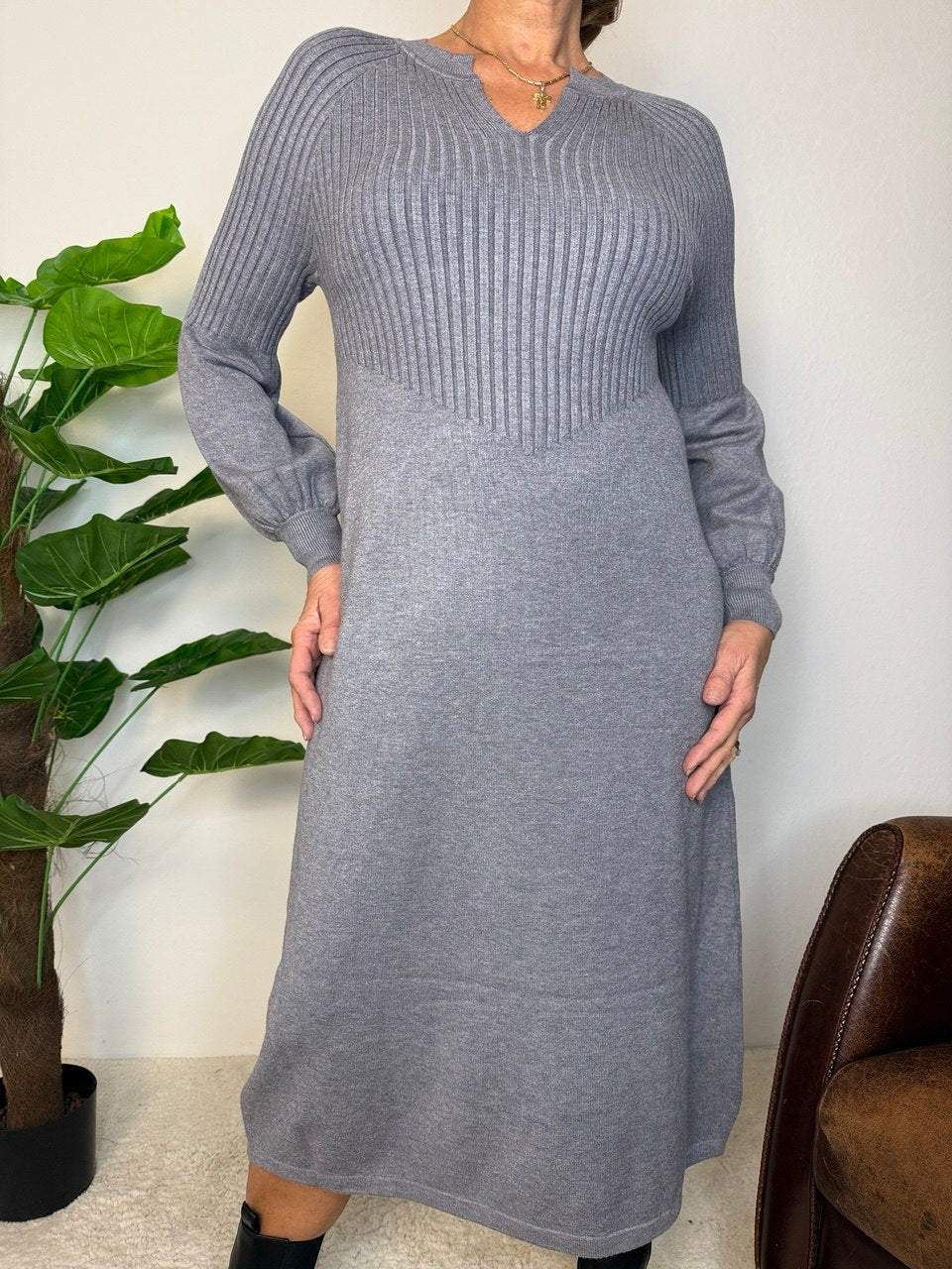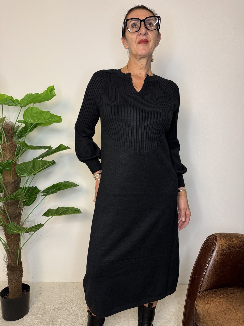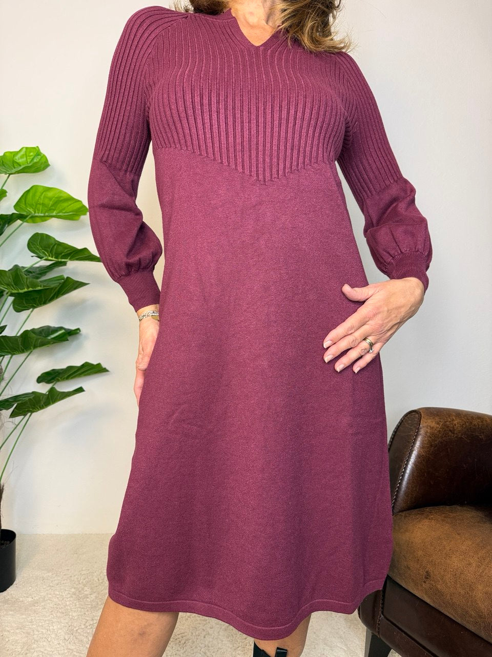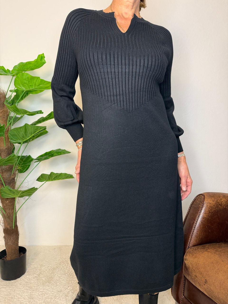 Abito in tessuto magliona elasticizzata, collettino con bordo costine di rifinitura e piccolo scollo a V, manica raglan, coste fino a mezza manica e il restante liscio e a palloncino, coste nel busto e gonna liscia, vestibilità dalla taglia 46 alla 48 elasticizzata