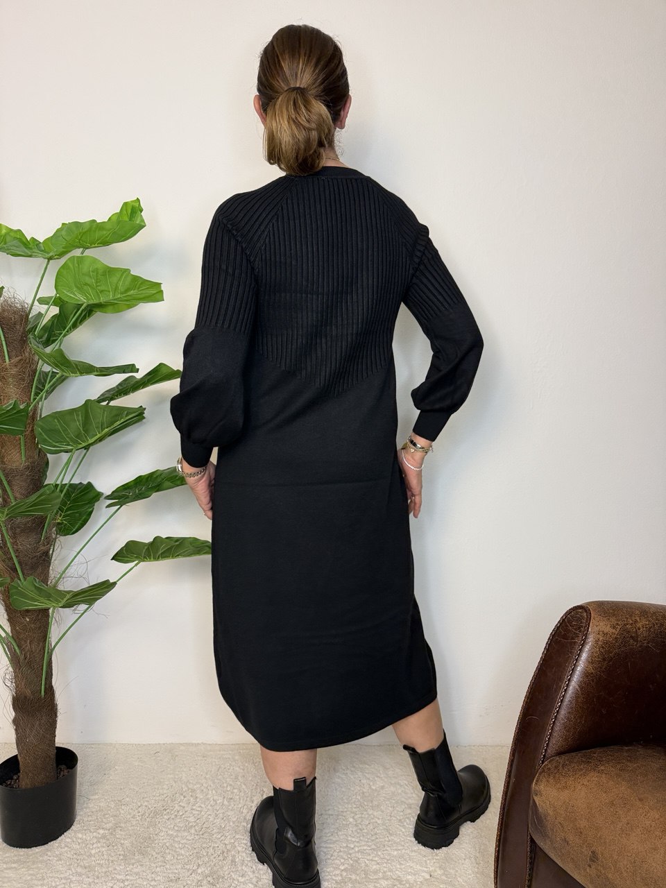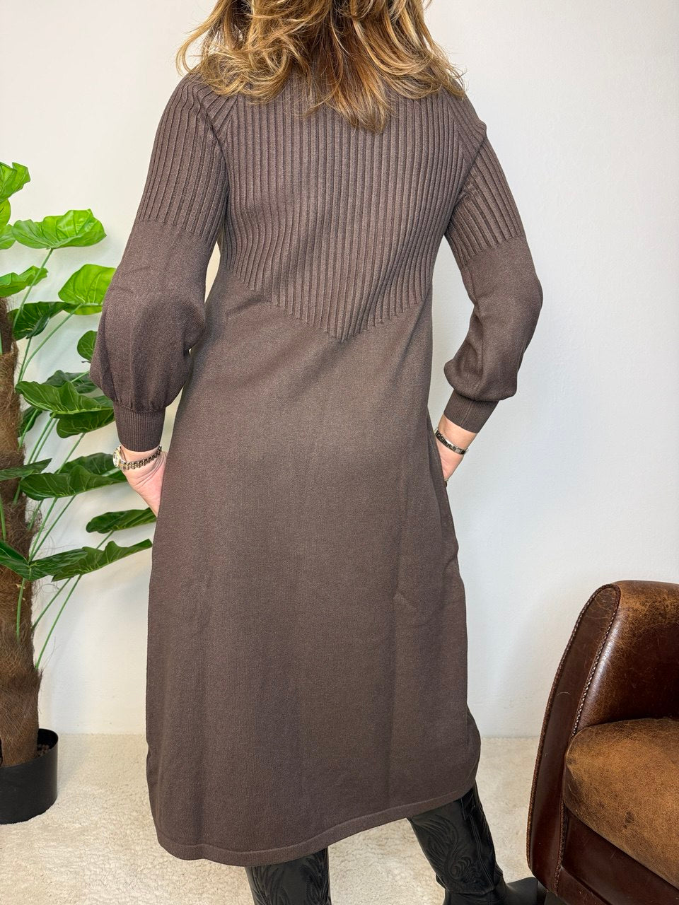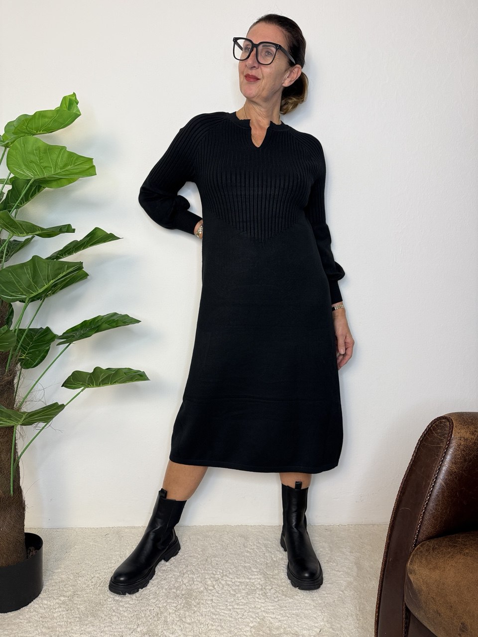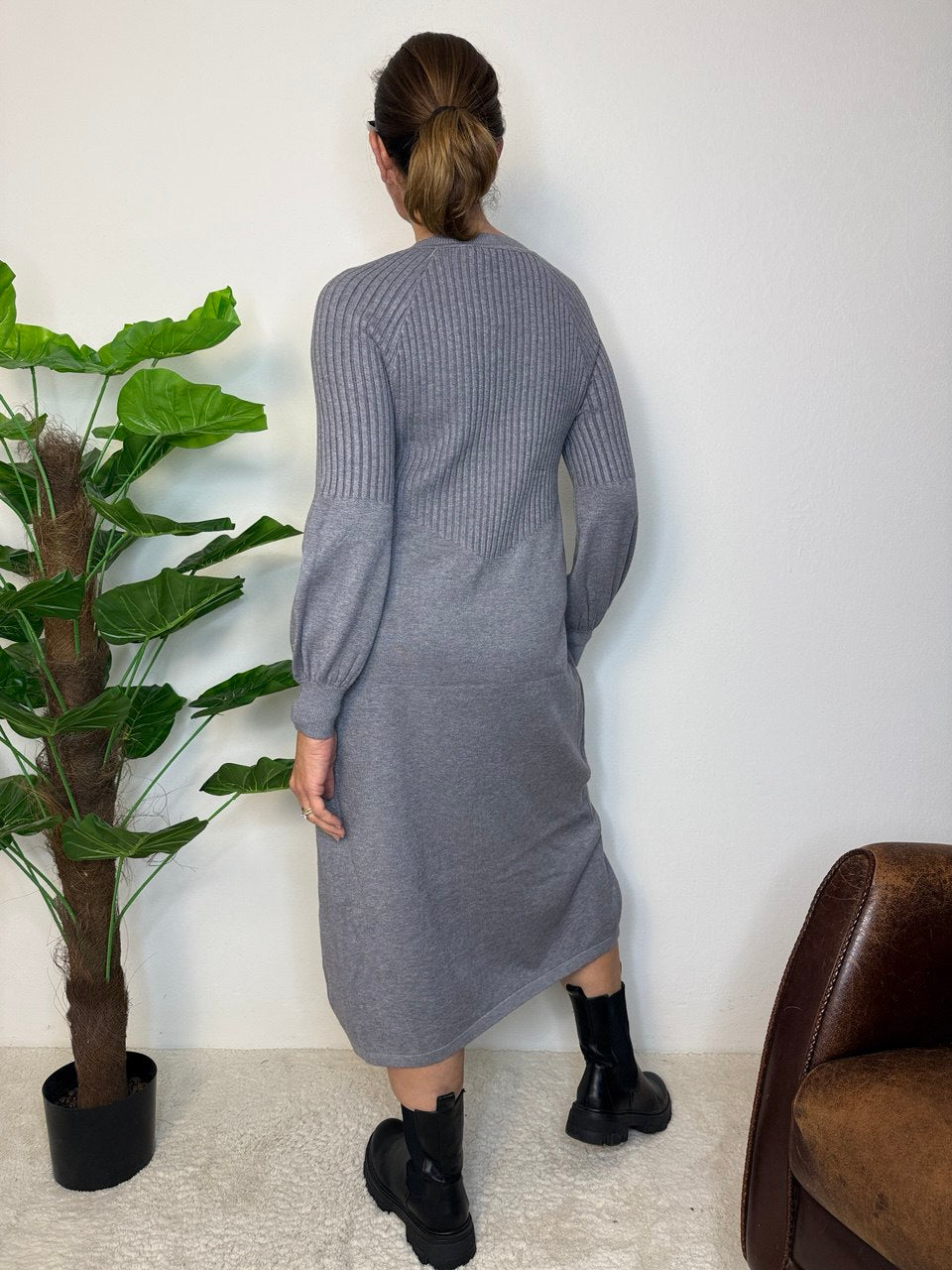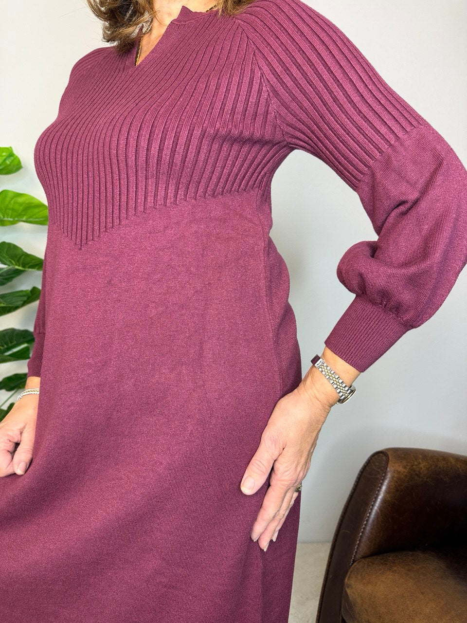 Abito in tessuto magliona elasticizzata, collettino con bordo costine di rifinitura e piccolo scollo a V, manica raglan, coste fino a mezza manica e il restante liscio e a palloncino, coste nel busto e gonna liscia, vestibilità dalla taglia 46 alla 48 elasticizzata
