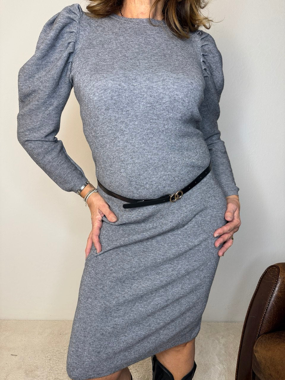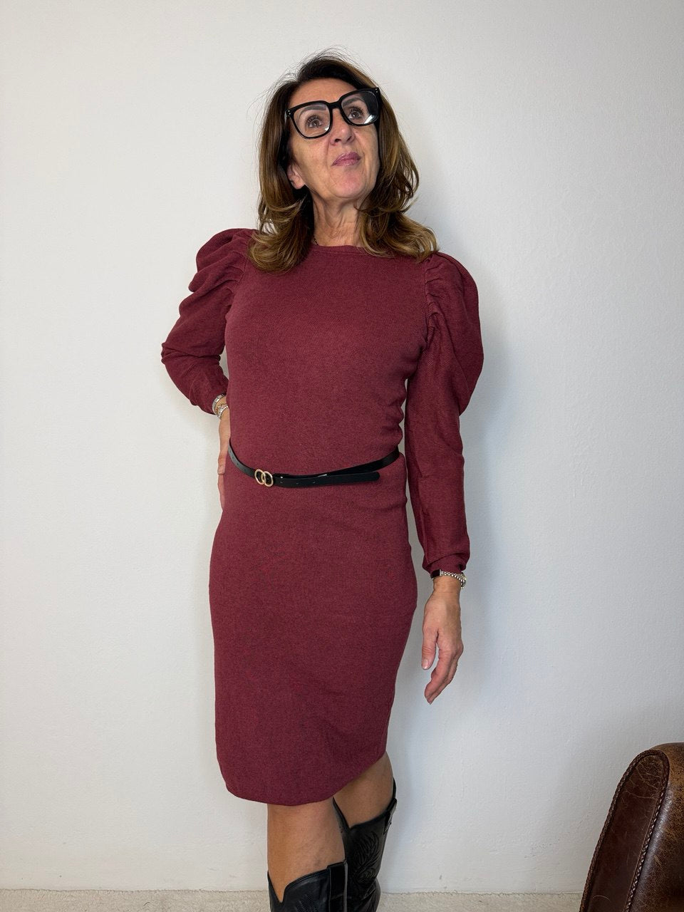 Abito in tessuto maglina elasticizzato girocollo, manica a sbuffo, lunghezza appena sotto il ginocchio, vestibilità dalla taglia 42 alla 46, effetto WOW!