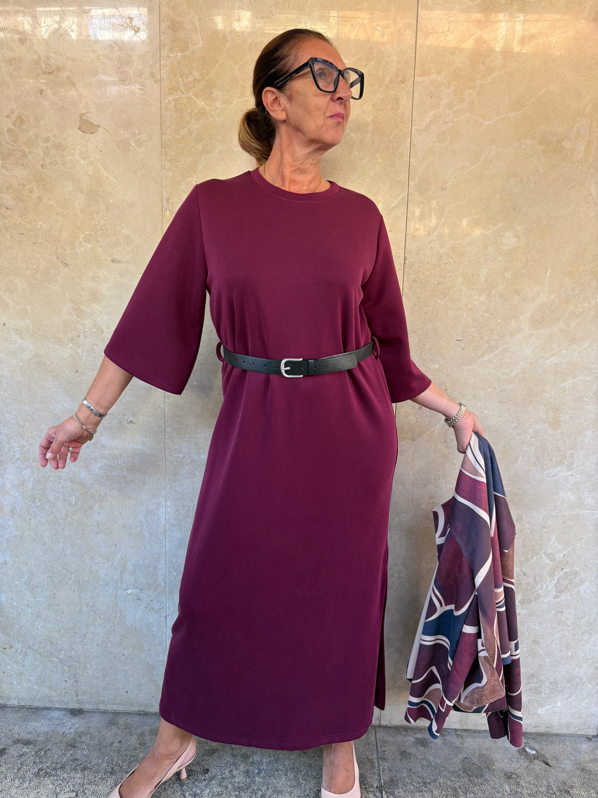 Abito a girocollo con manica 3/4 ampia, spacco laterale, dalla vestibilità morbida e lineare, tessuto molto soffice