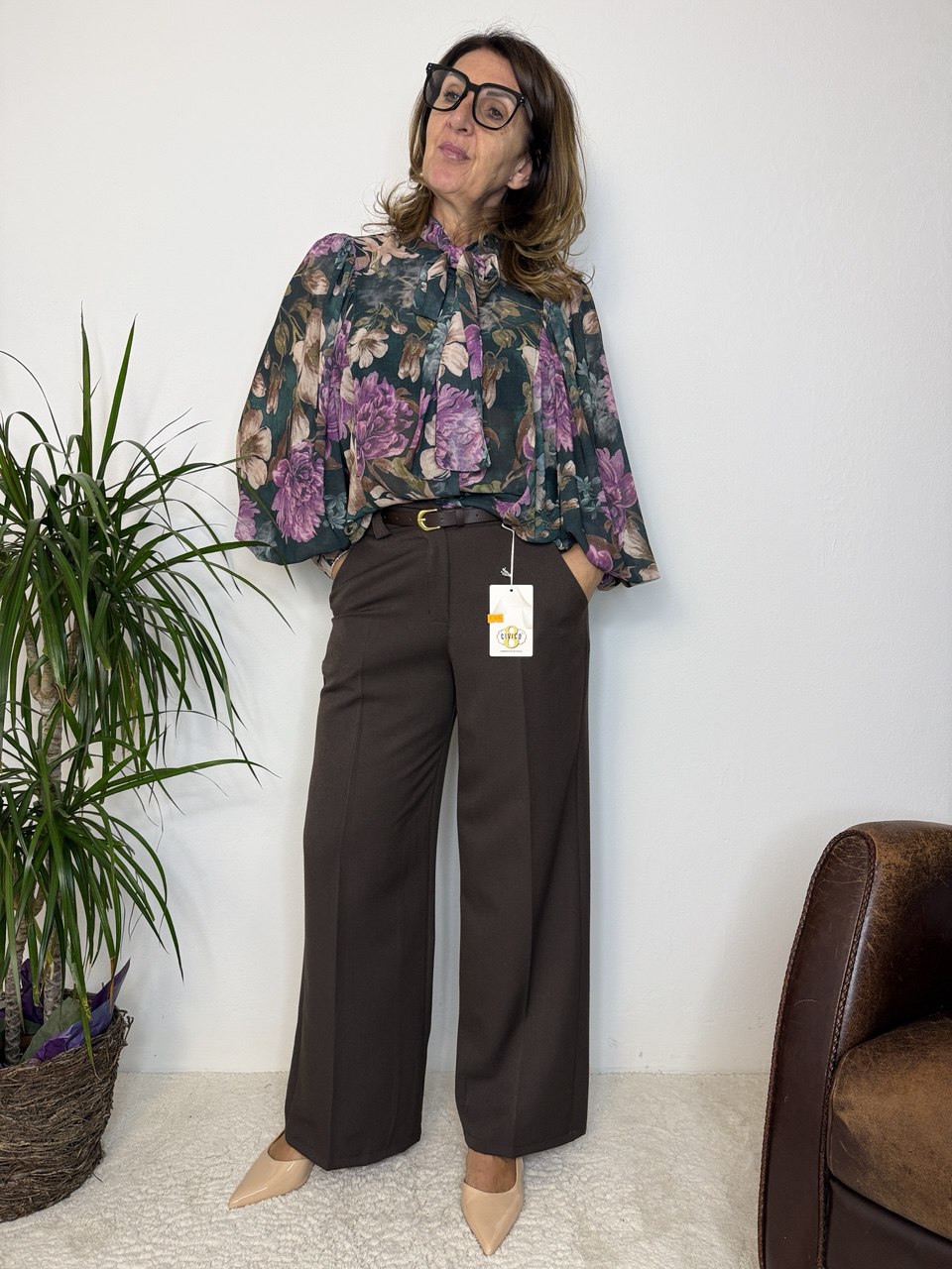 Blusa con collo alla coreana, bottoncini di chiusura, laccetto per fiocco regolabile e non removibile, giro manica molto ampio, manica a palloncino, vestibilità morbida dalla taglia 44 alla 48 abbondante