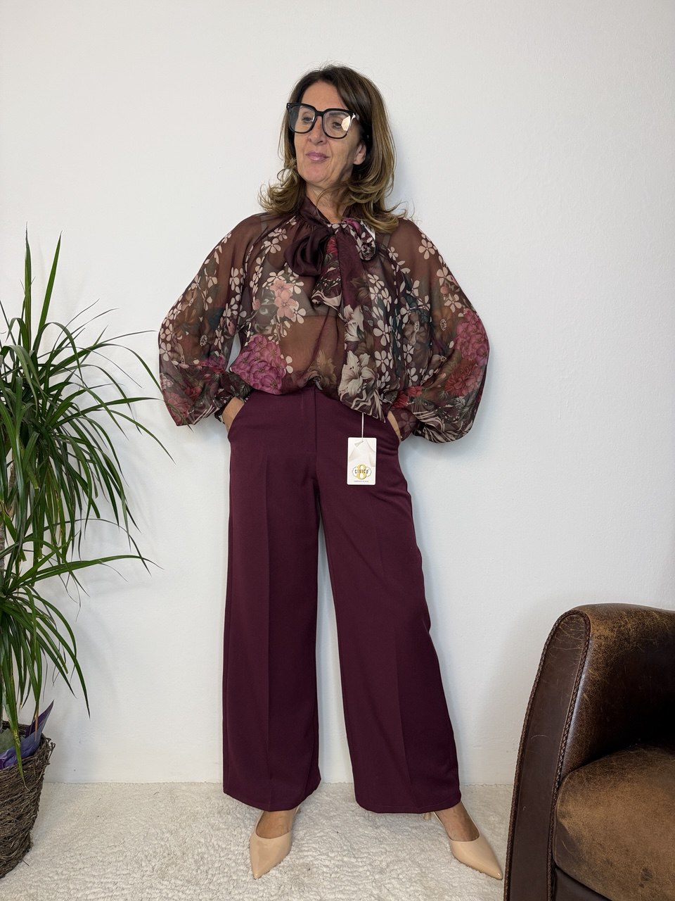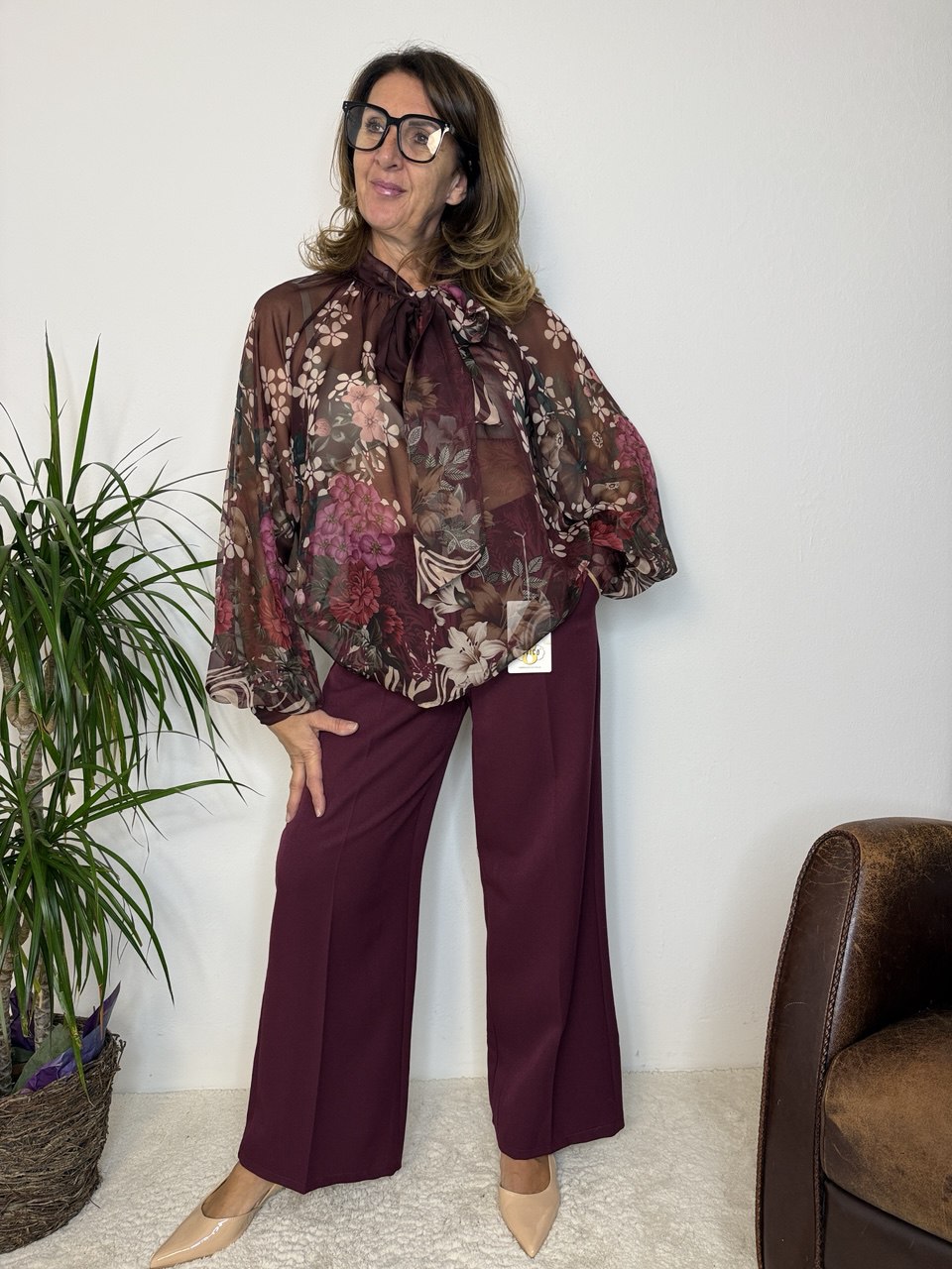 Blusa velata con collo lupetto e fiocco regolabile leggermente a lato, manica raglan, vestibilità oversize dalla taglia 44 alla 50