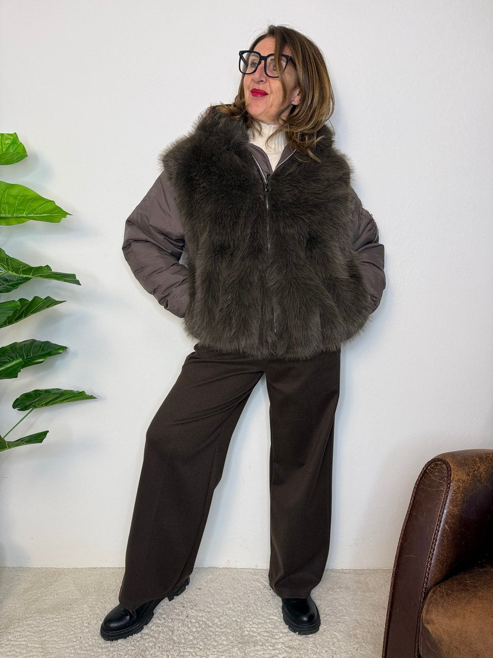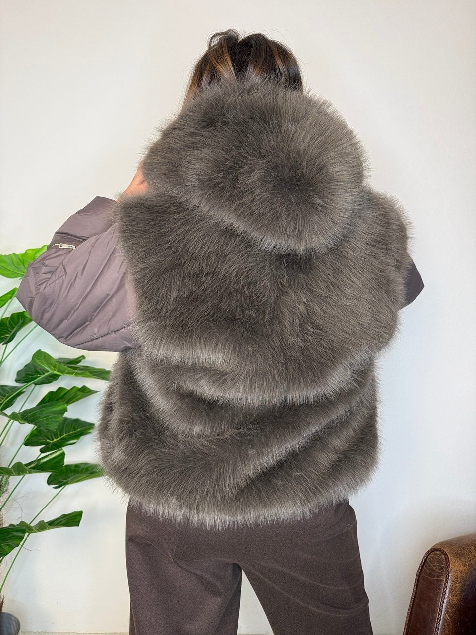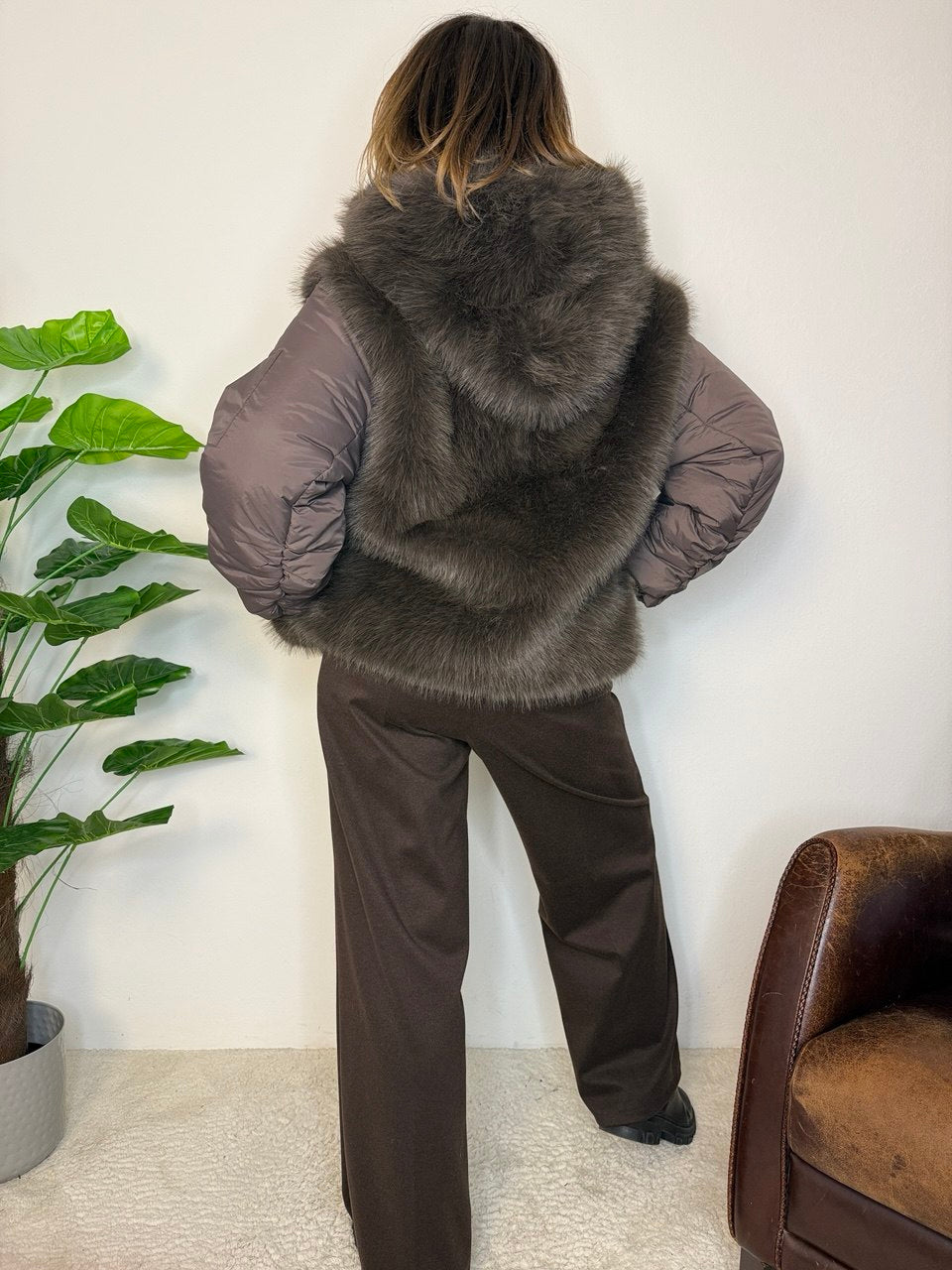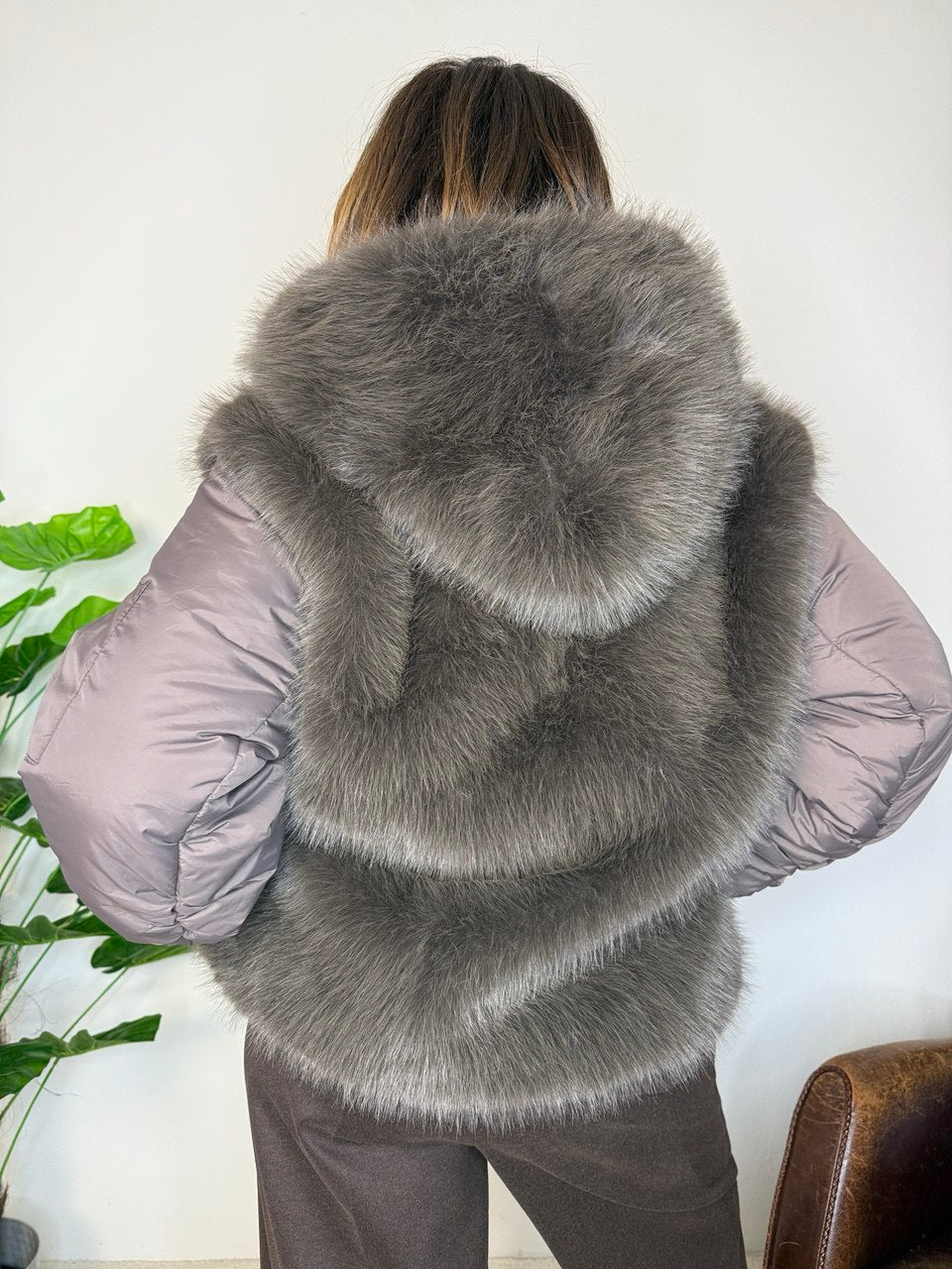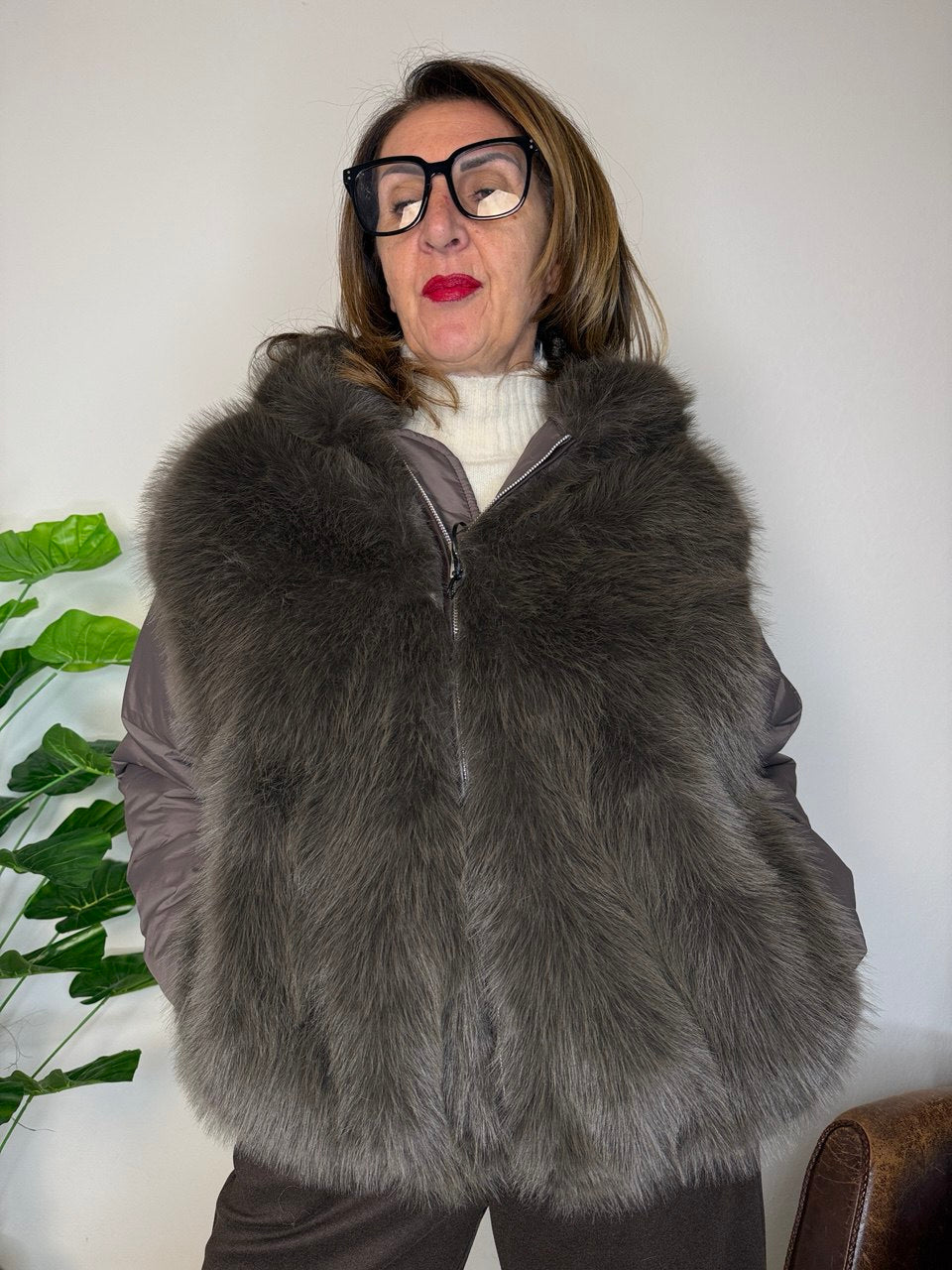 Bomberino con chiusura lampo, tasche, cappuccio, pelliccia davanti e dietro e manica imbottita in tessuto lucido, elastico sul fondo per rimborsare, spalla che scende leggermente, taschina di bellezza sulla manica, vestibilità dalla taglia 46 alla 50, capo stupendo e super alla moda