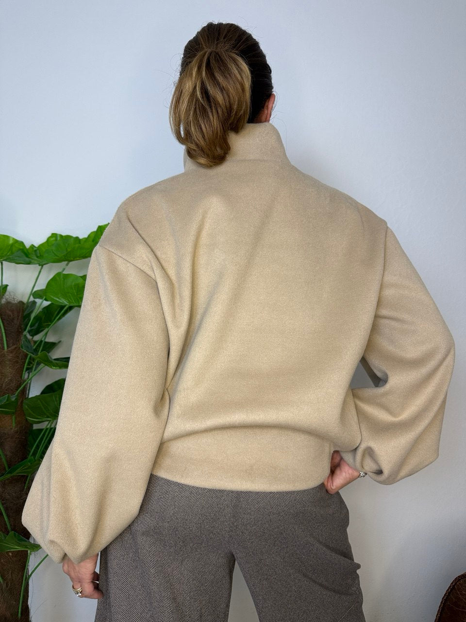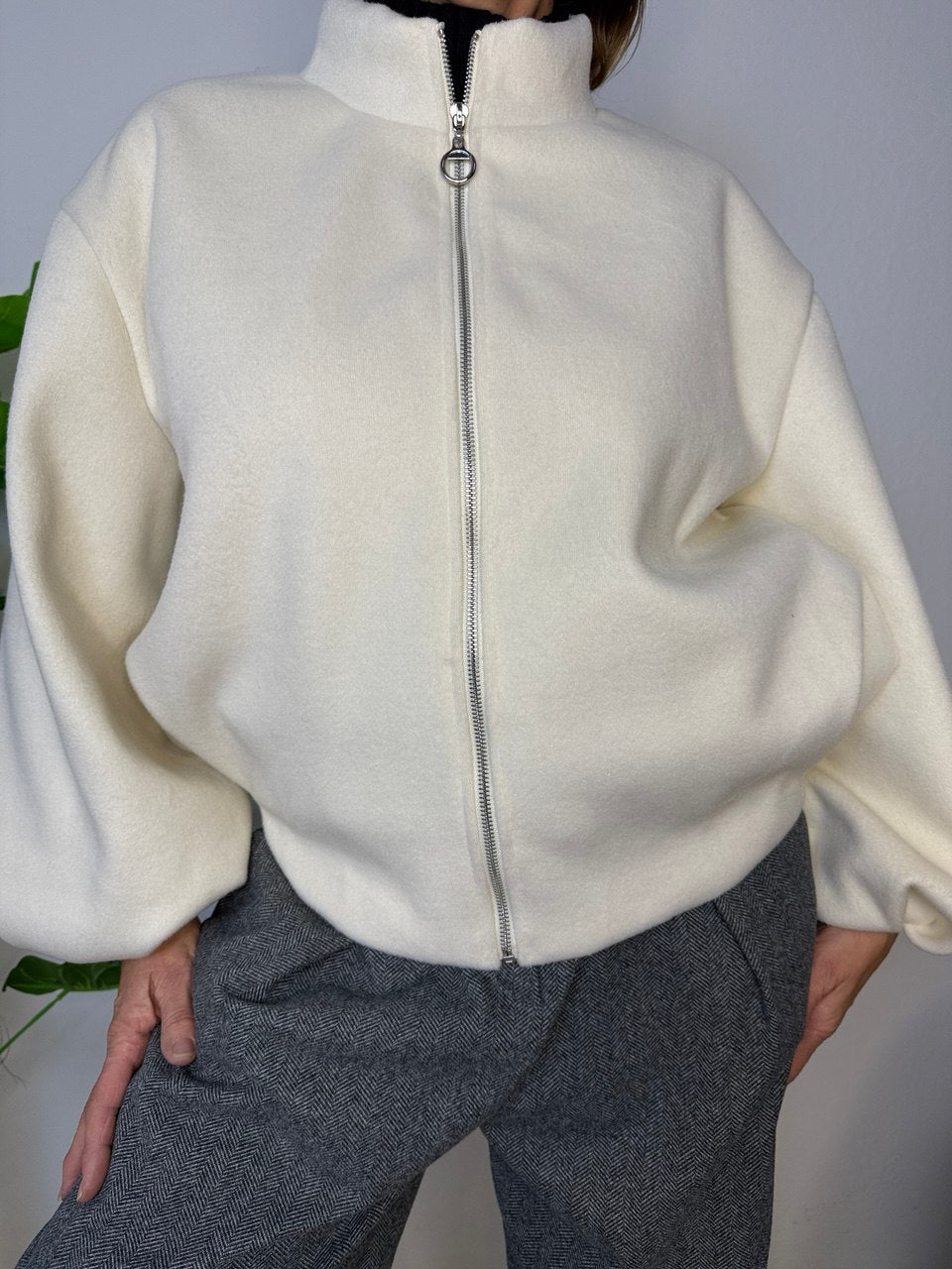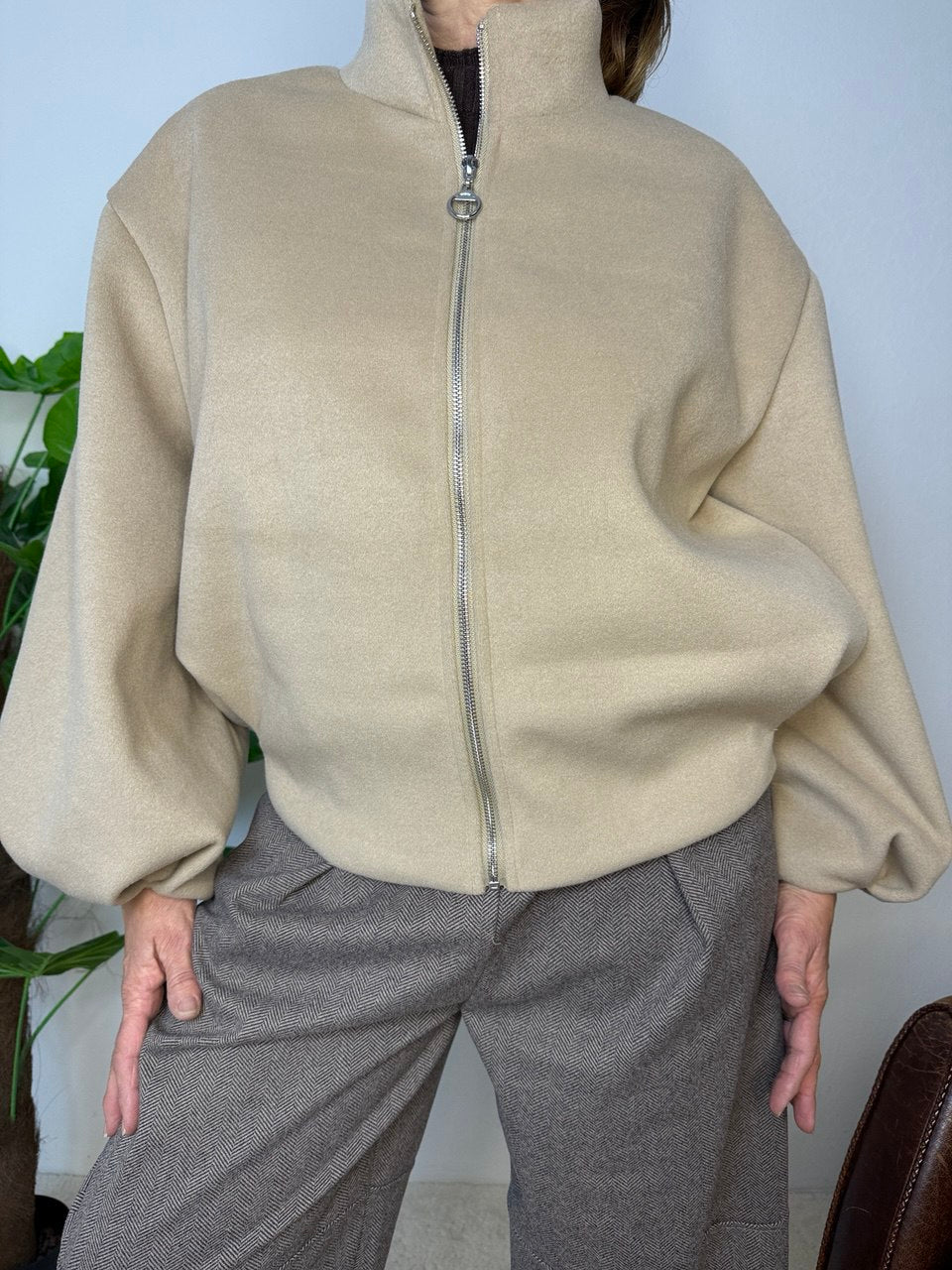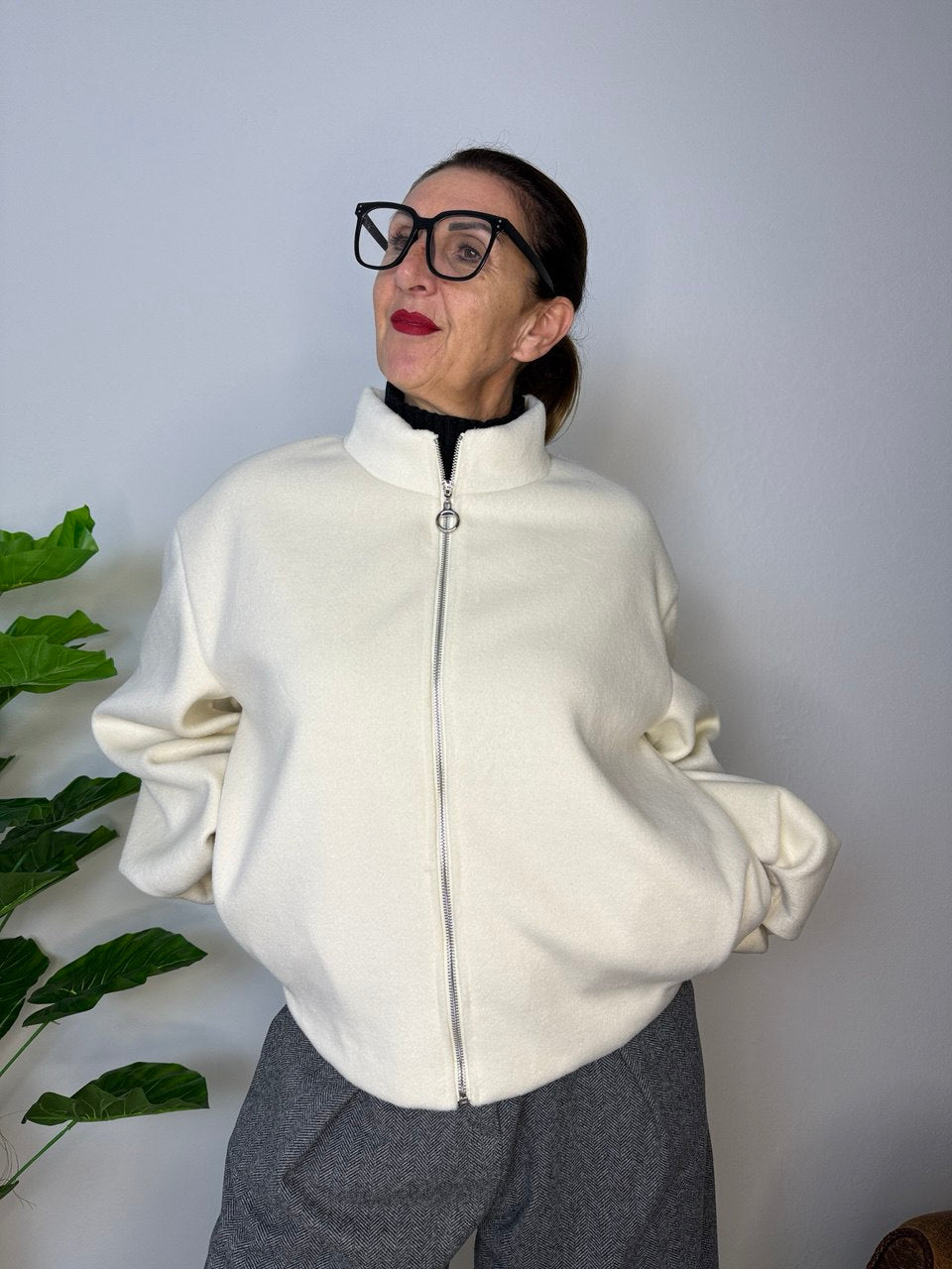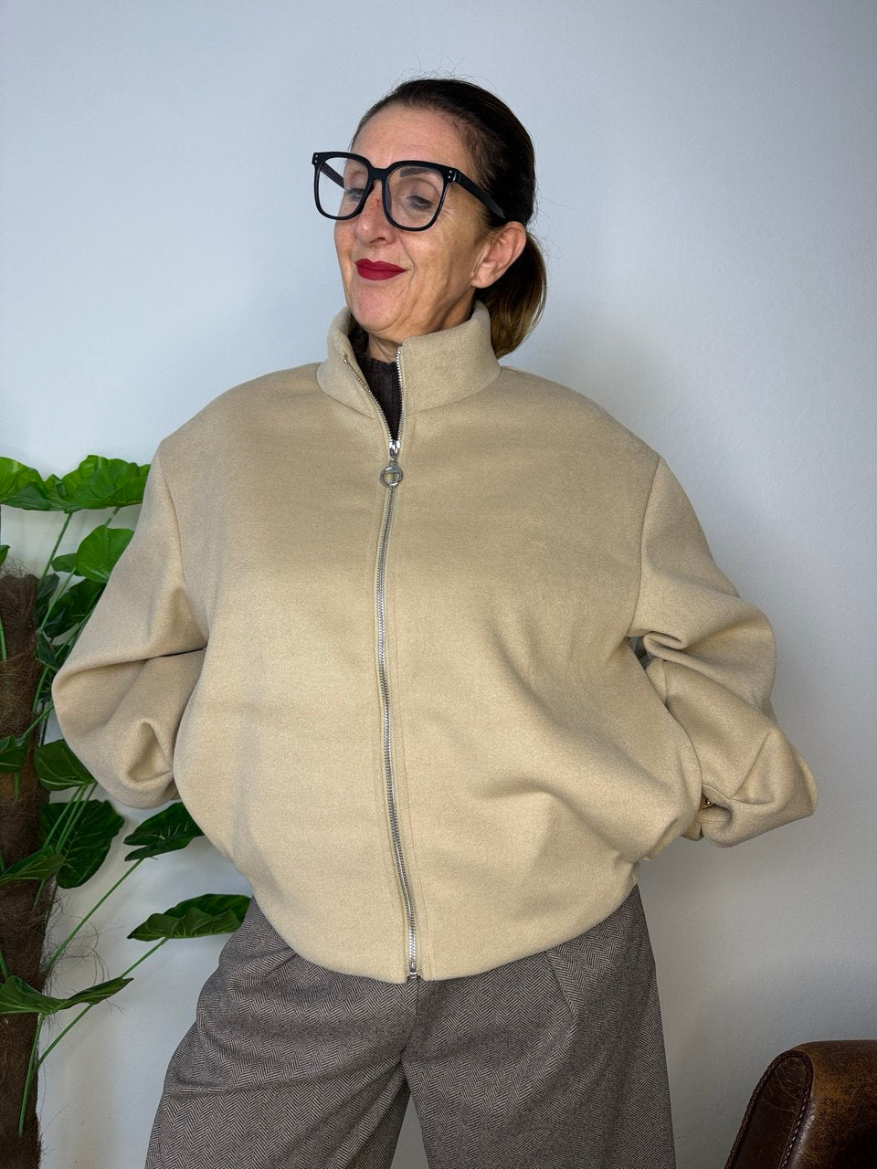 Bomberino ad effetto panno foderato, maniche a palloncino, pence sul fondo ai lati, tasche, chiusura zip, vestibilità oversize dalla taglia 44 alla 48