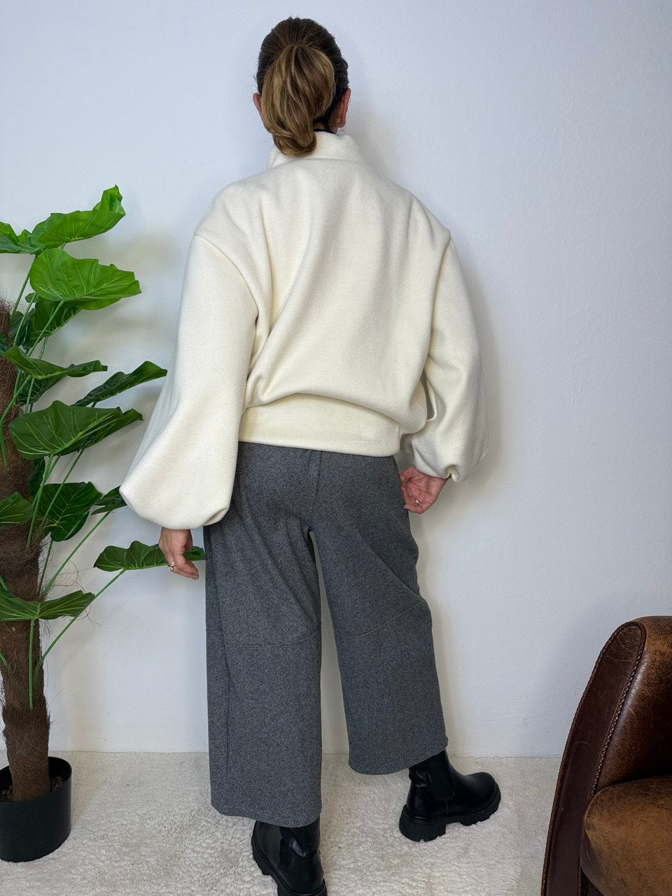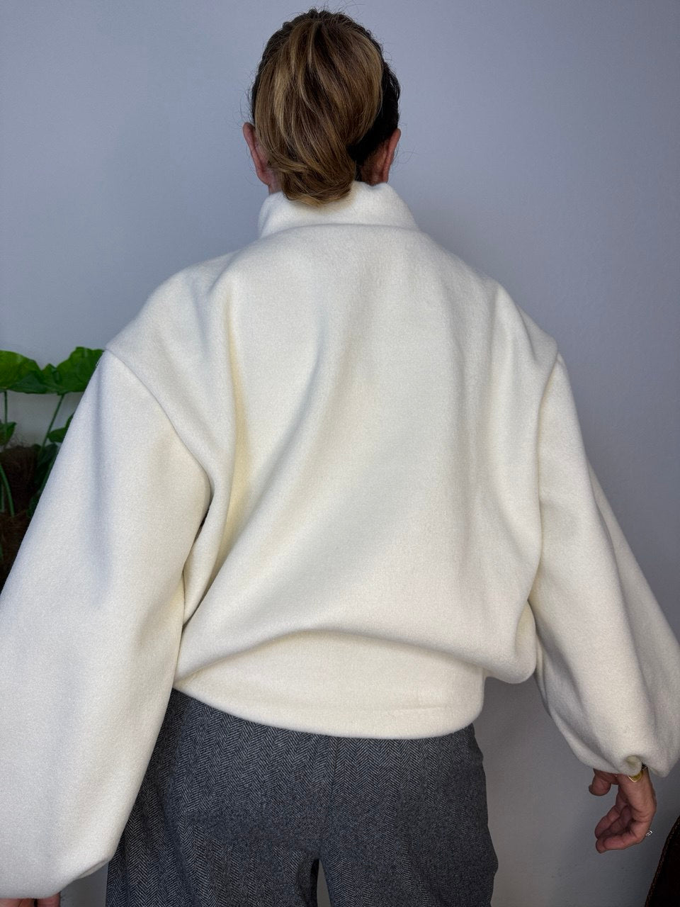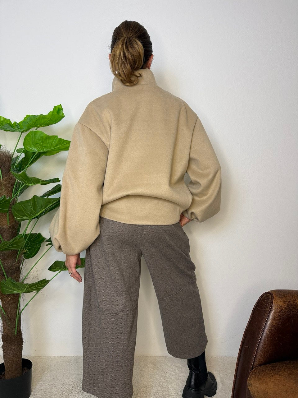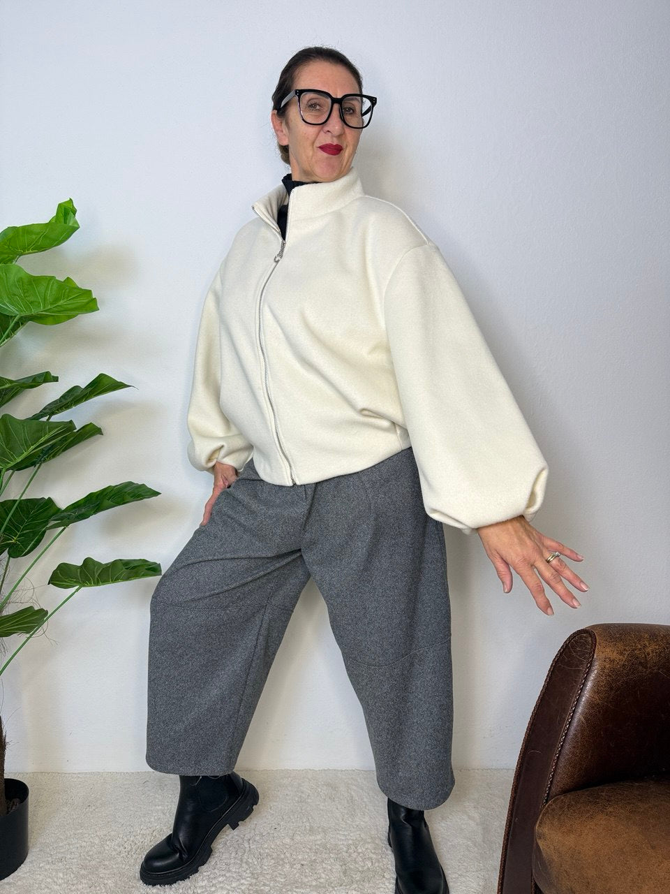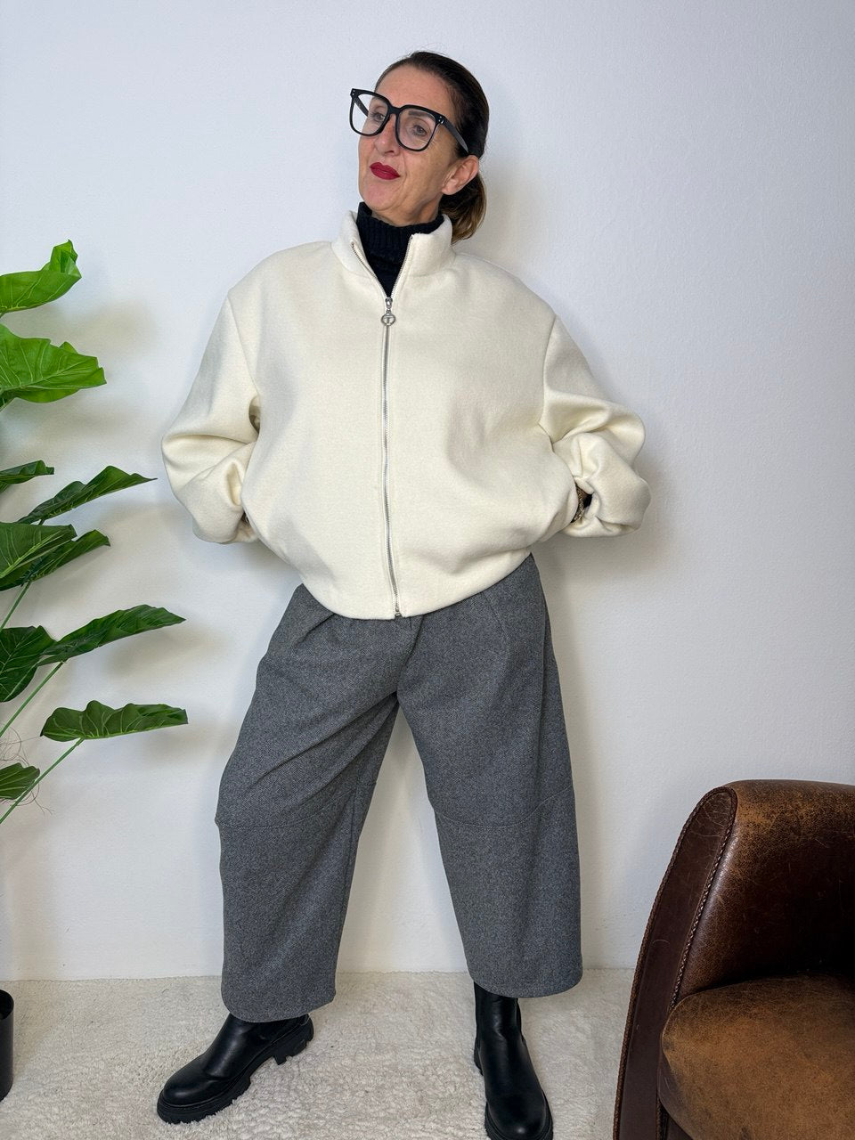 Bomberino ad effetto panno foderato, maniche a palloncino, pence sul fondo ai lati, tasche, chiusura zip, vestibilità oversize dalla taglia 44 alla 48