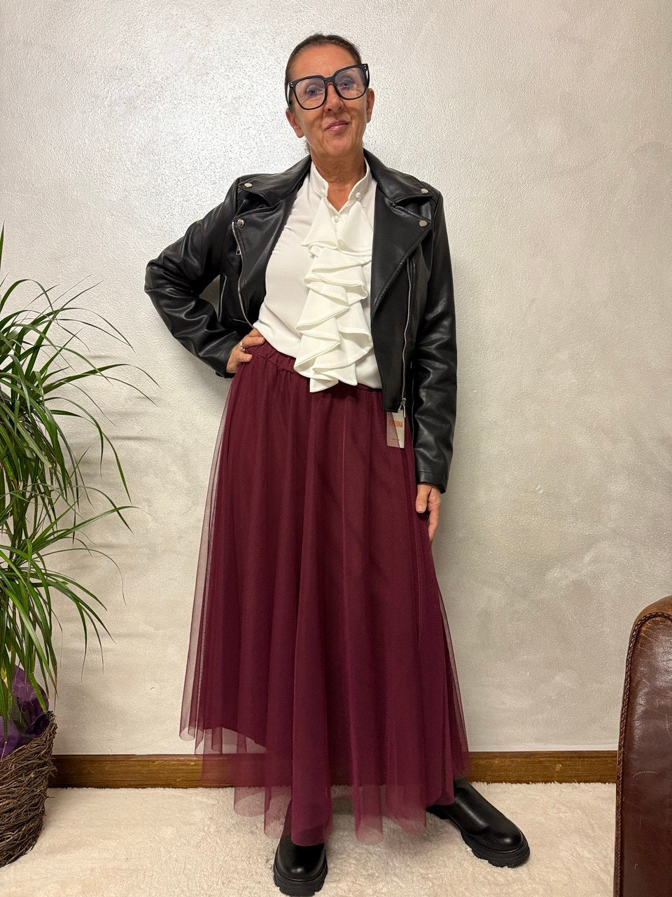 Camicia con collettino a coreana, bottoni dello stesso colore, bavero sul davanti, maica a palloncino, con polso leggermente alto e due bottoni di chiusura, doppio strato di velo davanti, leggermente trasparente dietro