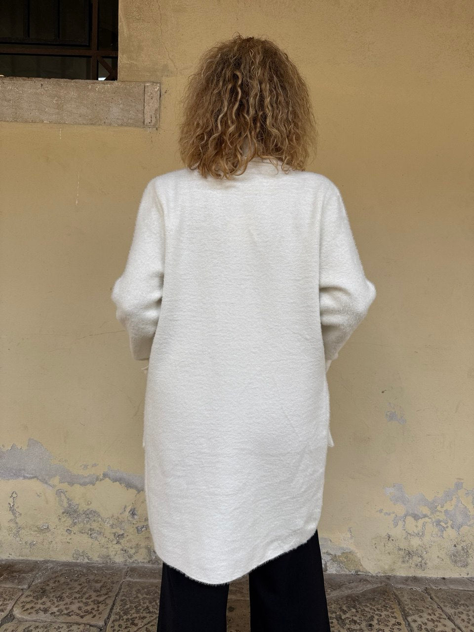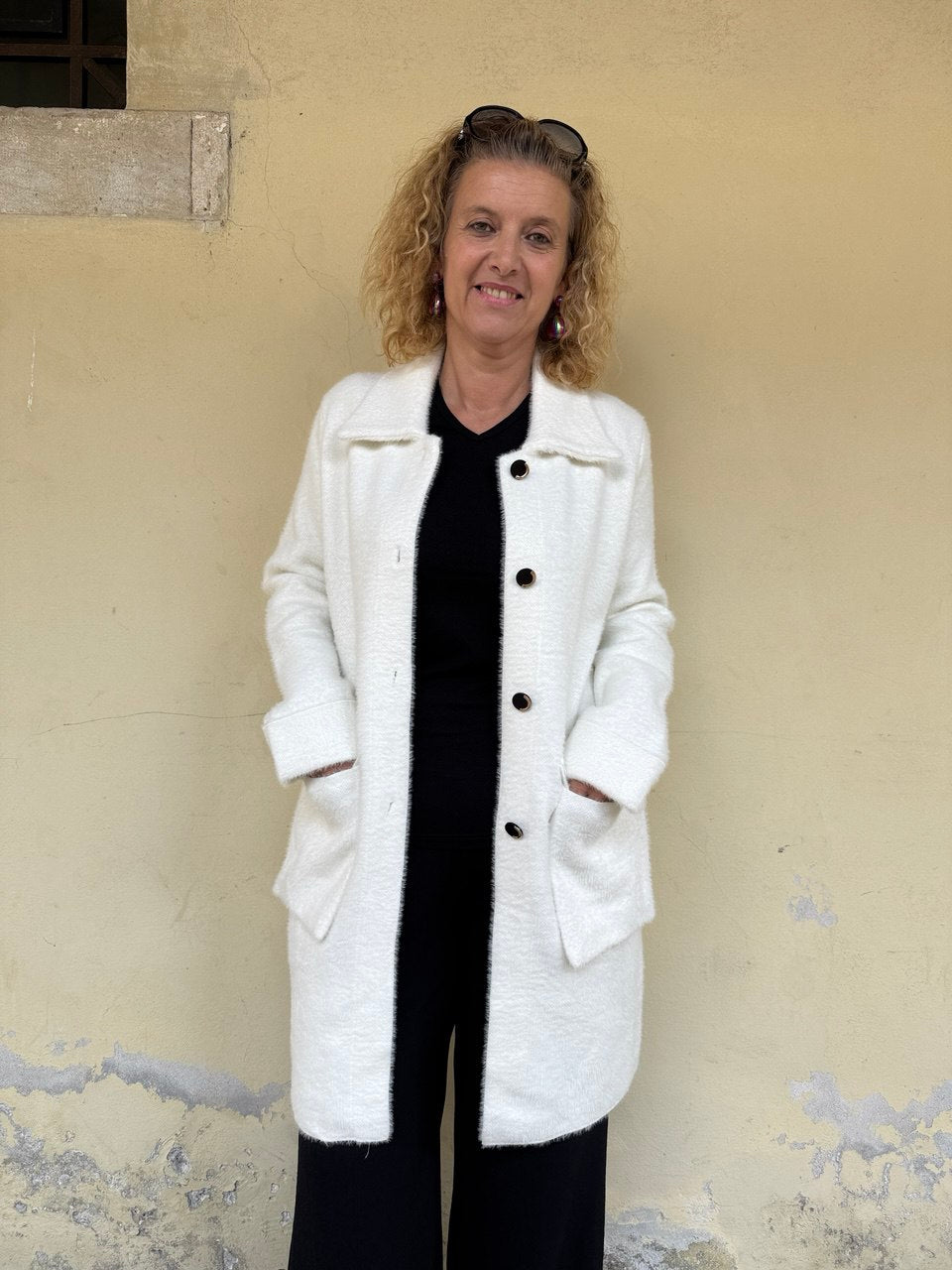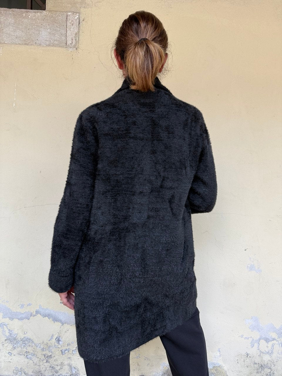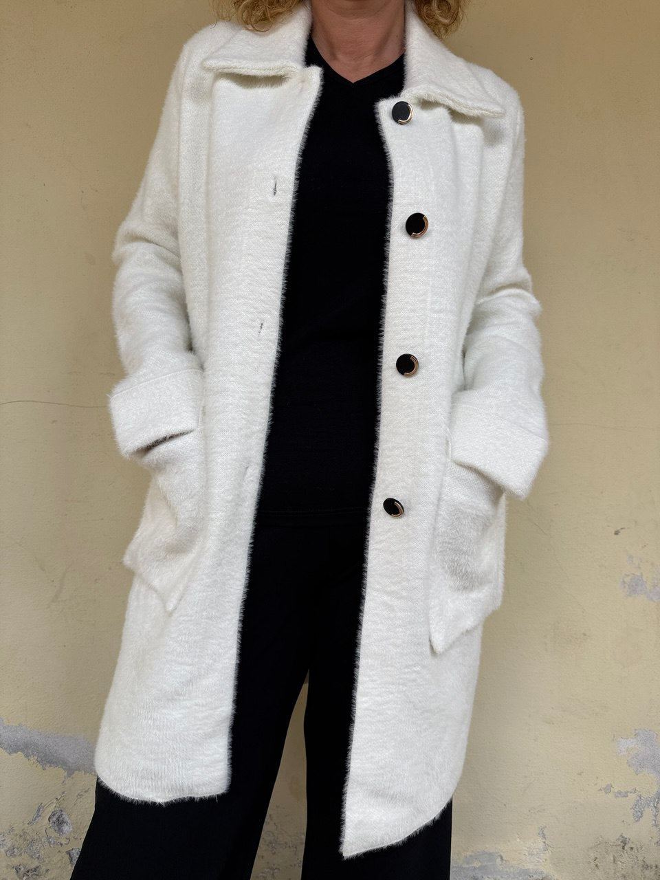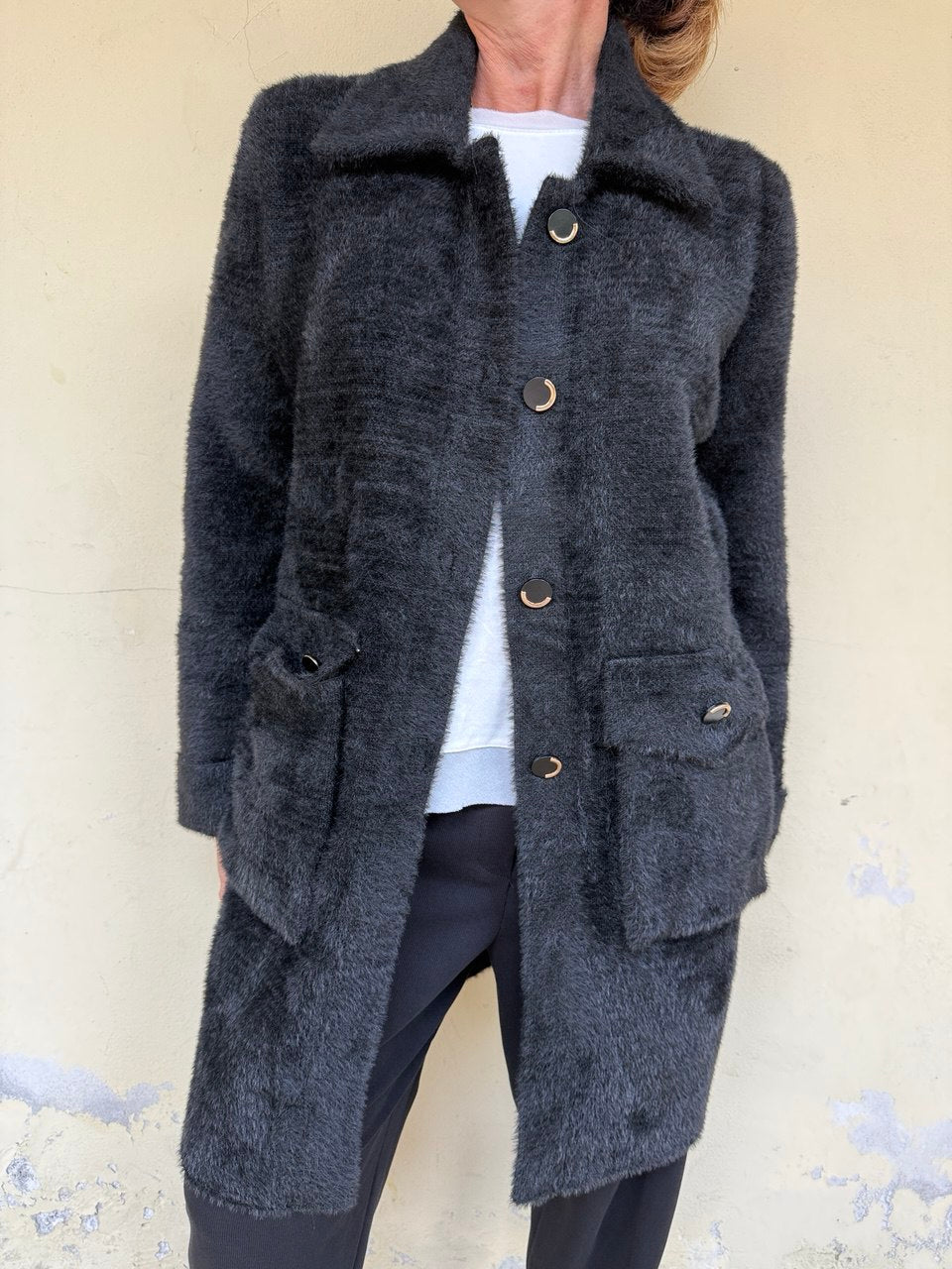 Cappotto in tessuto peloso super soft, collettino, chiusura con bottoni gioiello, manica con risvolto, tasche applicate con pattine, vestibilità dalla taglia 44 alla 48 abbondante