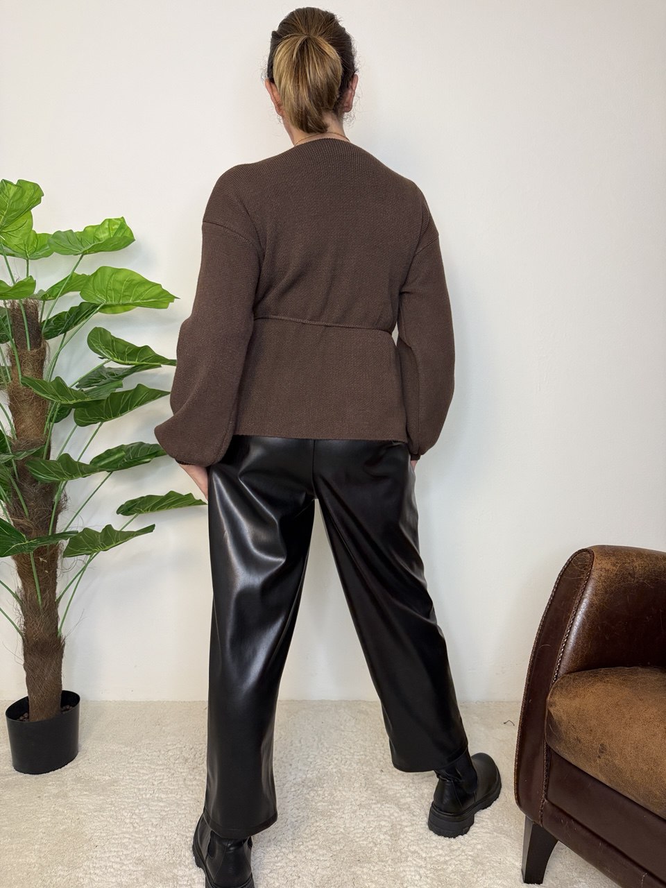 Cardigan incrociato con chiura un laccio all'interno e cinturina esterna, manica che scende leggermente a palloncino, vestibilità dalla taglia 44 alla 48