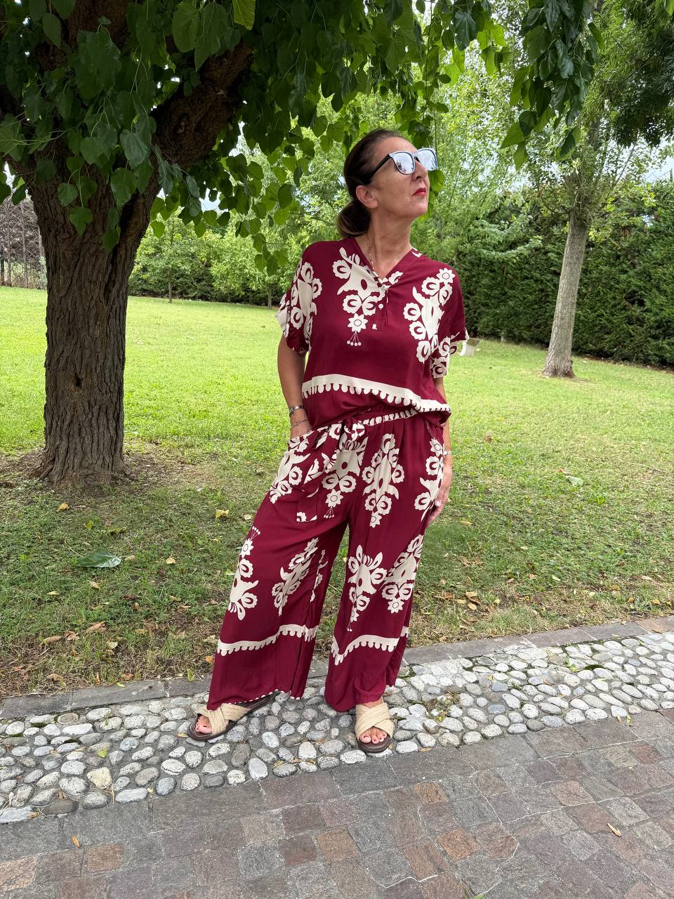 Questo completo in viscosa, composto da maglietta e pantalone, offre una vestibilità unica adatta fino alla taglia 52. Disponibile nei raffinati colori amarena e verde, unisce comfort e stile grazie al tessuto leggero e traspirante, ideale per chi cerca un look distintivo senza rinunciare alla praticità.