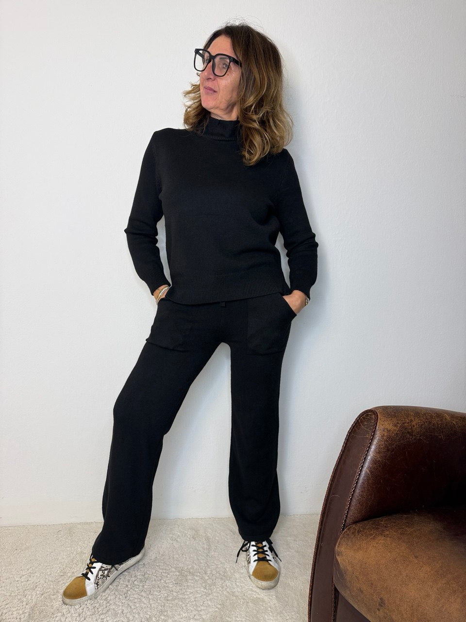 Coordinato in tessuto maglina elasticizzato soffice, confortevole e caldo composto da maglia con collo lupetto, piccoli spacchi laterali, più corta davanti e più lunga sul retro, pantalone a gamba larga e dritta con elastico in vita, cordoncino regolabile, tasche sul davanti, vestibilità coordinato dalla taglia 40 alla 46