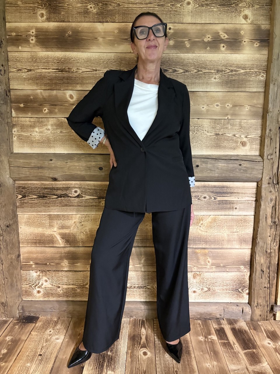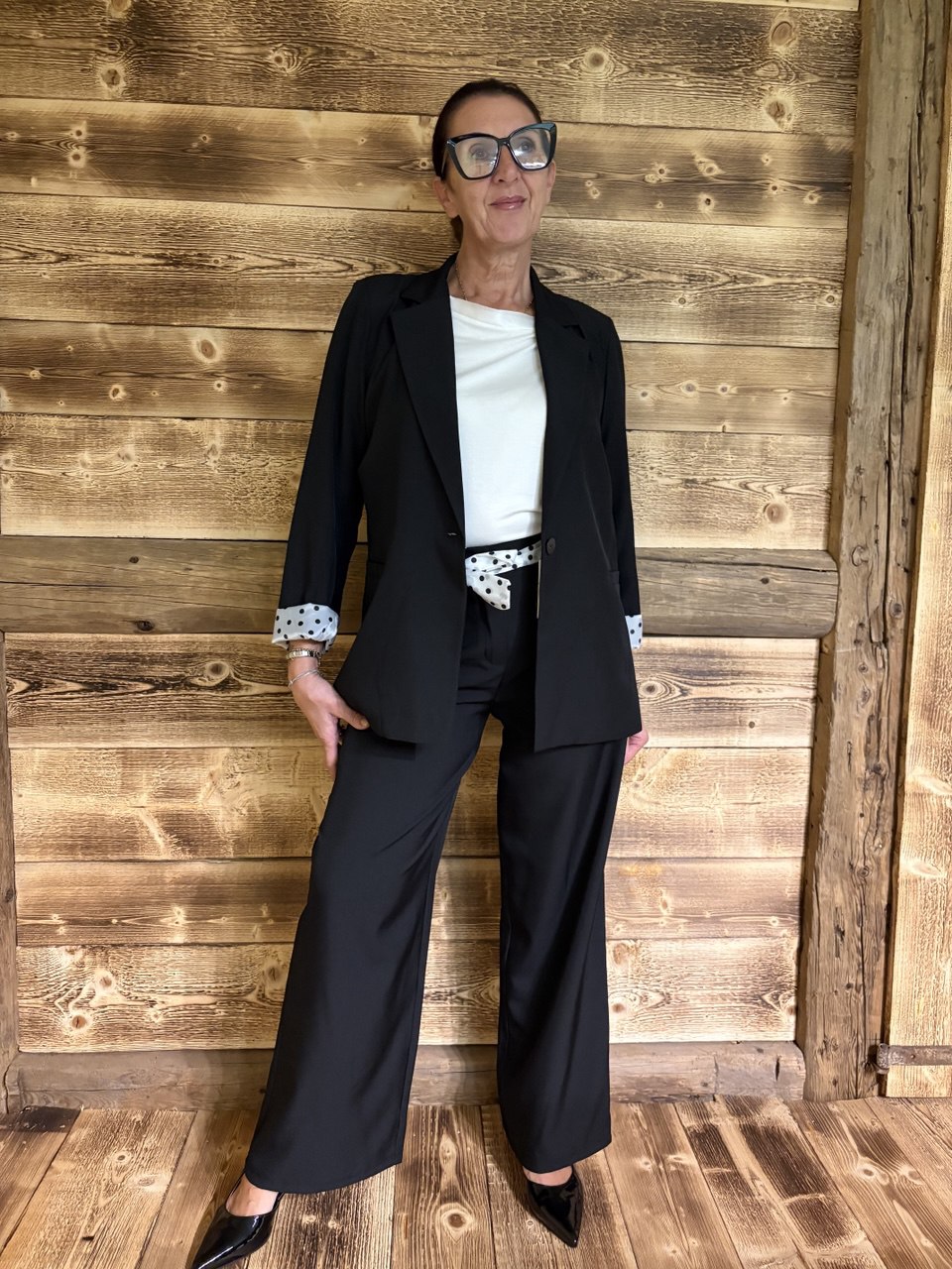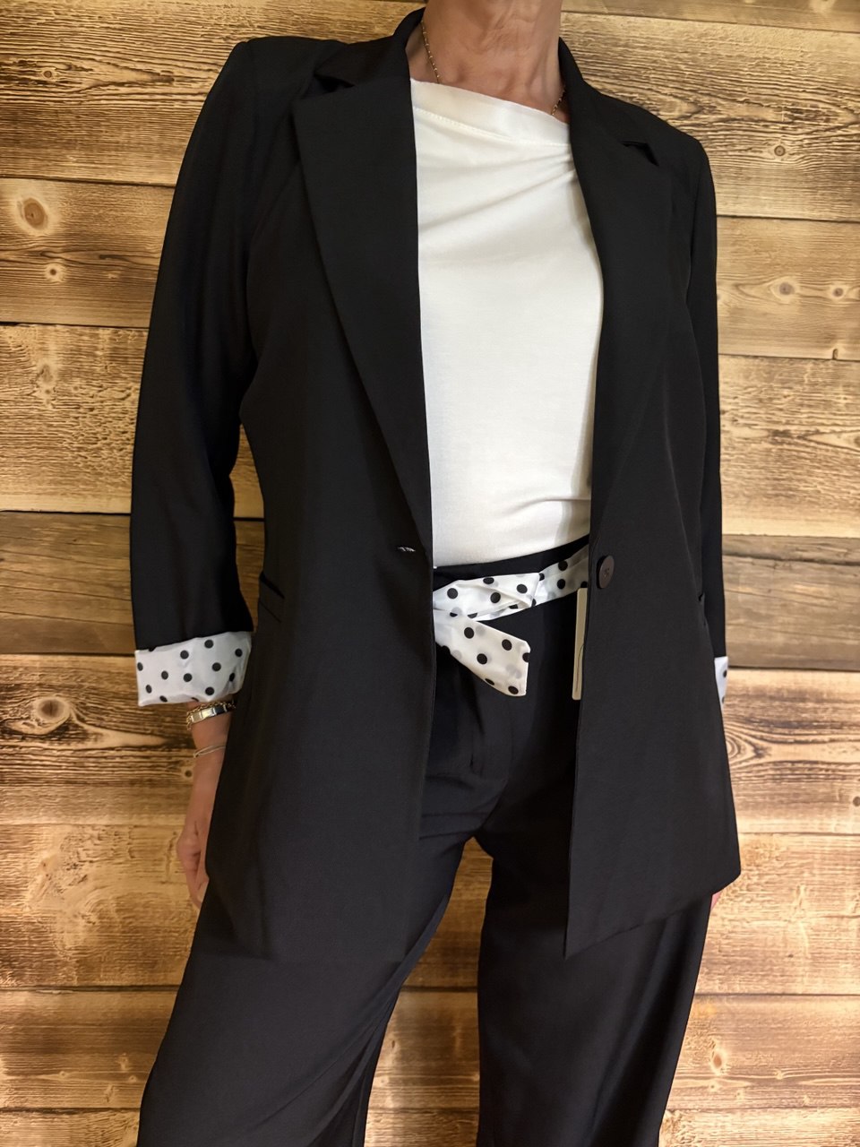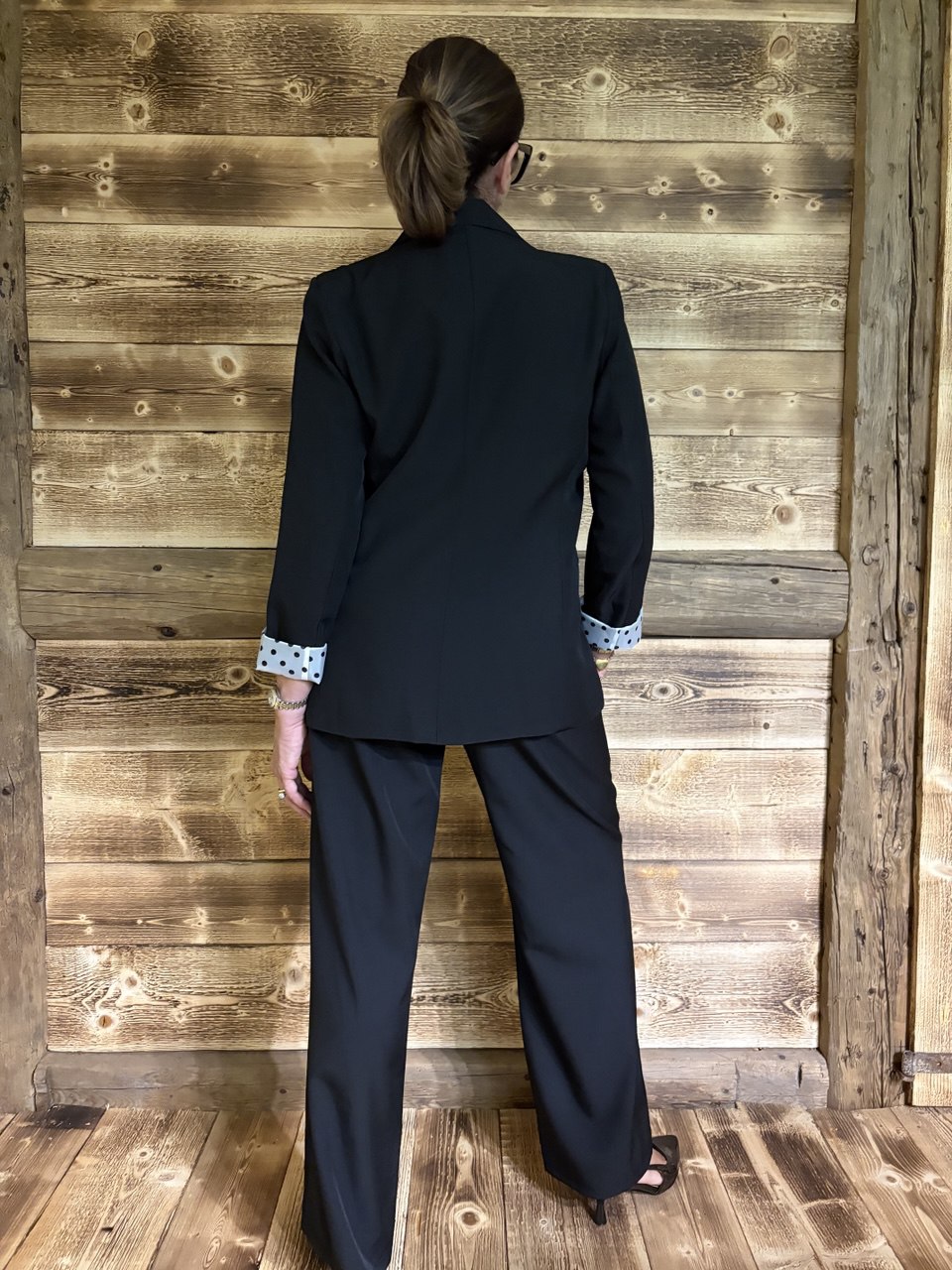 Coordinato composto da pantalone palazzo con cerniera e bottone, due piccole pence sul davanti, tasche, elastico sul retro e baschina sul davanti, giacca blazer con collo sport, chiusura a un bottone, leggermente sagomata, fodera e cintura a pois