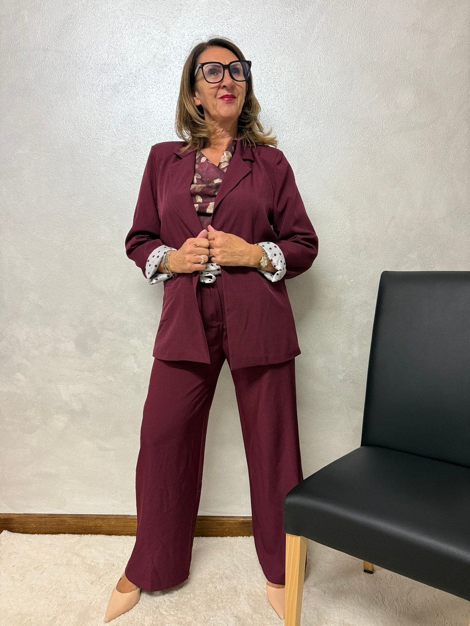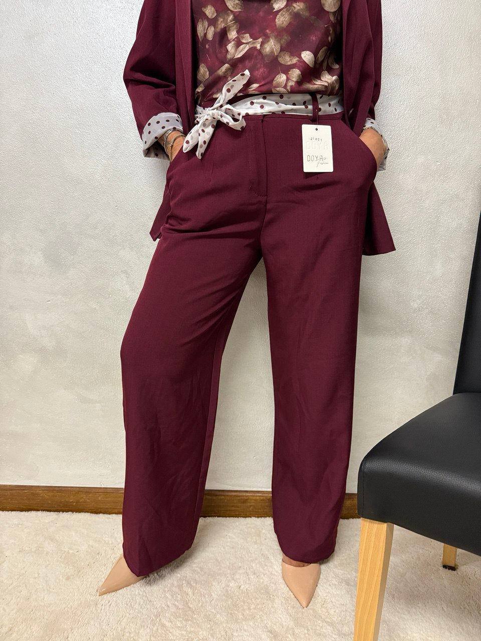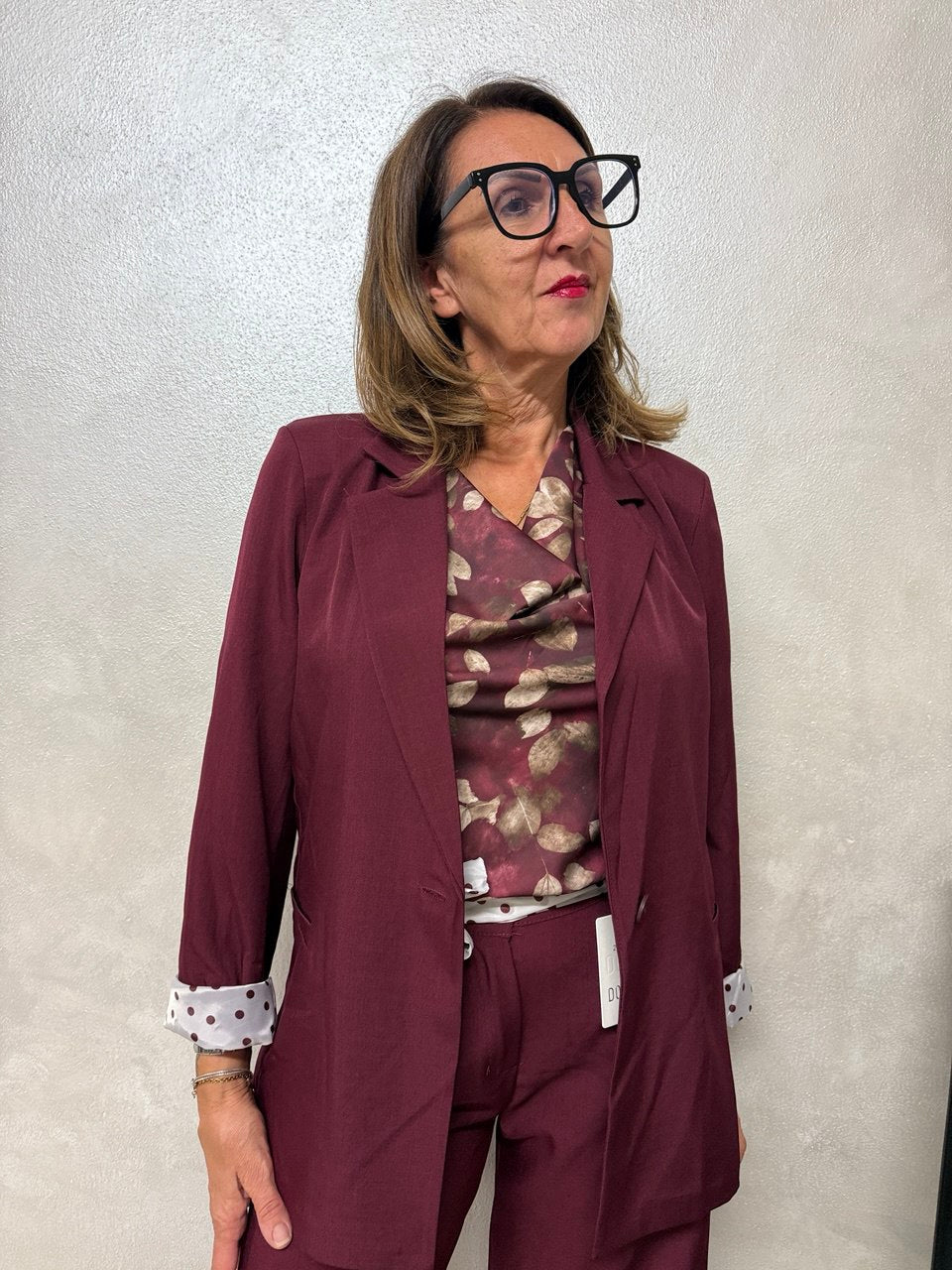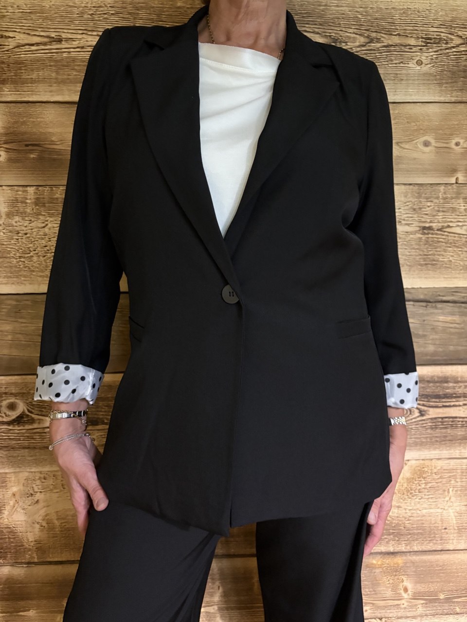 Coordinato composto da pantalone palazzo con cerniera e bottone, due piccole pence sul davanti, tasche, elastico sul retro e baschina sul davanti, giacca blazer con collo sport, chiusura a un bottone, leggermente sagomata, fodera e cintura a pois