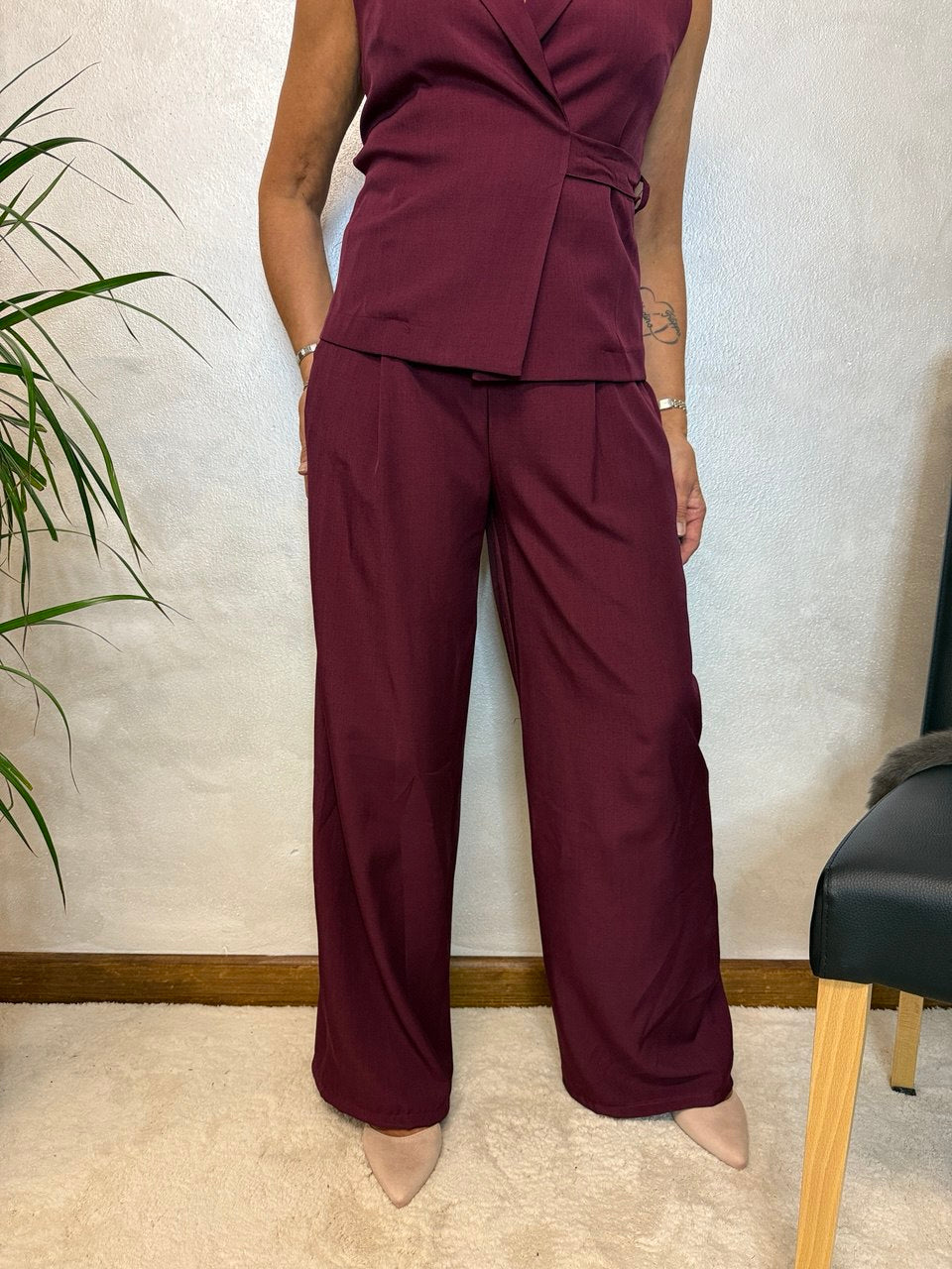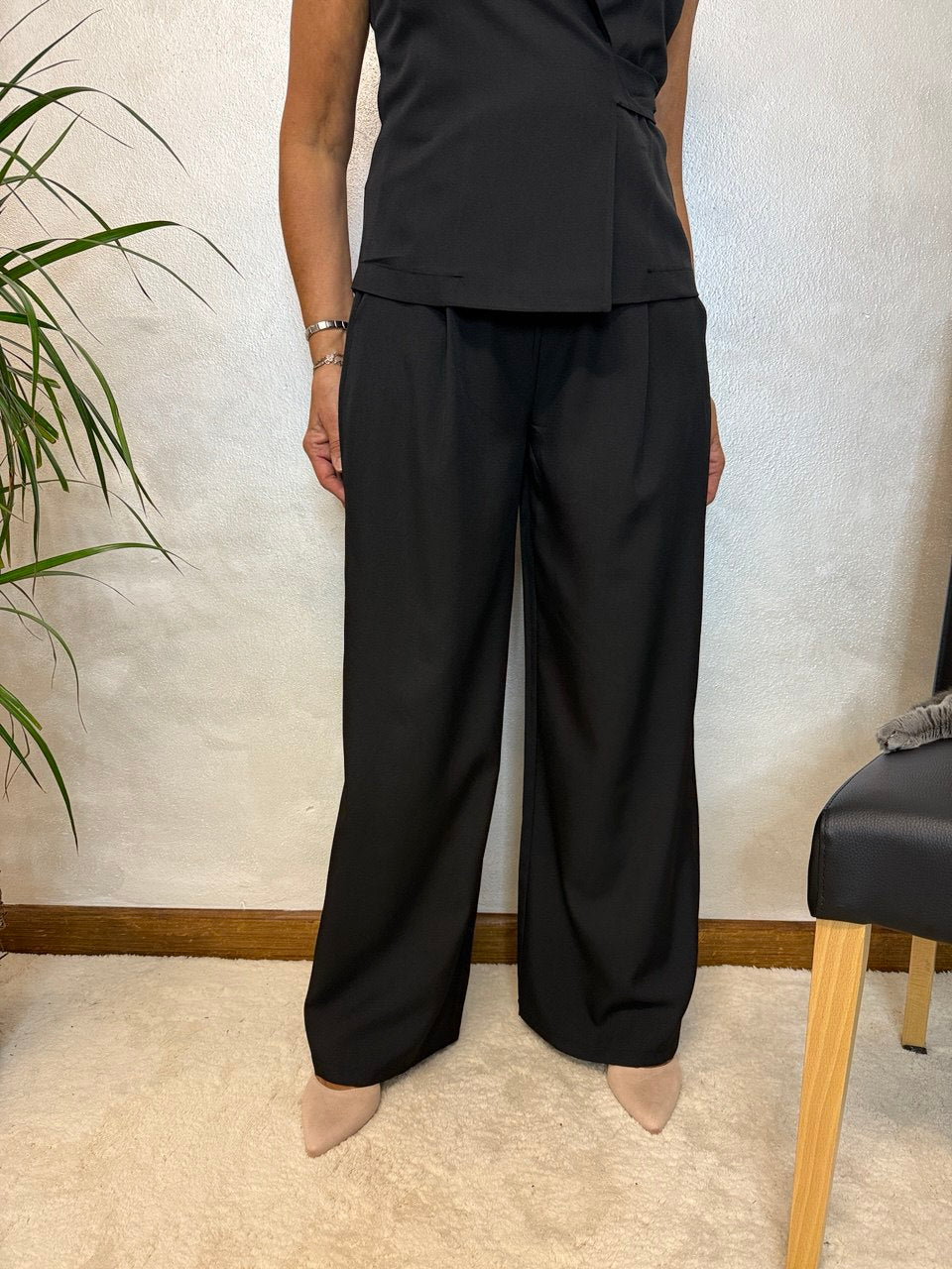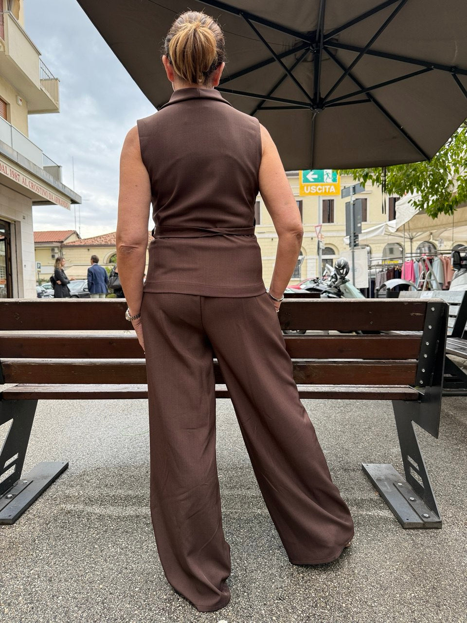 Coordinato composto da: pantalone palazzo, baschina sul davanti, elastico sulla parte posteriore, tasche, due pence frontali; gilet con scollo a scialle, incrociato, regolabile con nastro sul retro