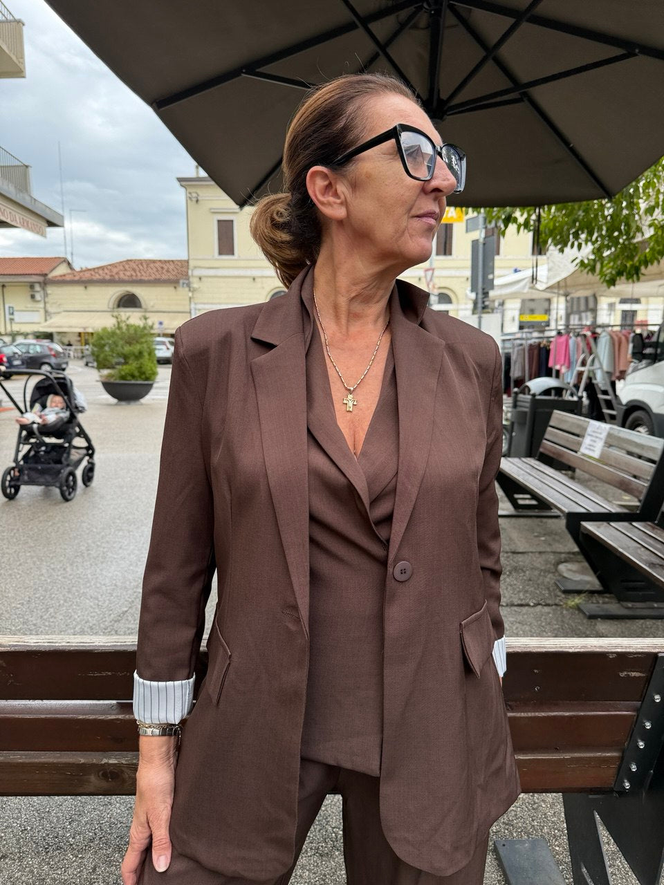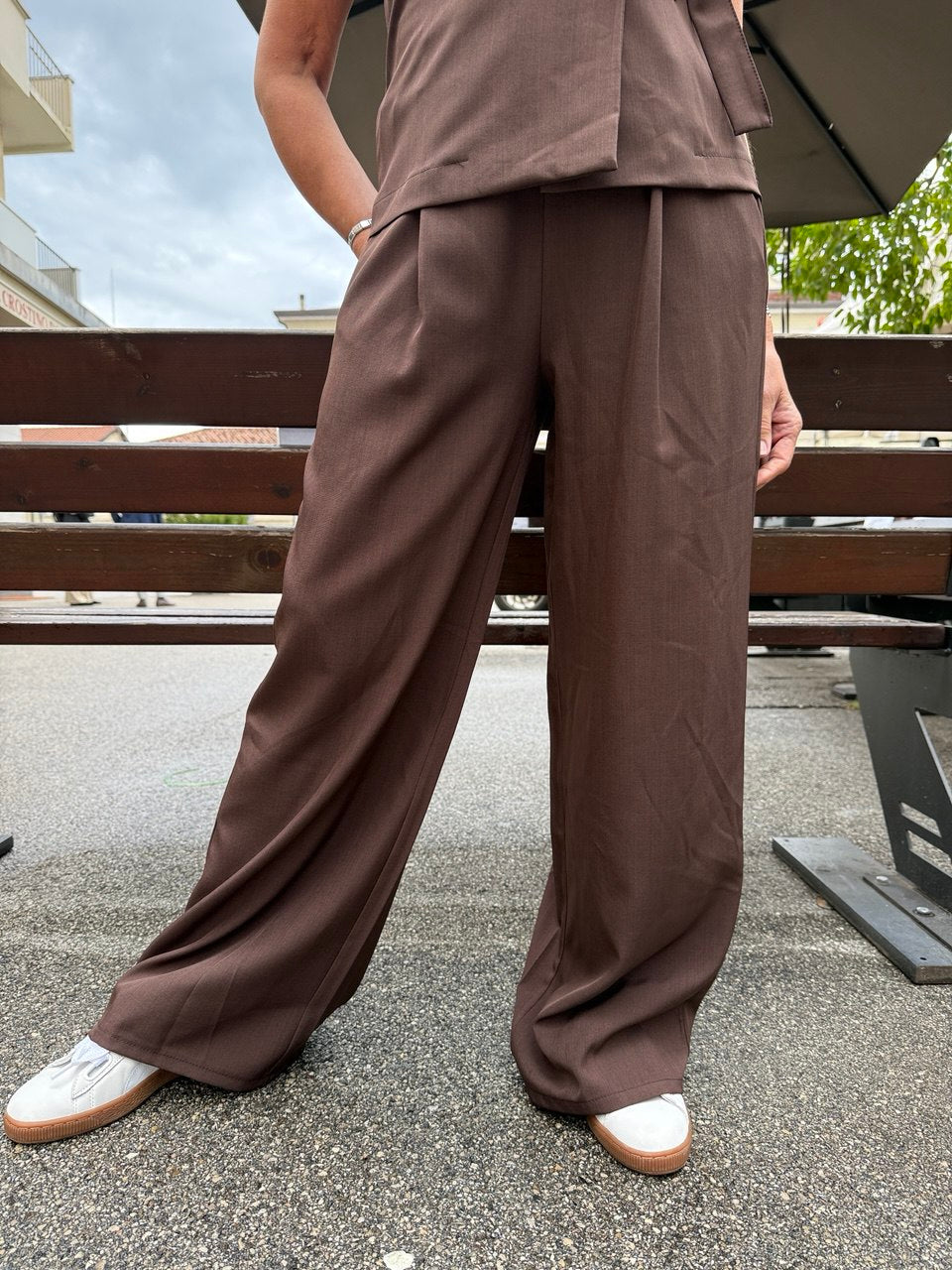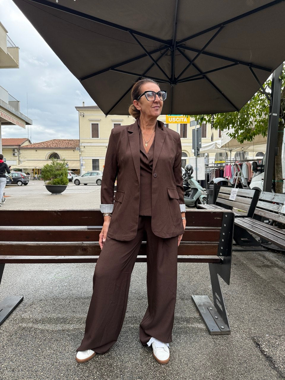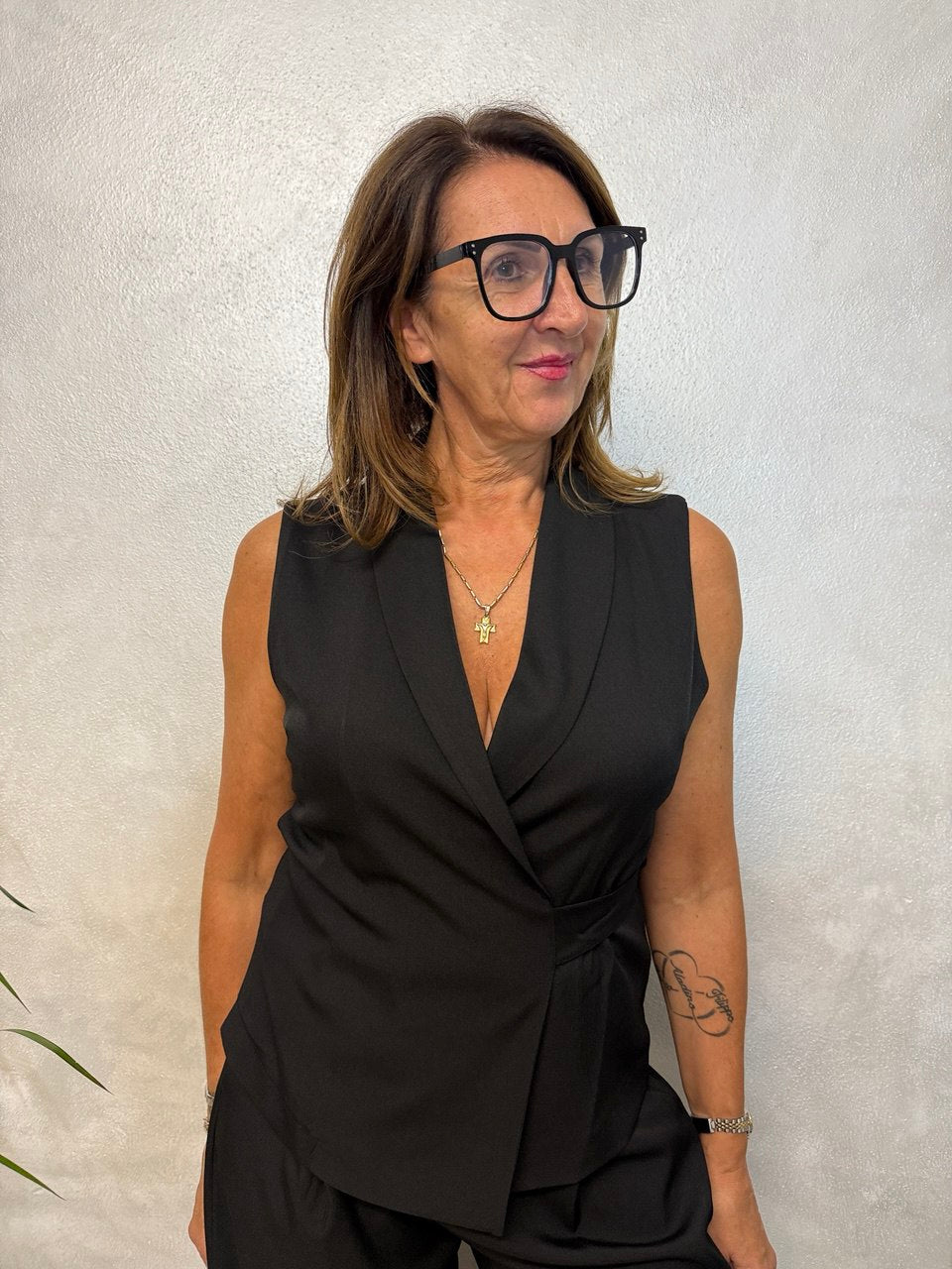 Coordinato composto da: pantalone palazzo, baschina sul davanti, elastico sulla parte posteriore, tasche, due pence frontali; gilet con scollo a scialle, incrociato, regolabile con nastro sul retro