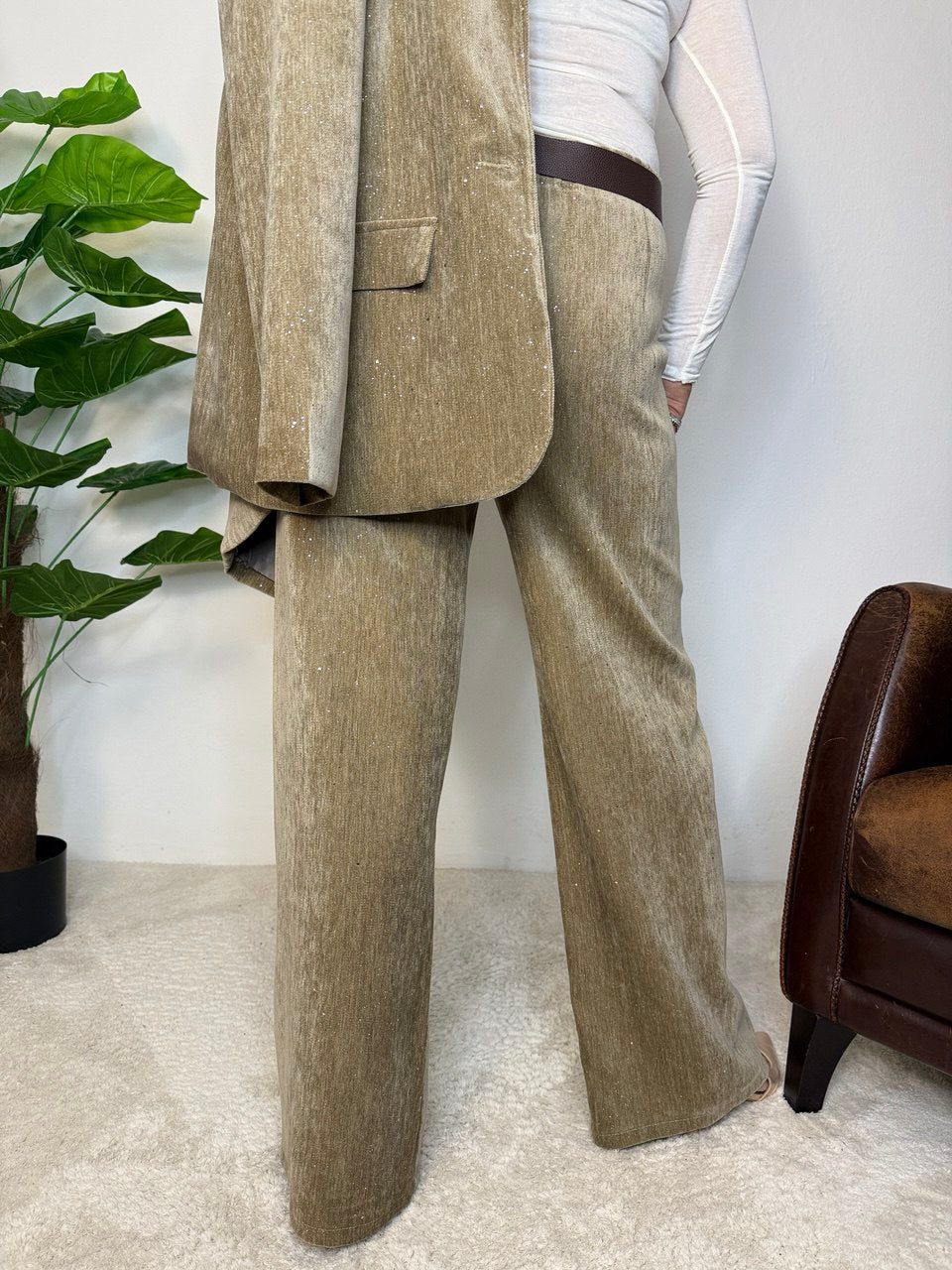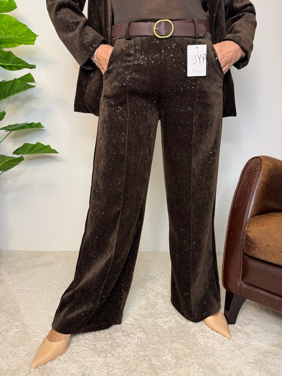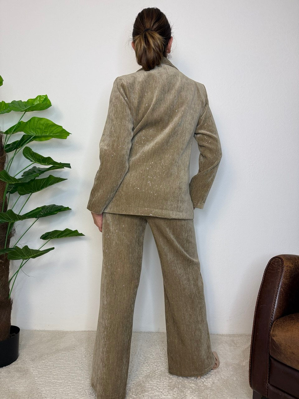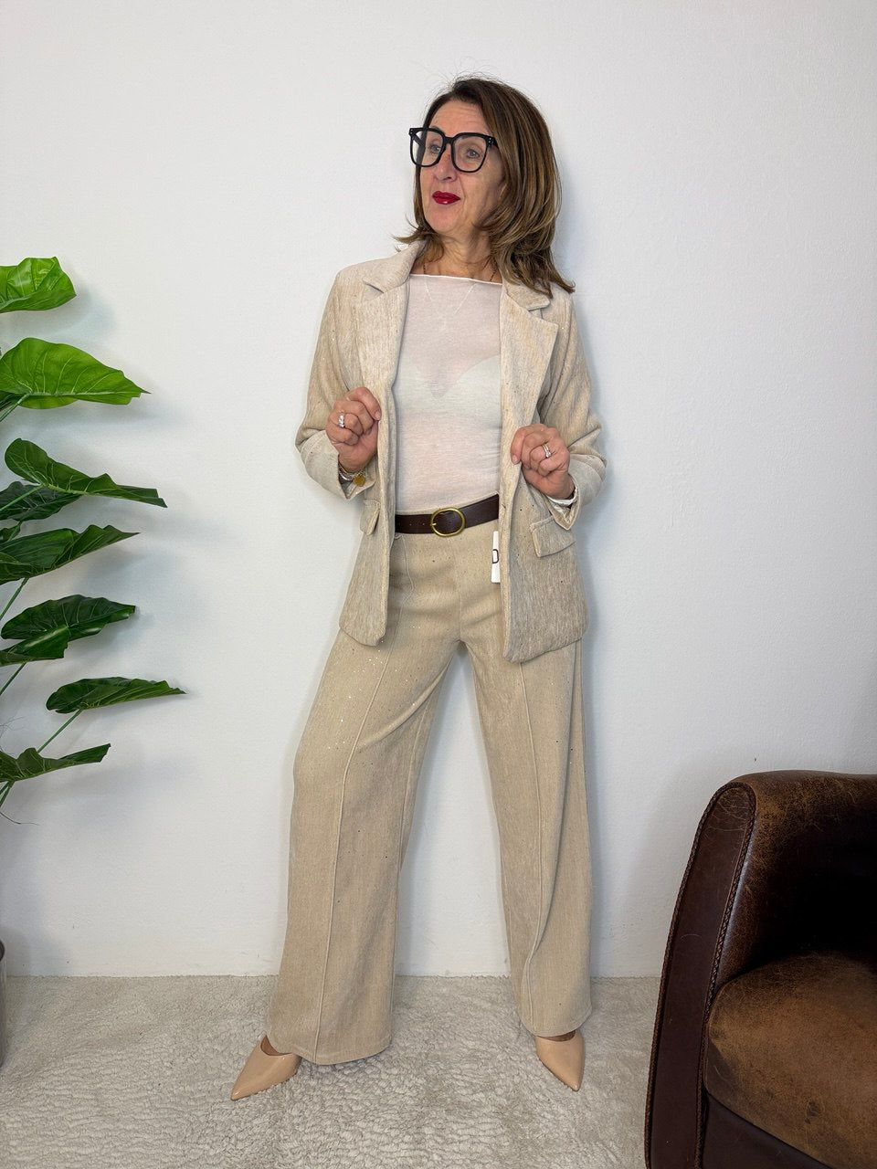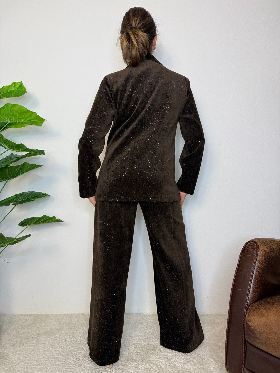 Coordinato in tessuto velluto liscio tempestato di micro paillettes composto da pantalone palazzo a vita alta, baschina sul davanti ed elastico sul retro, tasche, cucitura di bellezza solo sul davanti, tasche, cinturina compresa, blazer foderato con collo sport, pattine, un bottone di chiusura, spalline leggermente imbottite, vestibilità coordinato dalla taglia 44 alla 46