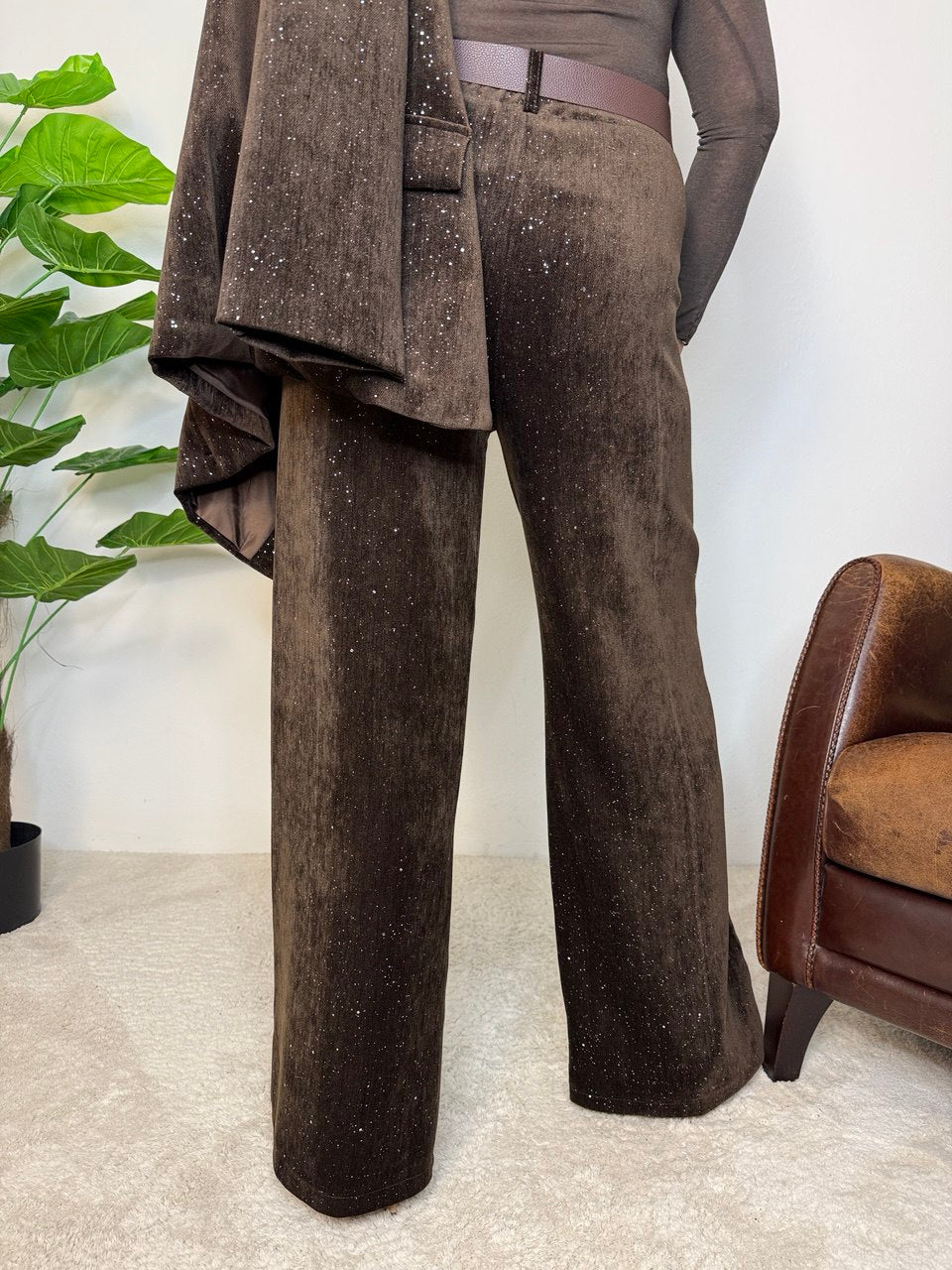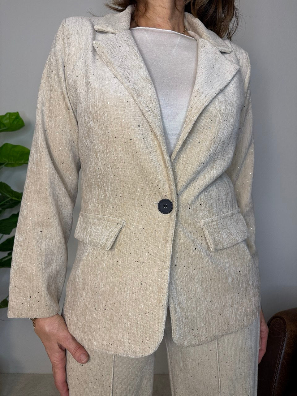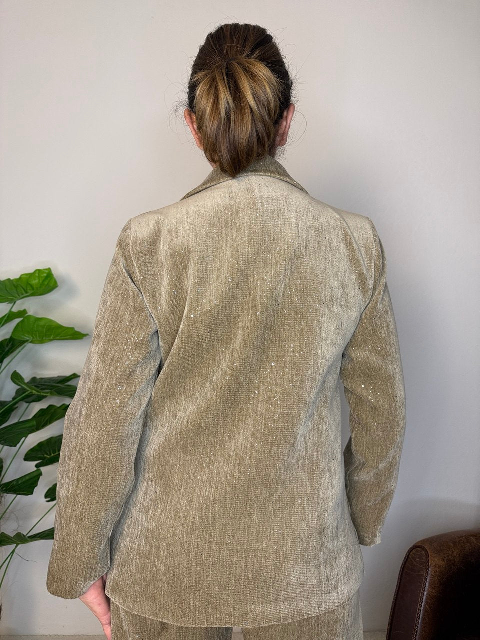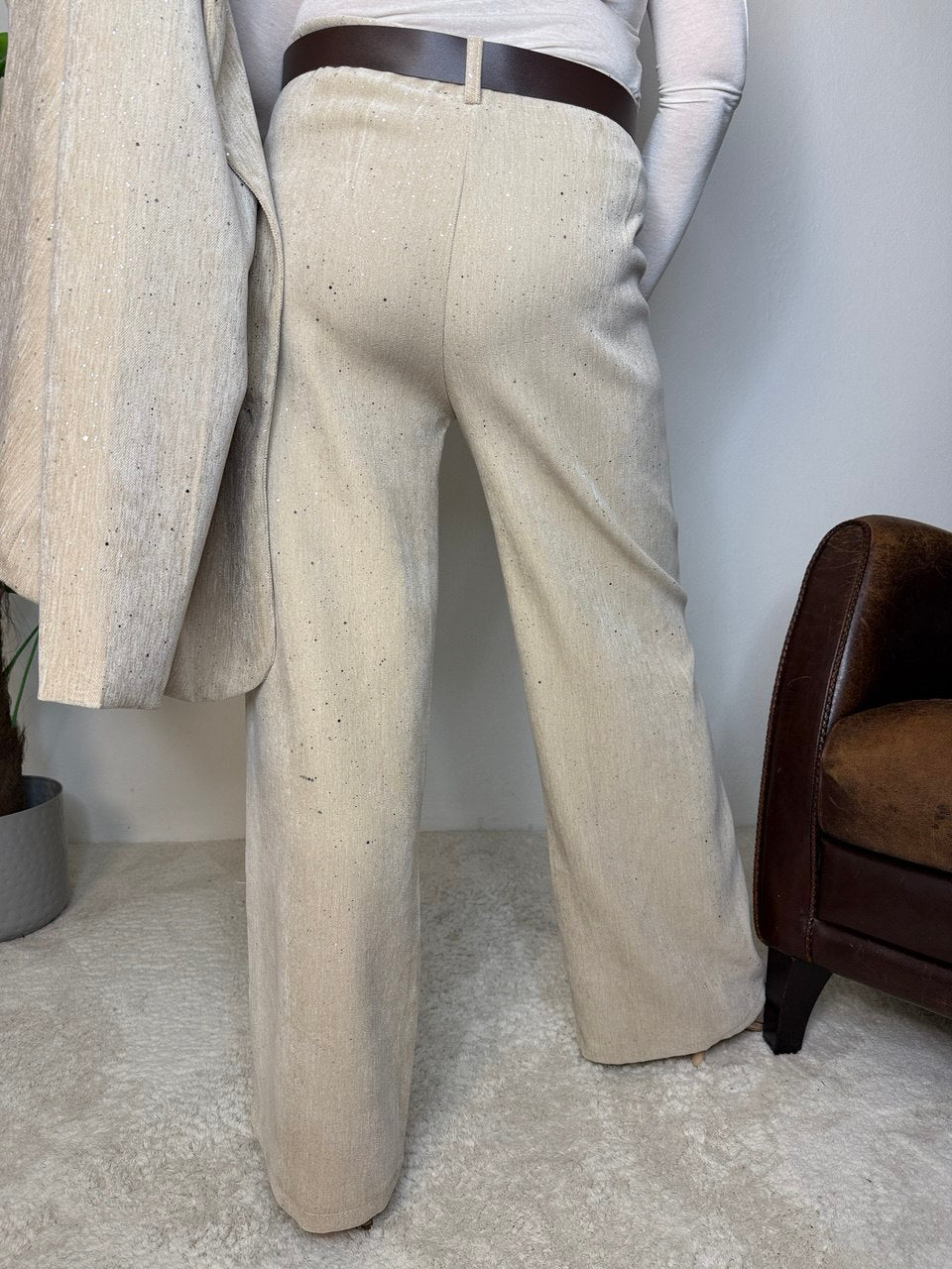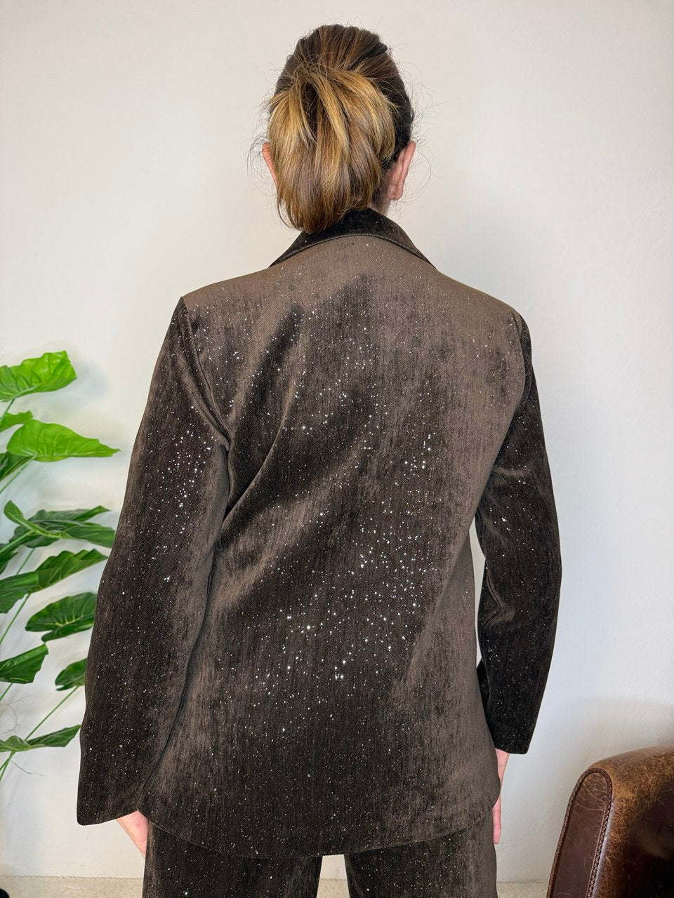 Coordinato in tessuto velluto liscio tempestato di micro paillettes composto da pantalone palazzo a vita alta, baschina sul davanti ed elastico sul retro, tasche, cucitura di bellezza solo sul davanti, tasche, cinturina compresa, blazer foderato con collo sport, pattine, un bottone di chiusura, spalline leggermente imbottite, vestibilità coordinato dalla taglia 44 alla 46