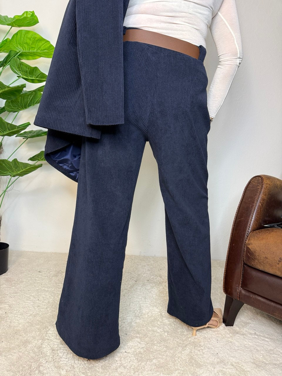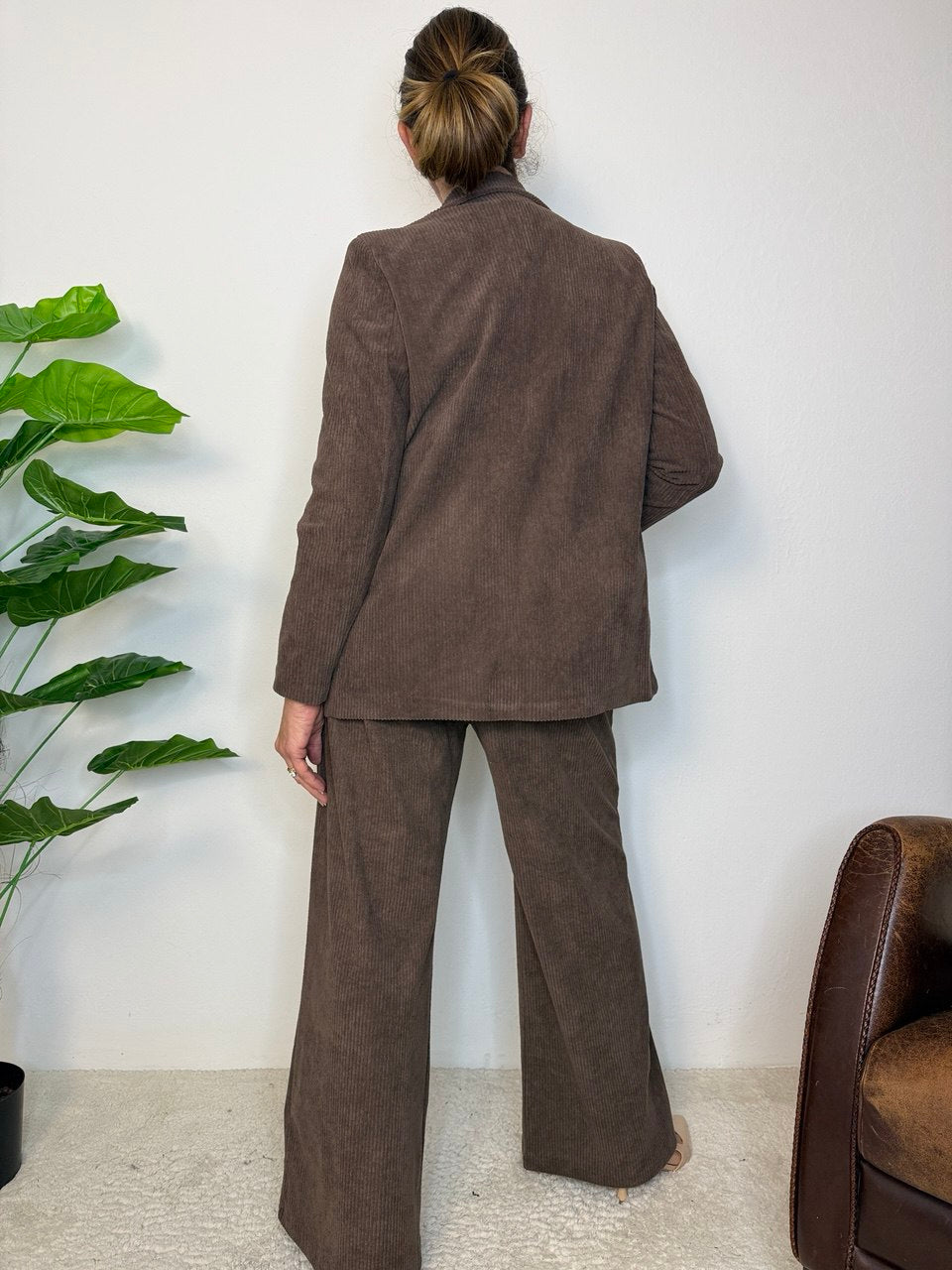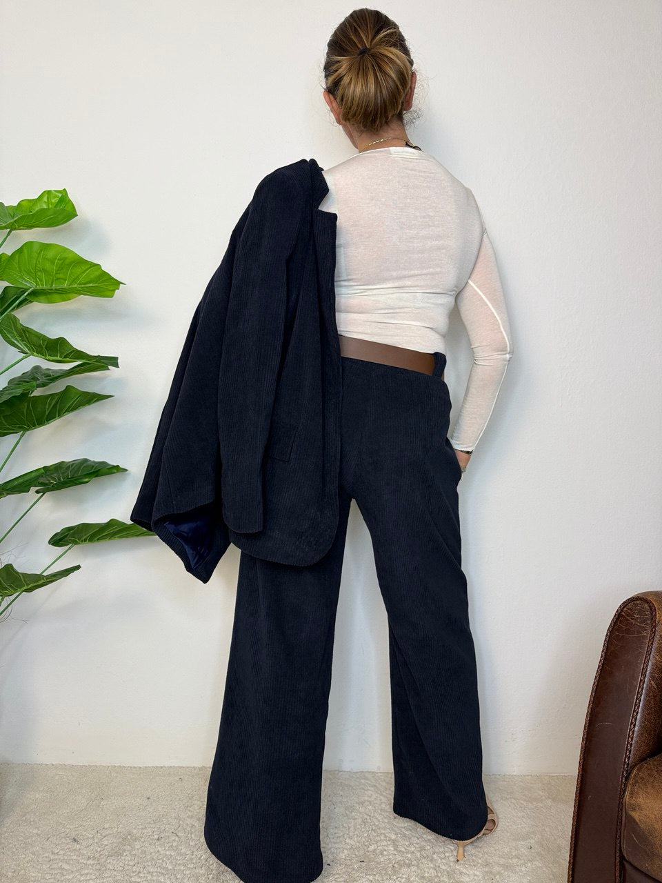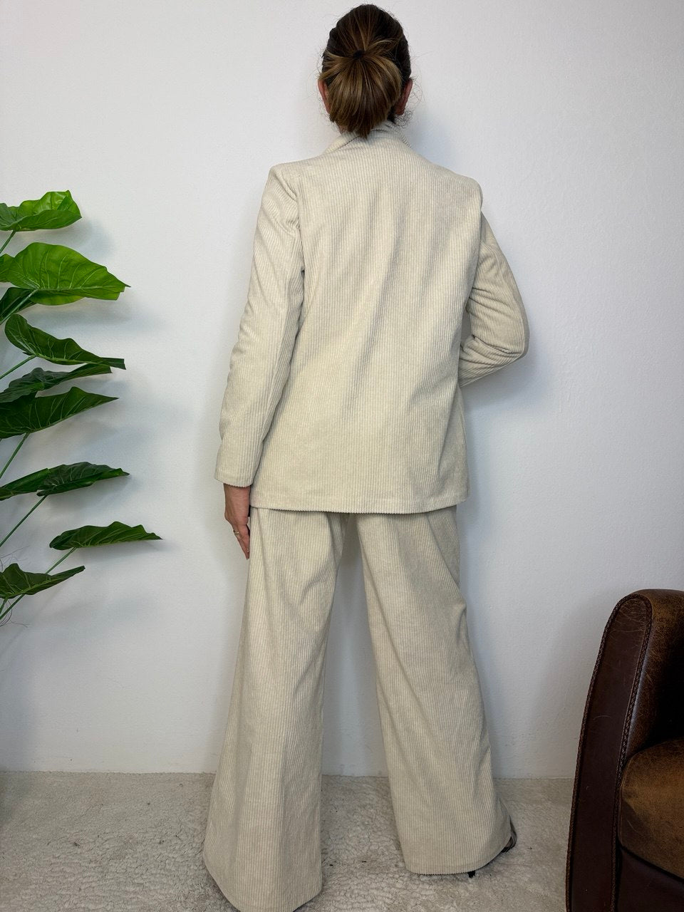 Coordinato in velluto a costine composto da pantalone a palazzo con elastico in vita, due piccole pence sul davanti, tasche, cintura compresa, blazer foderato con chiusura ad un bottone, pattine sul davanti, spalline imbottito, vestibilità coordinato dalla taglia 44 alla 46 abbondante