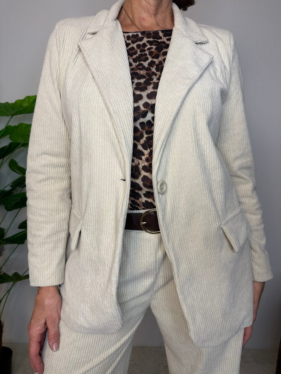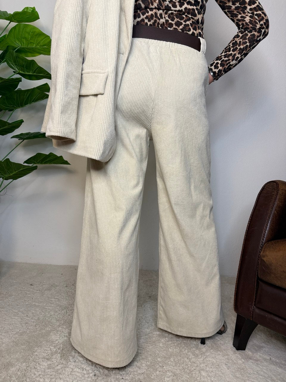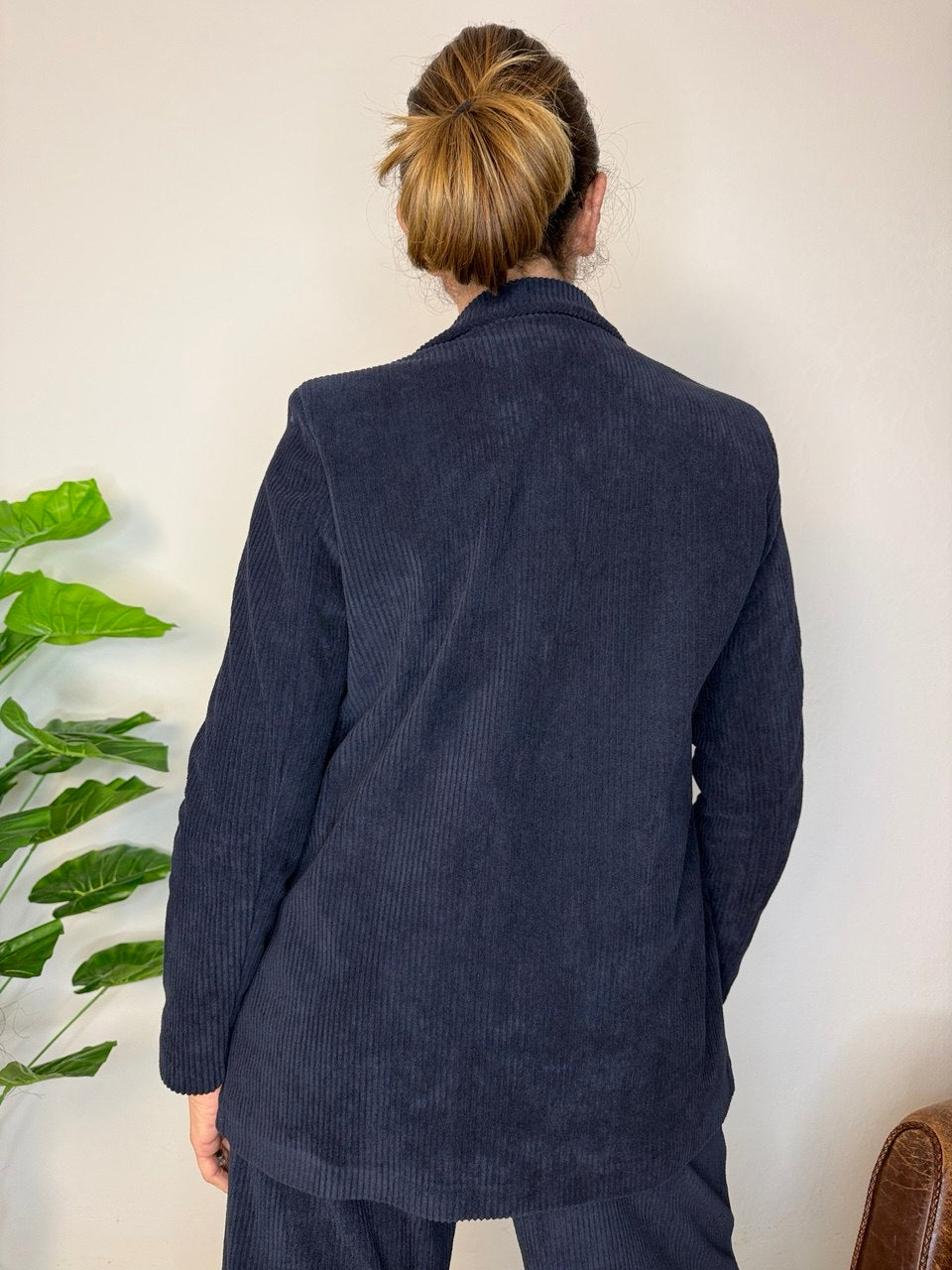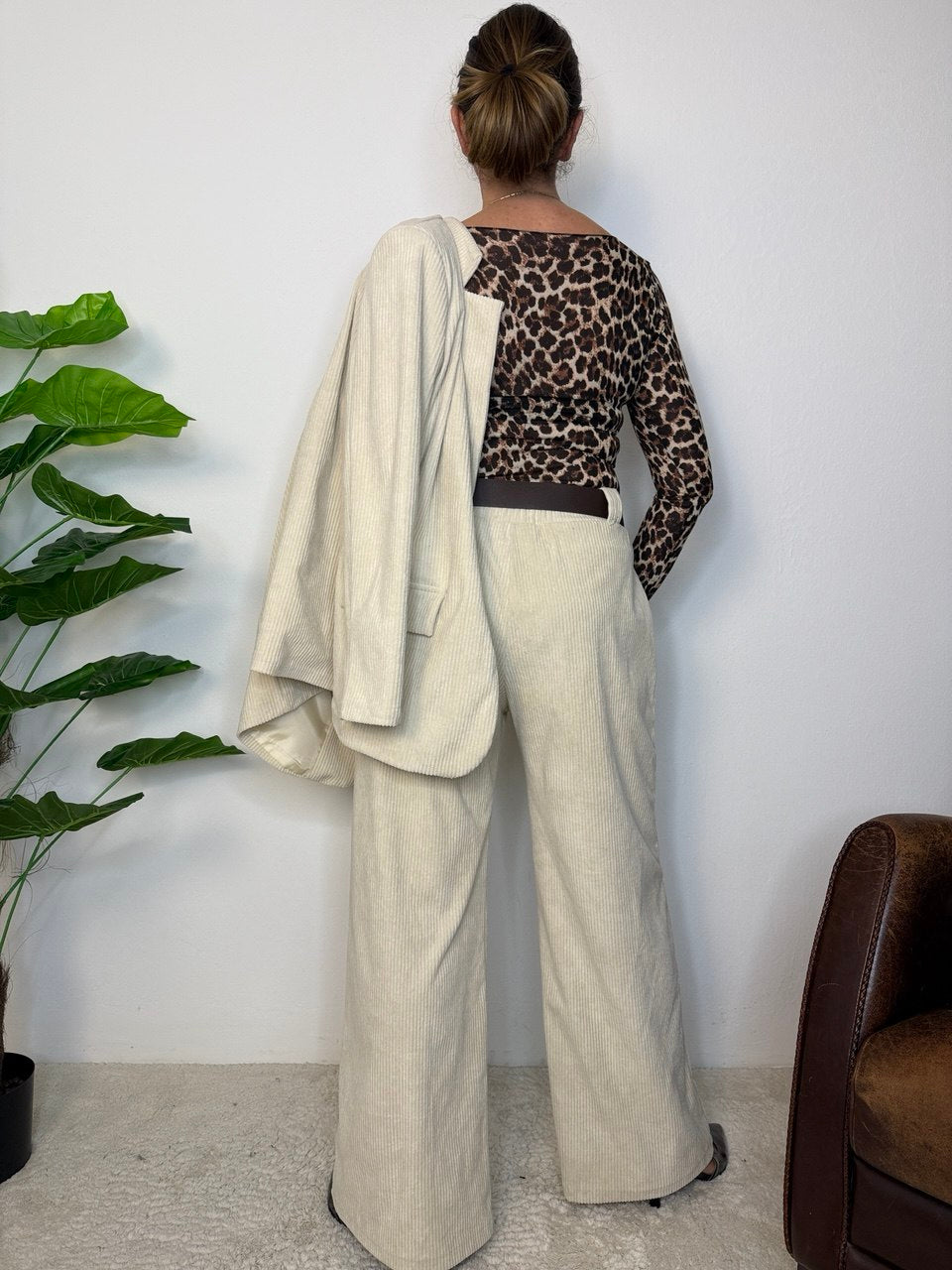Coordinato in velluto a costine composto da pantalone a palazzo con elastico in vita, due piccole pence sul davanti, tasche, cintura compresa, blazer foderato con chiusura ad un bottone, pattine sul davanti, spalline imbottito, vestibilità coordinato dalla taglia 44 alla 46 abbondante