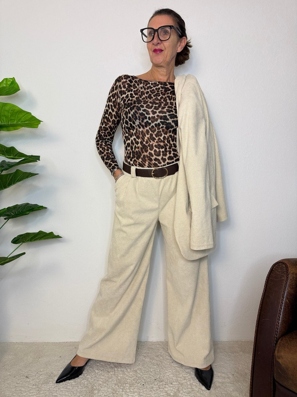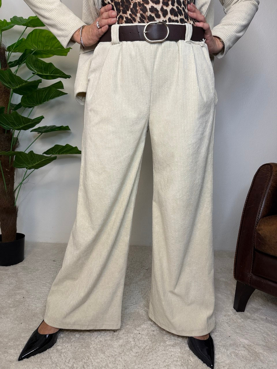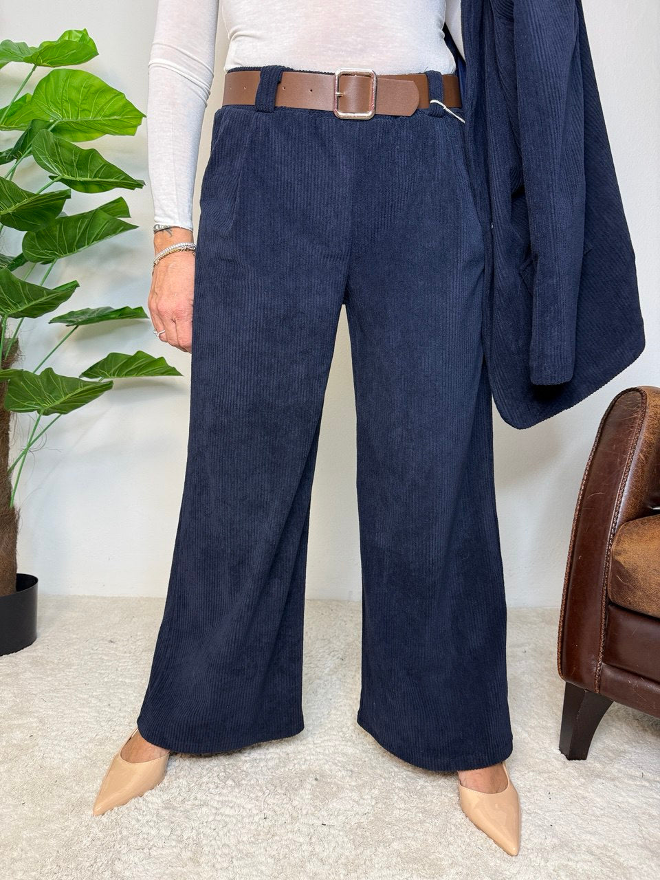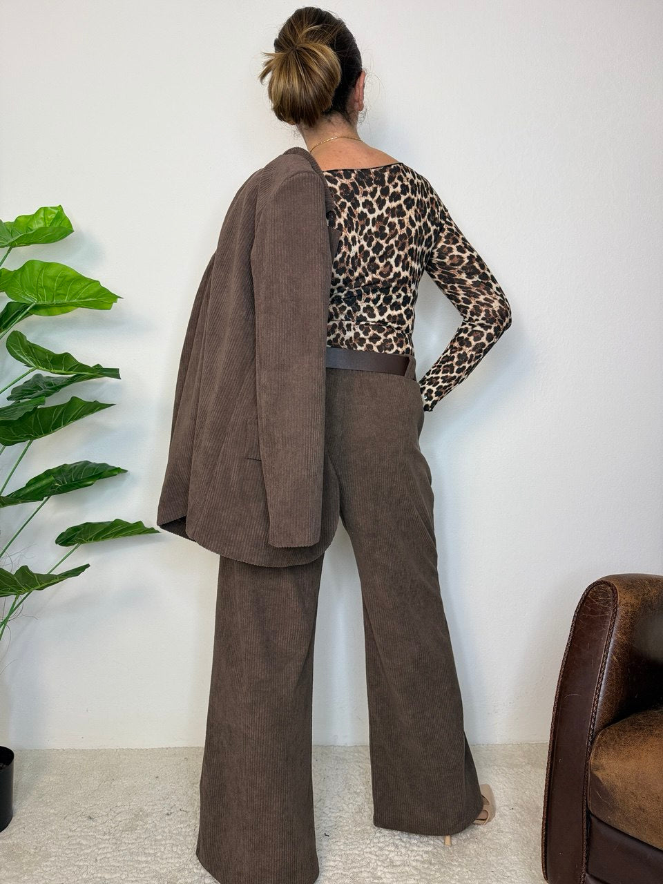 Coordinato in velluto a costine composto da pantalone a palazzo con elastico in vita, due piccole pence sul davanti, tasche, cintura compresa, blazer foderato con chiusura ad un bottone, pattine sul davanti, spalline imbottito, vestibilità coordinato dalla taglia 44 alla 46 abbondante