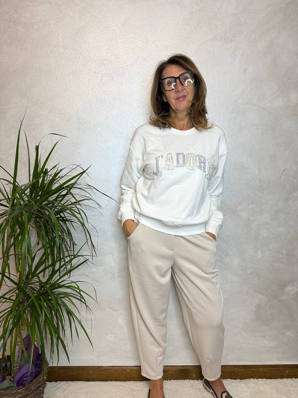 Felpa girocollo in cotone con tubolare nel polso e nel fondo, dettaglio scritta "Jadore" lavorata con paillettes e perline, vestibilità morbida dalla taglia 42 alla 46