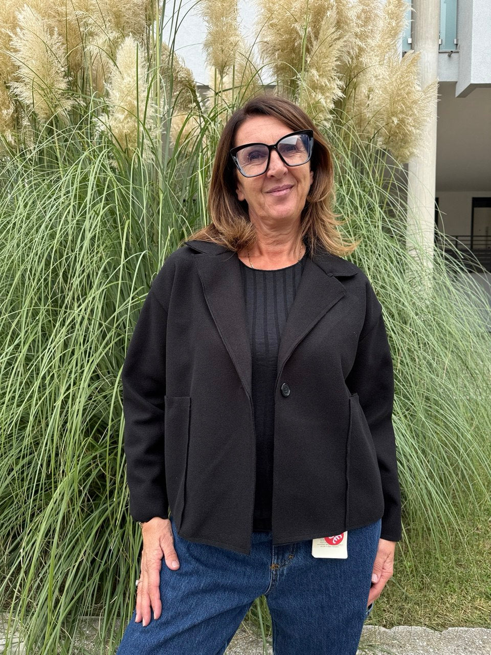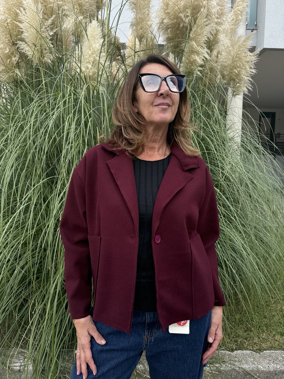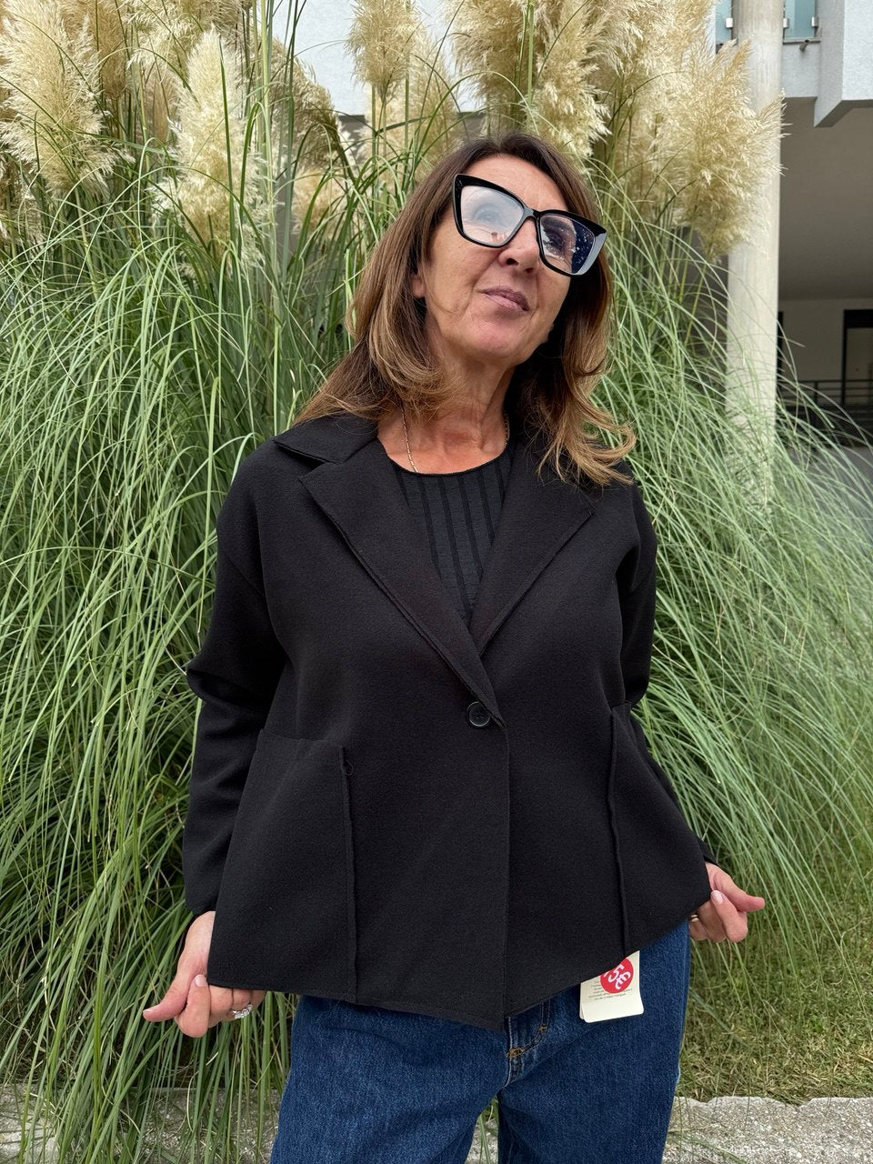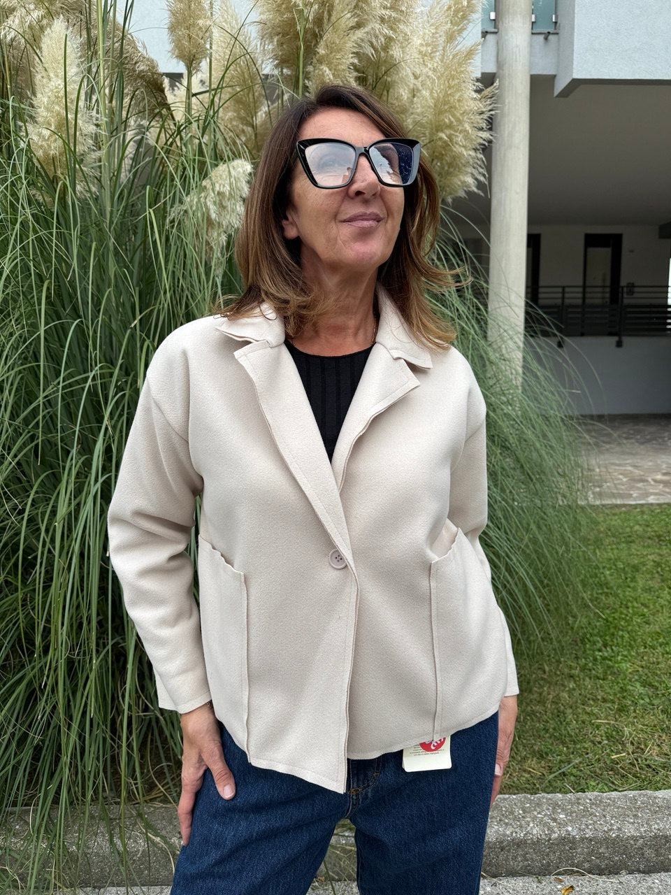 Giacca in tessuto panno a mezza stagione, collo sport, chiusura ad un bottone, tasche, giro manica che scende, taglio ad orlo vivo, vestibilità over dalla taglia 44 alla 48