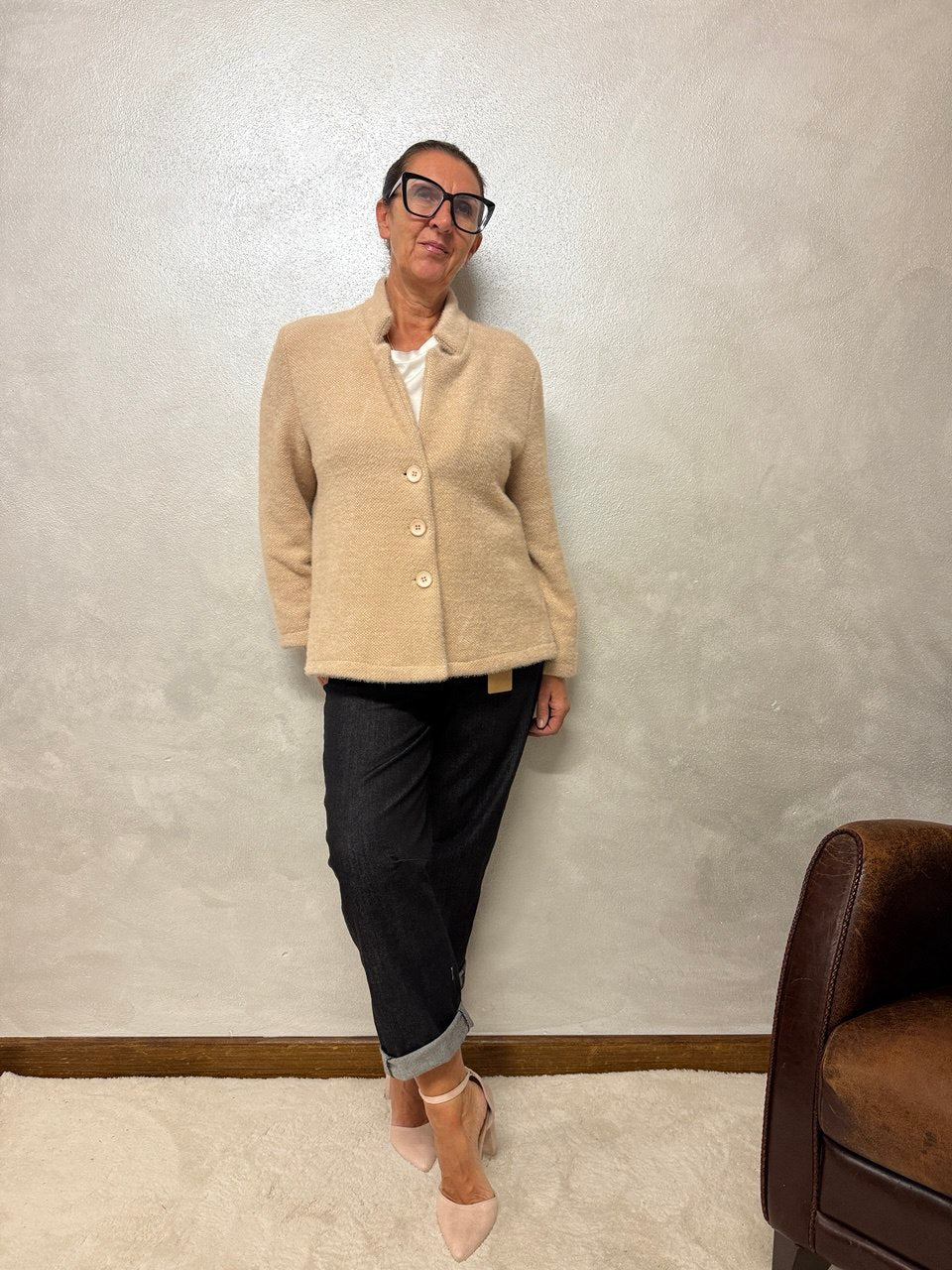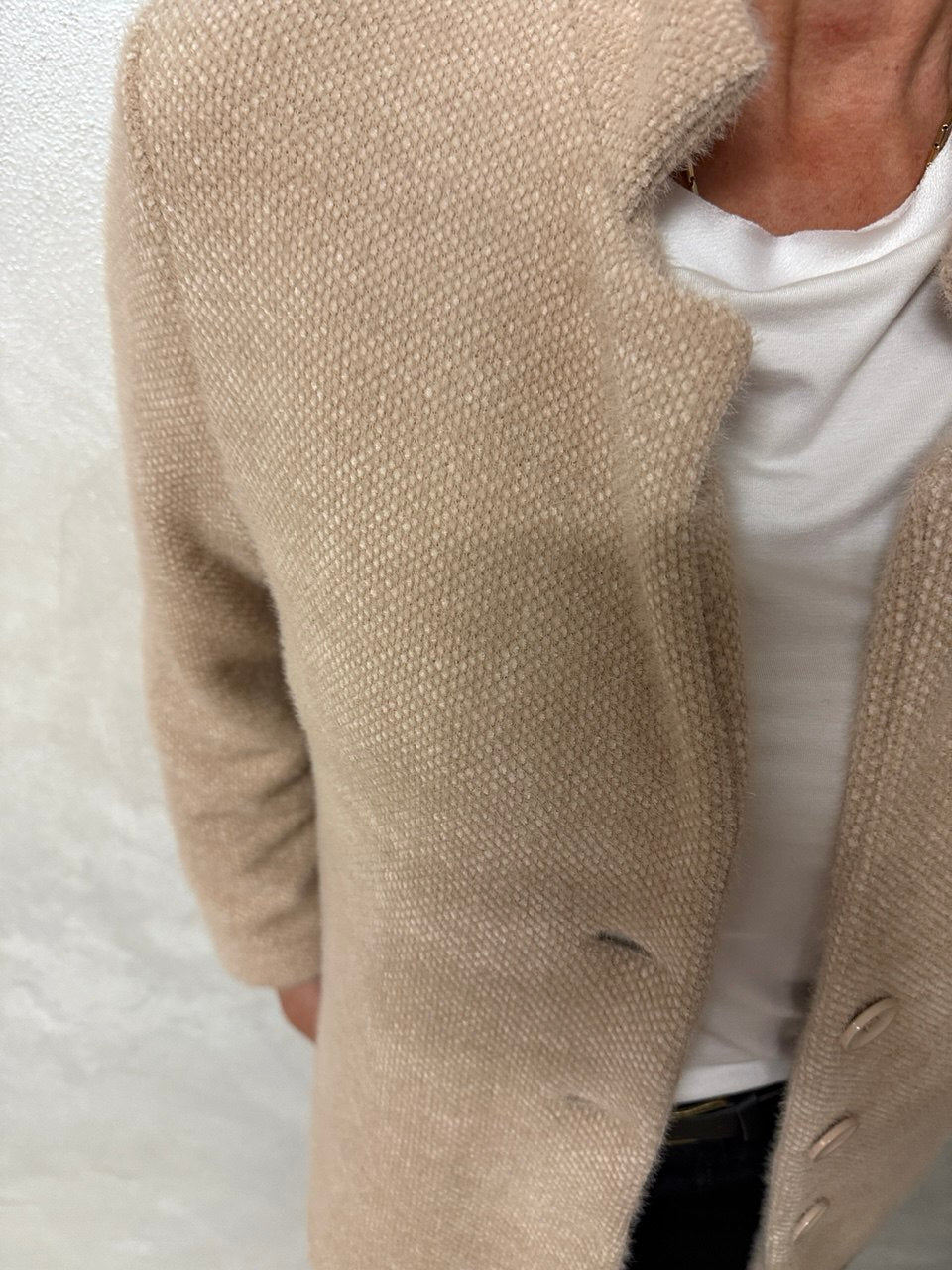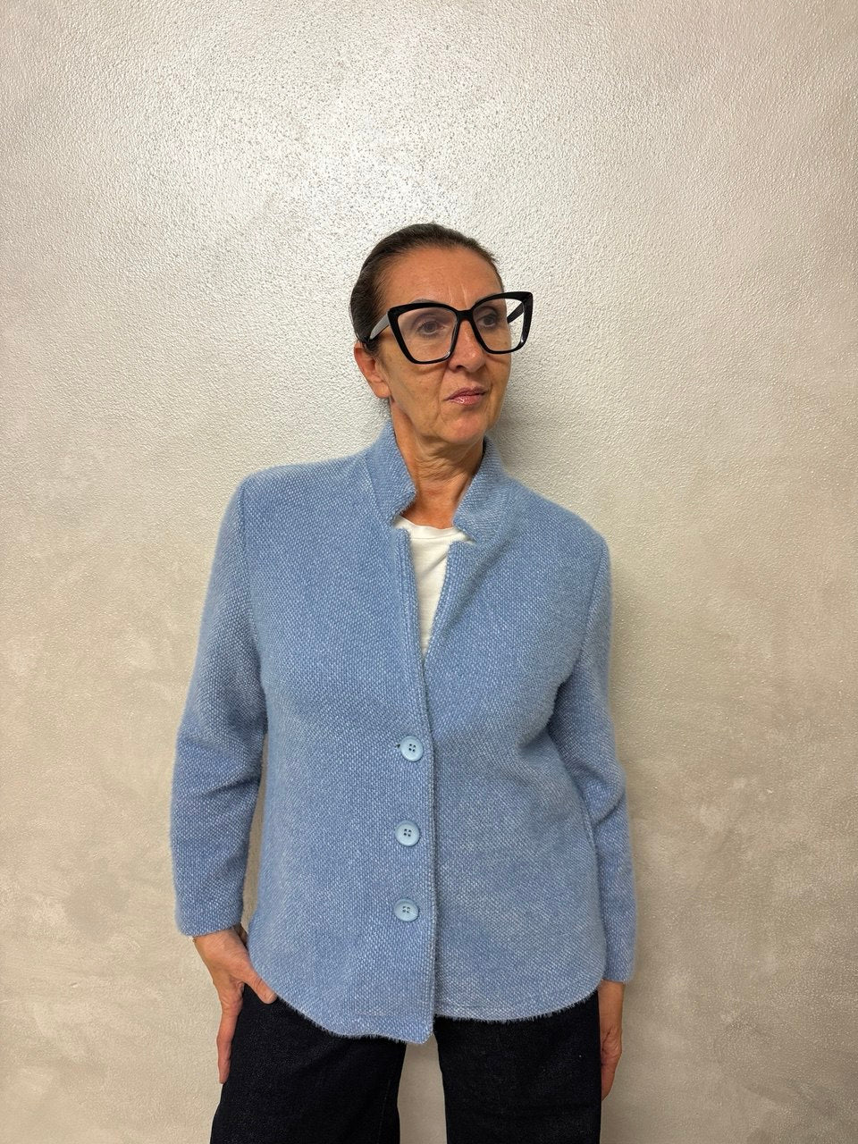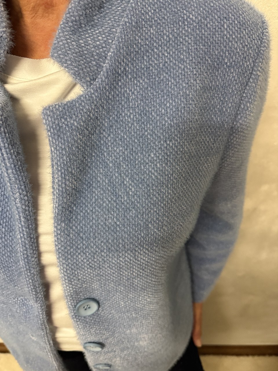 Giacca con collo sport, effetto peloso, chiusura a tre bottoni, tessuto soffice, vestibilità morbida