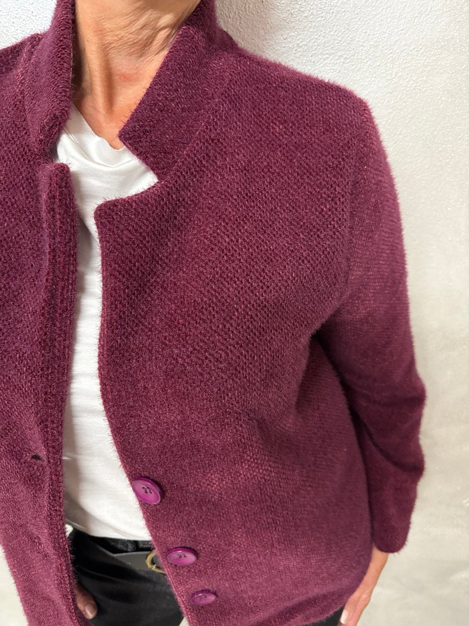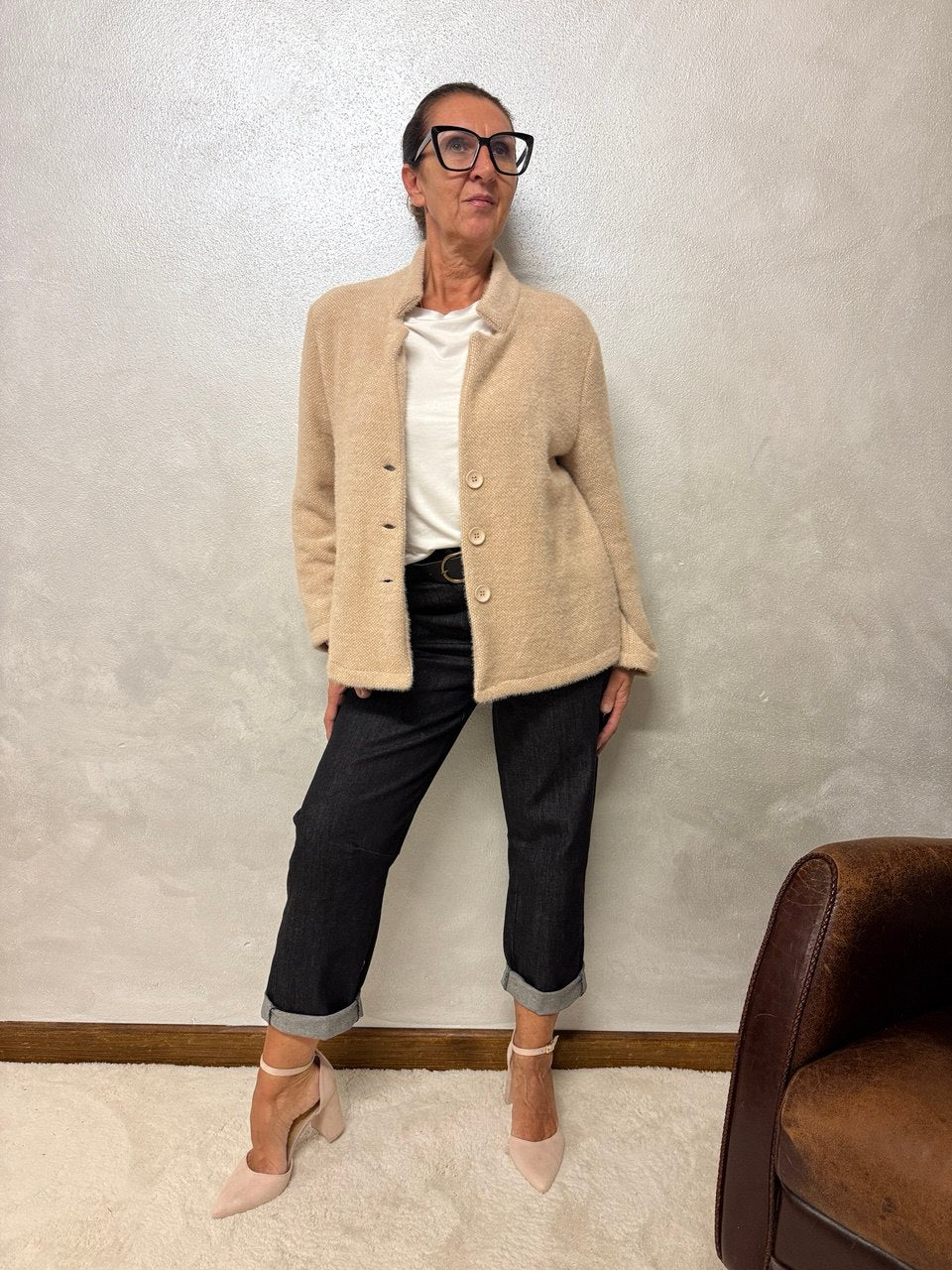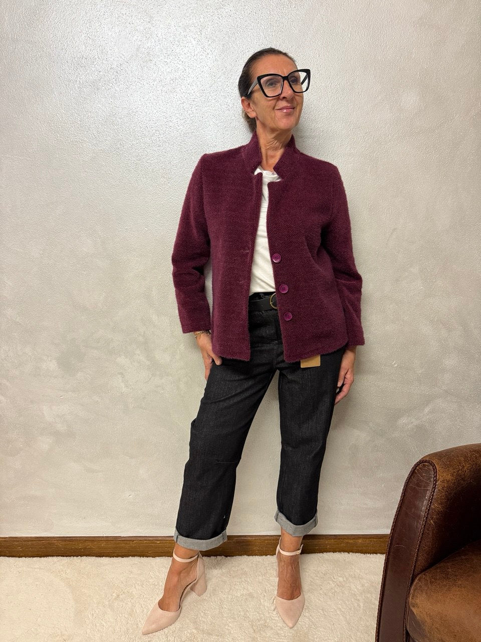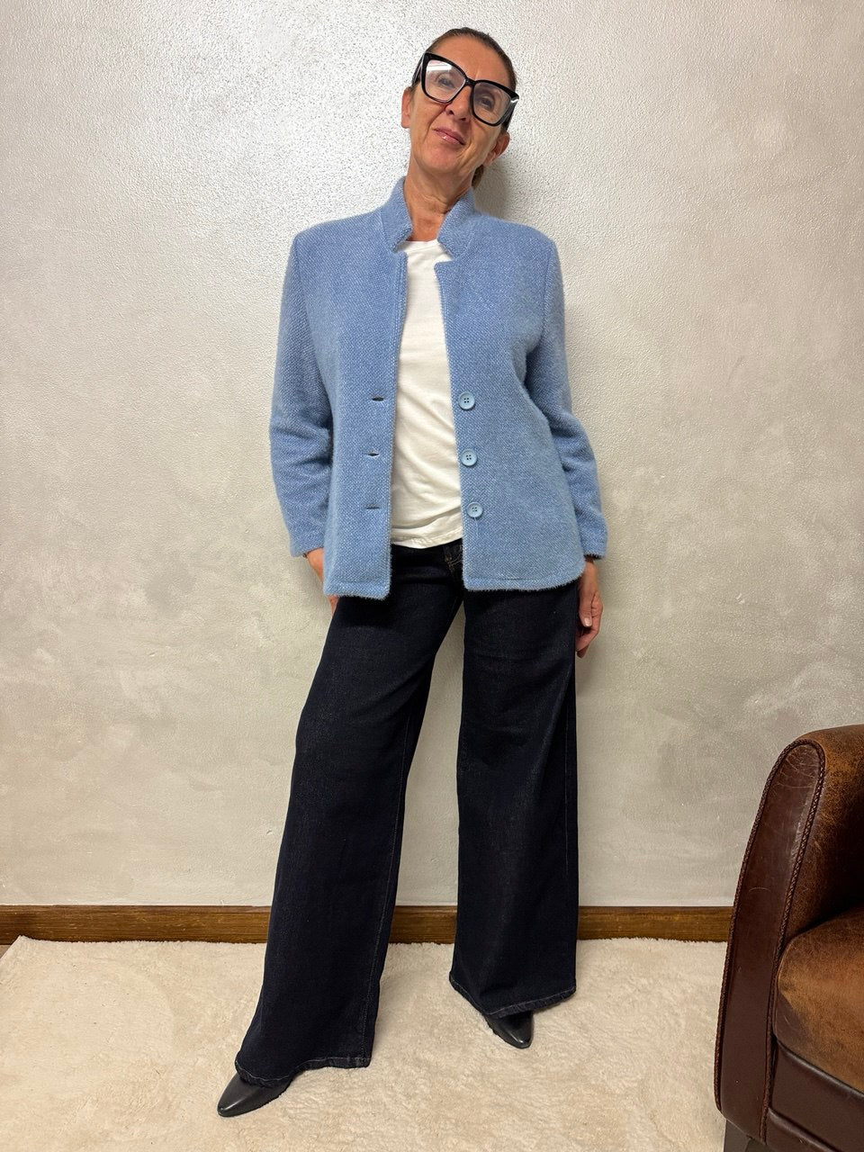 Giacca con collo sport, effetto peloso, chiusura a tre bottoni, tessuto soffice, vestibilità morbida