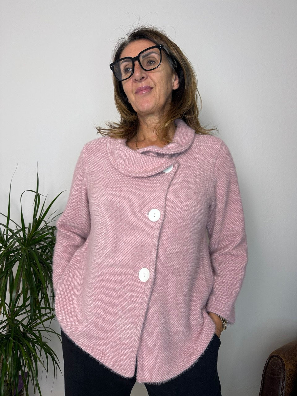 Giacca in tessuto pelosetto con collo a cilindro, chiusura a tre bottoni sbiega, priva di tasche, tessuto super soft, vestibilità leggermente morbida dalla taglia 44 alla 48