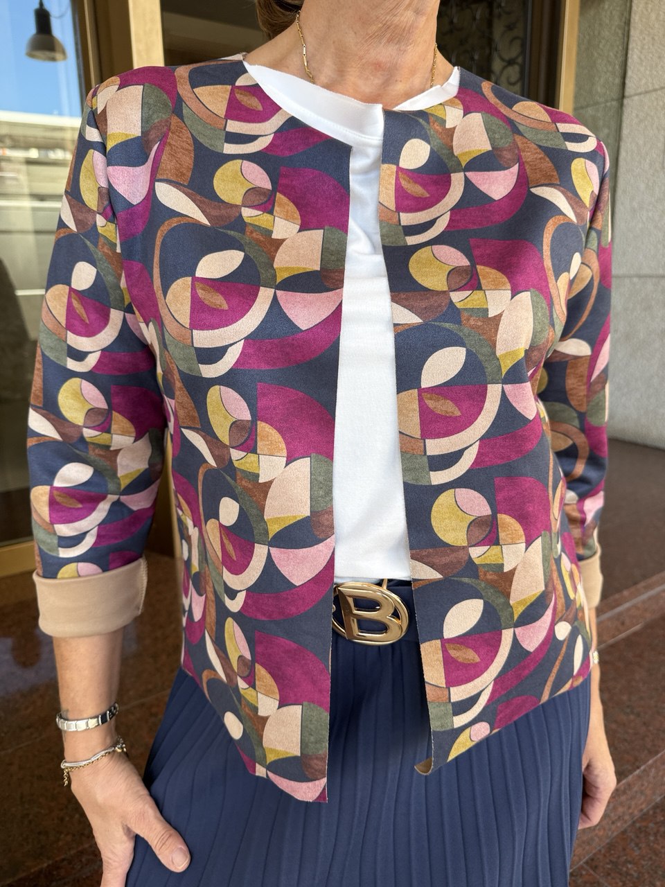 Giacchino in eco-dainetto in fantasia, orlo vivo, con tasche sul davanti, molto versatile ideale da mettere sopra ad ogni vestito, camicia e canotta/t-shirt