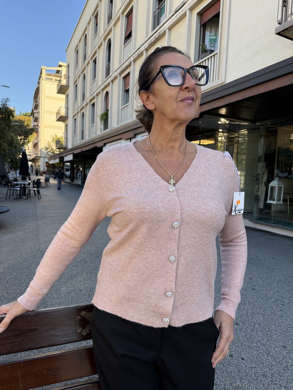 Golfino con scollo a V, chiusura a 5 bottoni gioiello, tessuto morbido ed elasticizzato, polsino alto, vestibilità dalla taglia 42 alla 46