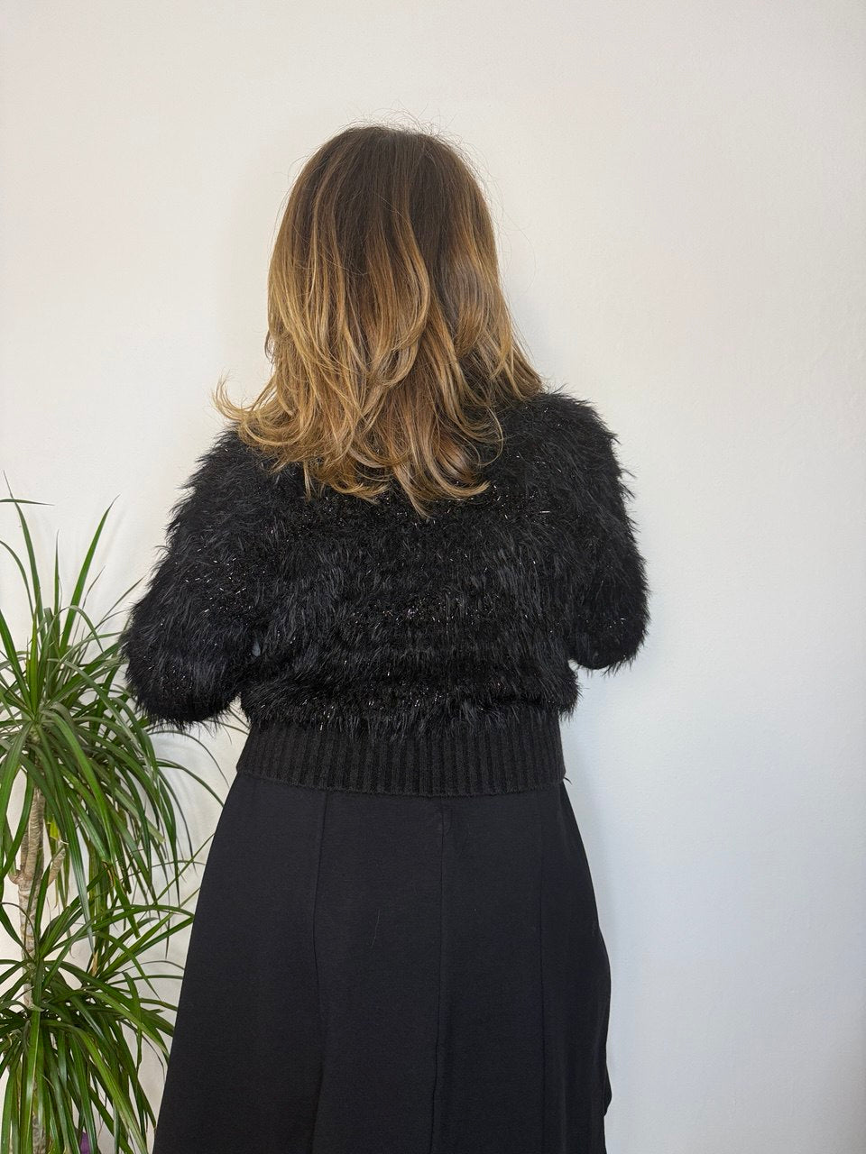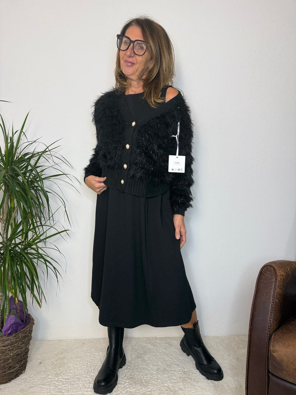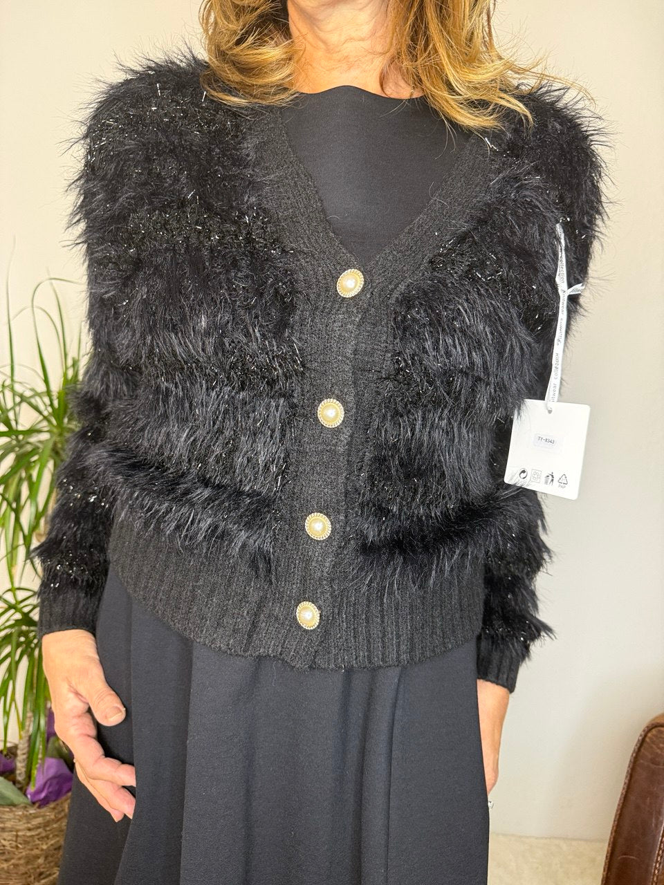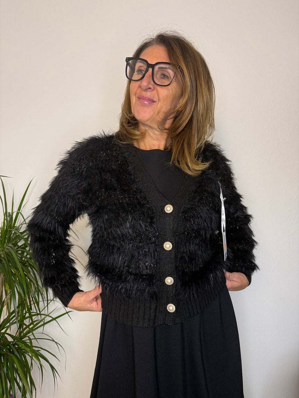 Golfino con scollatura a V, bottoni gioiello, a coste sul fondo e sui polsini, tessuto effetto piume e glitter, ideale da sopra gli abiti e non, vestibilità dalla taglia 44 alla 48 elasticizzato