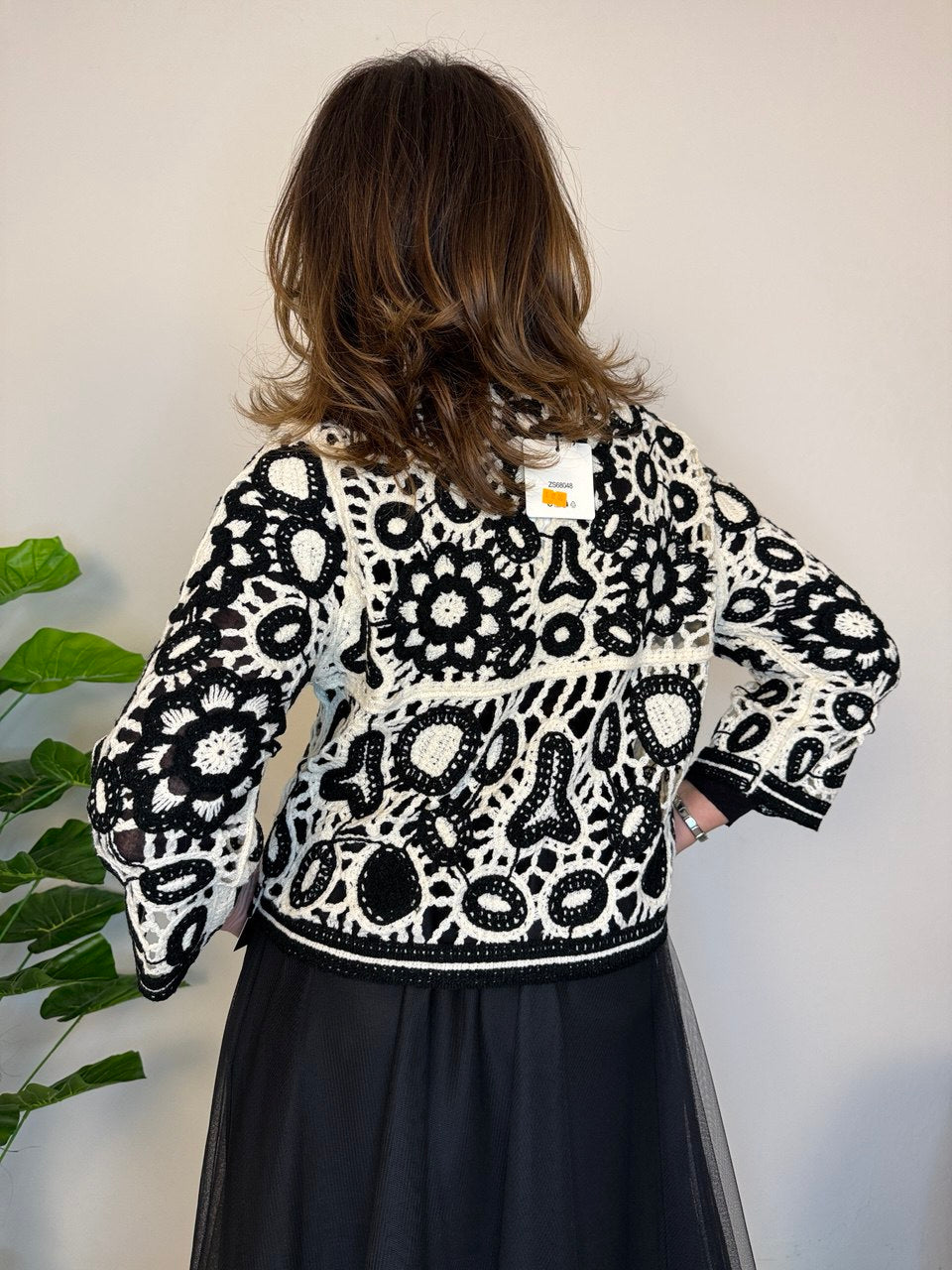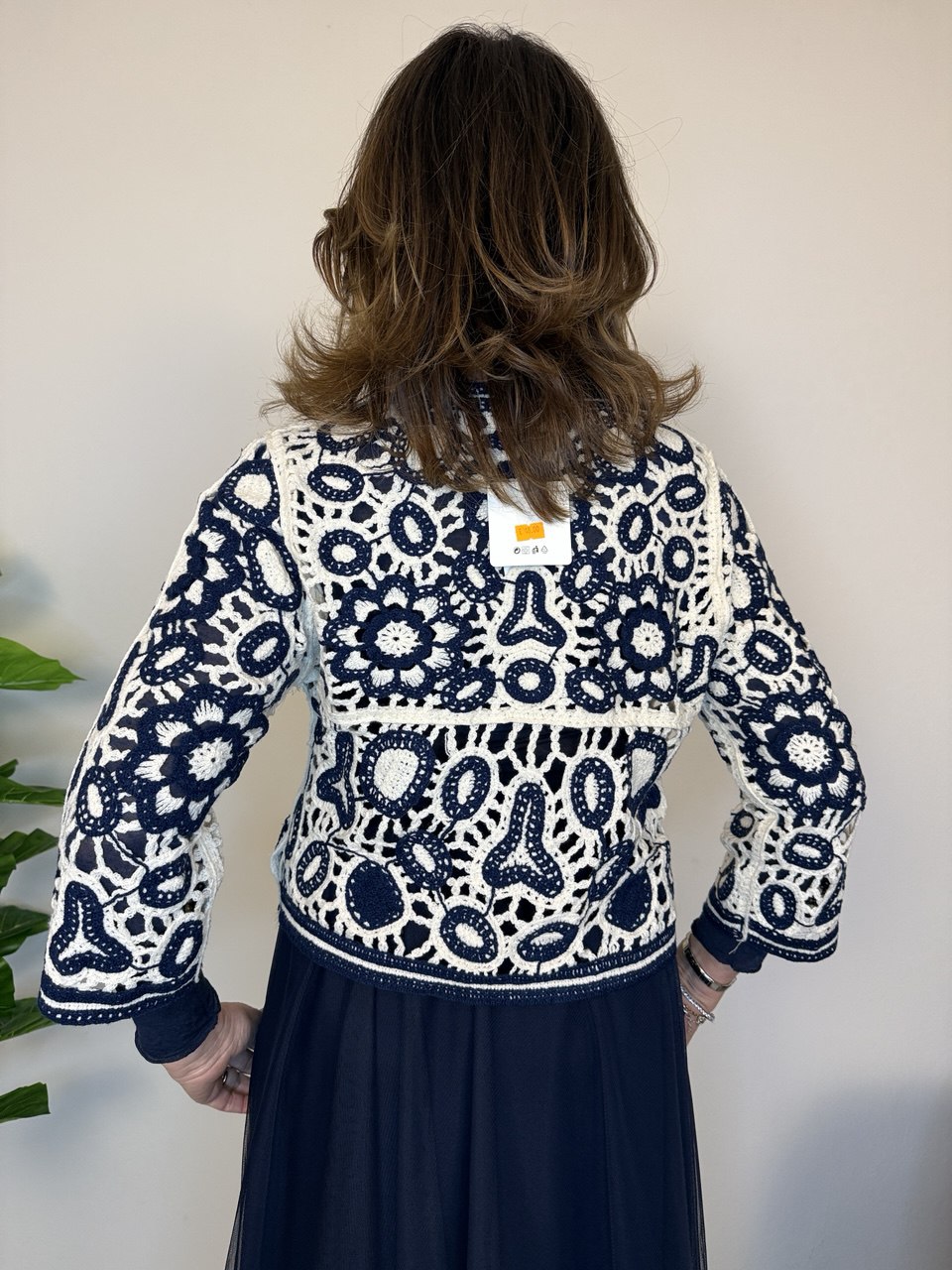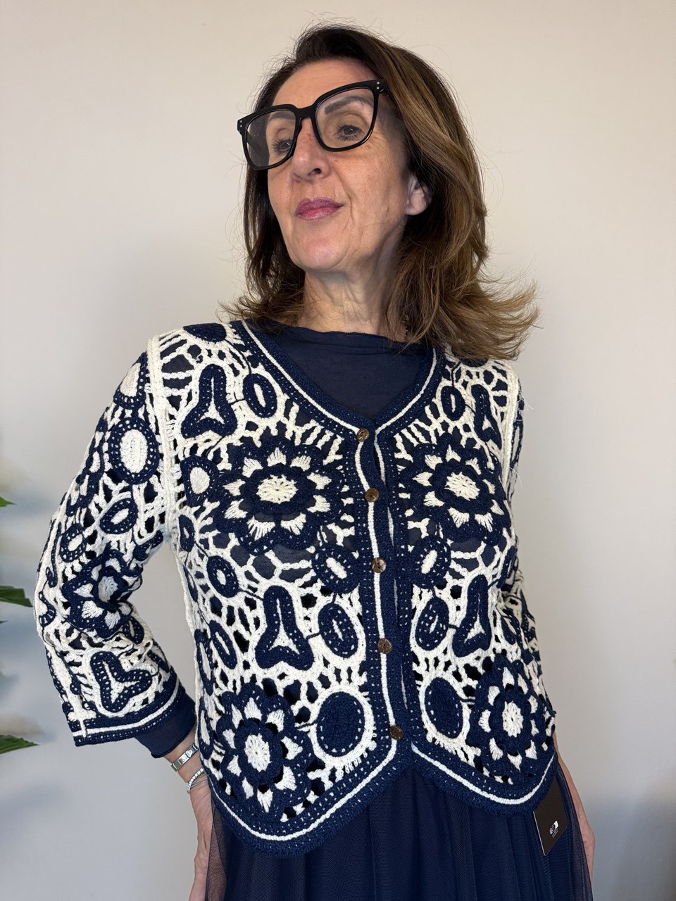Golfino con lavorazione uncinetto, chiusura a cinque bottoni, arrotondato sul fondo, manica a 3/4, vestibilità dalla taglia 42 alla 46 abbondante