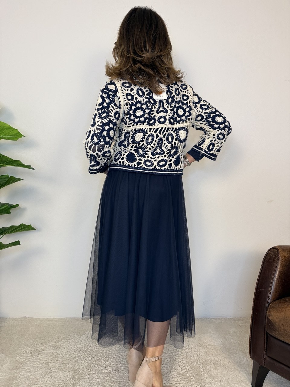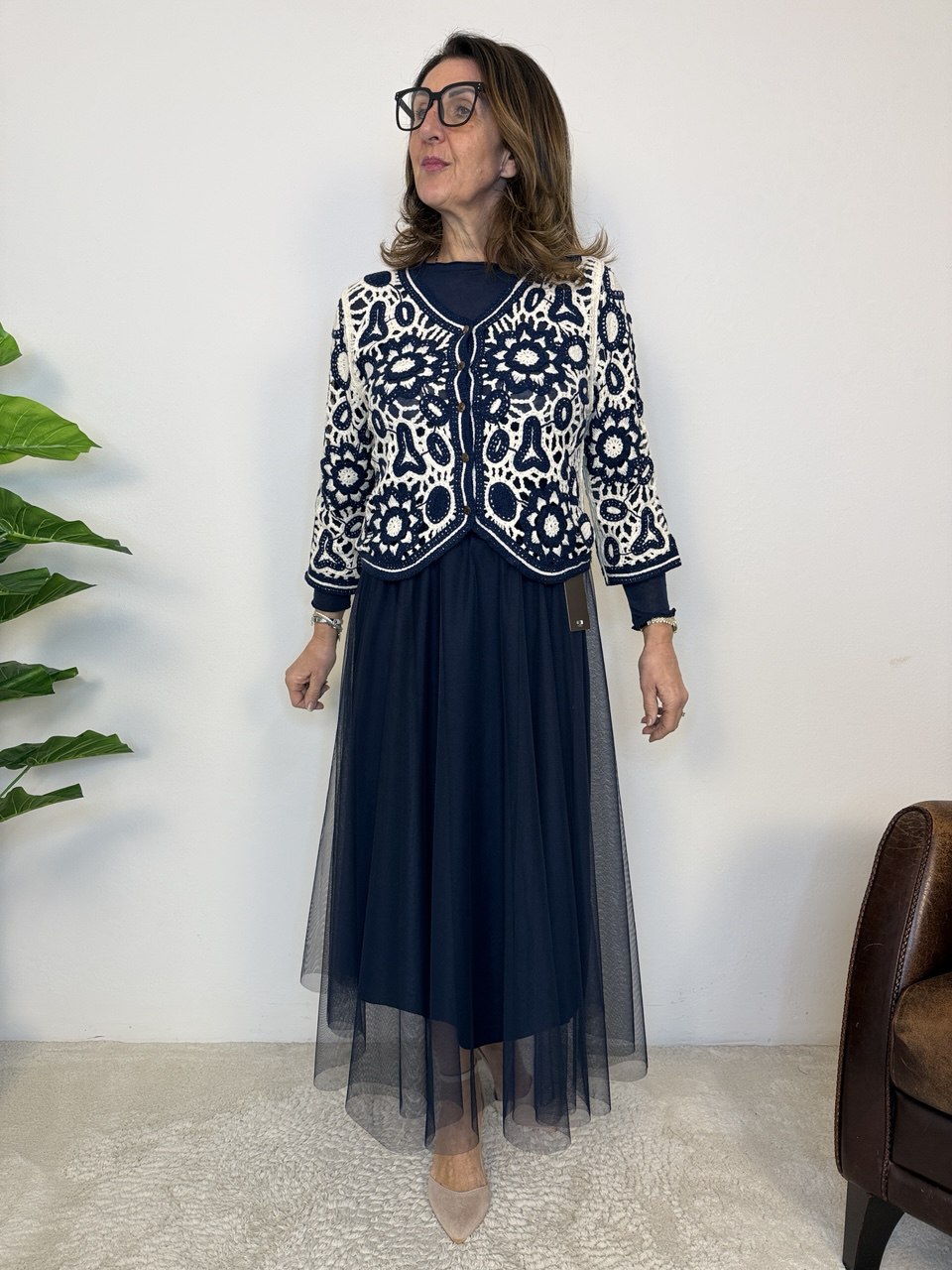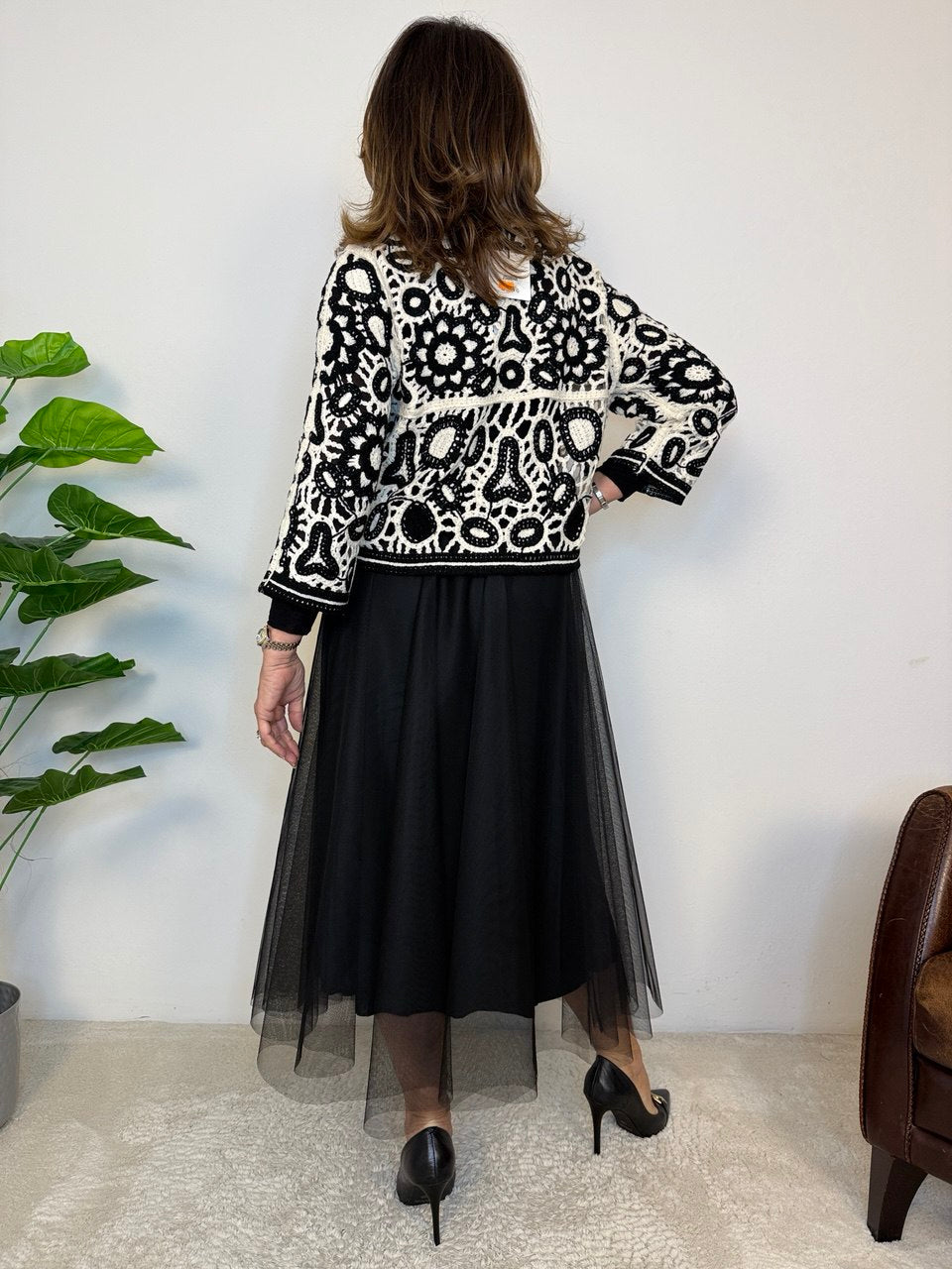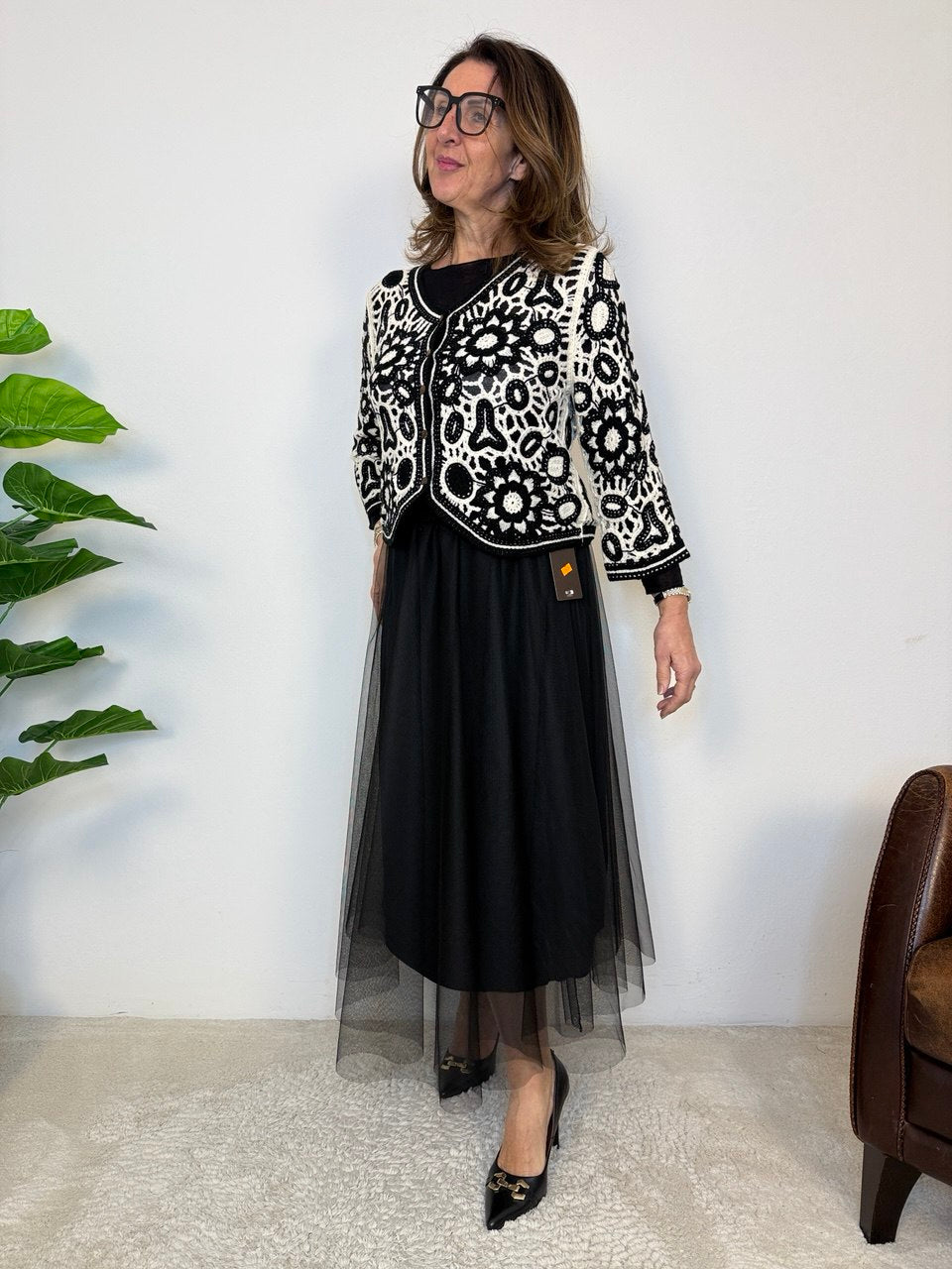 Golfino con lavorazione uncinetto, chiusura a cinque bottoni, arrotondato sul fondo, manica a 3/4, vestibilità dalla taglia 42 alla 46 abbondante