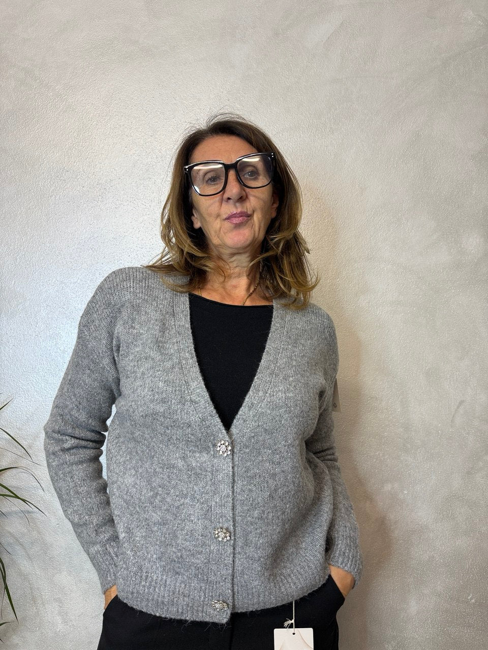 Golfino con scollatura a V; bottini gioiello, spalla che scende, taglio a scatoletta, vestibilità morbida