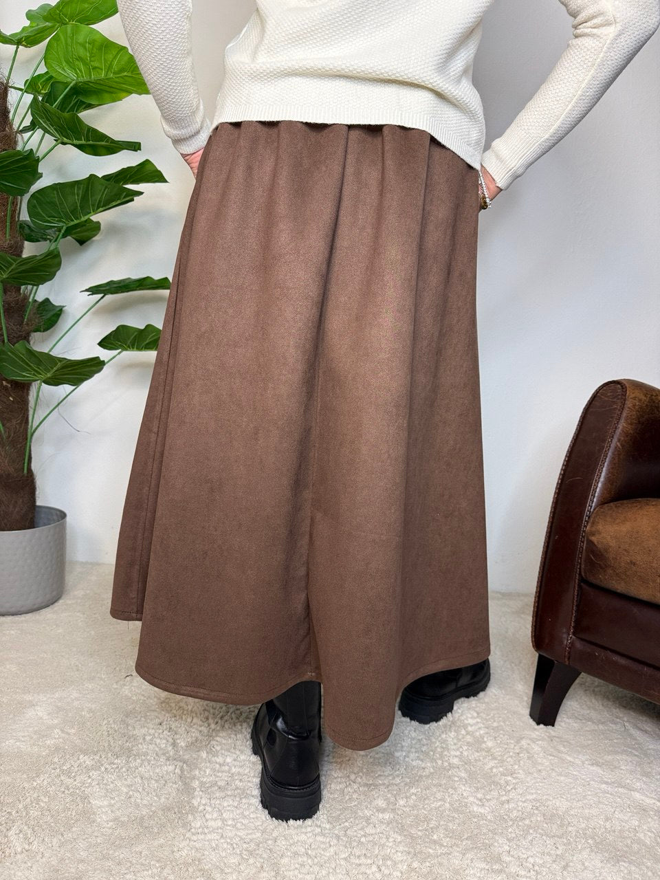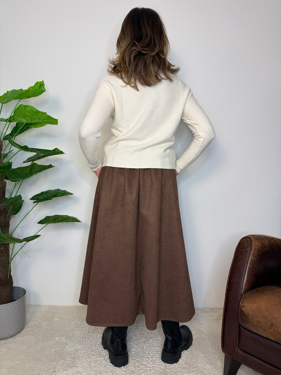 Gonna in tessuto eco camoscio, baschina sul davanti ed elastico sul retro, passanti per la cintura e cintura compresa, 5 pinces sul davanti, tasche a filo, vestibilità dalla taglia 46 alla 50